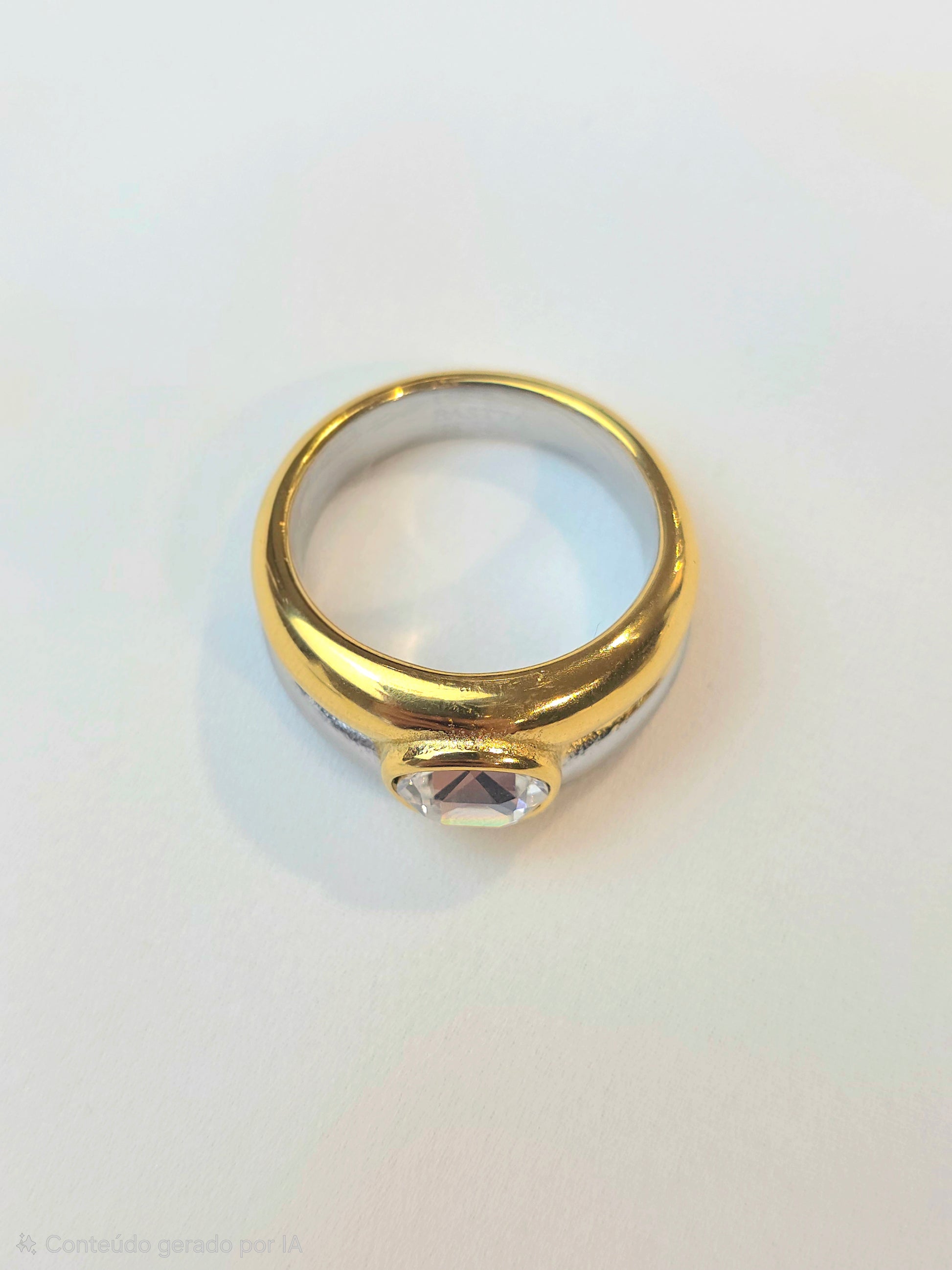 Anel Bastta em aço inoxidável, com acabamento bicolor em dourado e prateado e pedra brilhante ao centro, pensado para dar um ponto de luz discreto à mão. A combinação dos dois tons torna-o especialmente versátil para conjugar com outras peças de joalharia, sejam douradas ou prateadas, mantendo um resultado coerente. Use-o sozinho para um detalhe elegante ou em conjunto com anéis mais finos para um look contemporâneo.