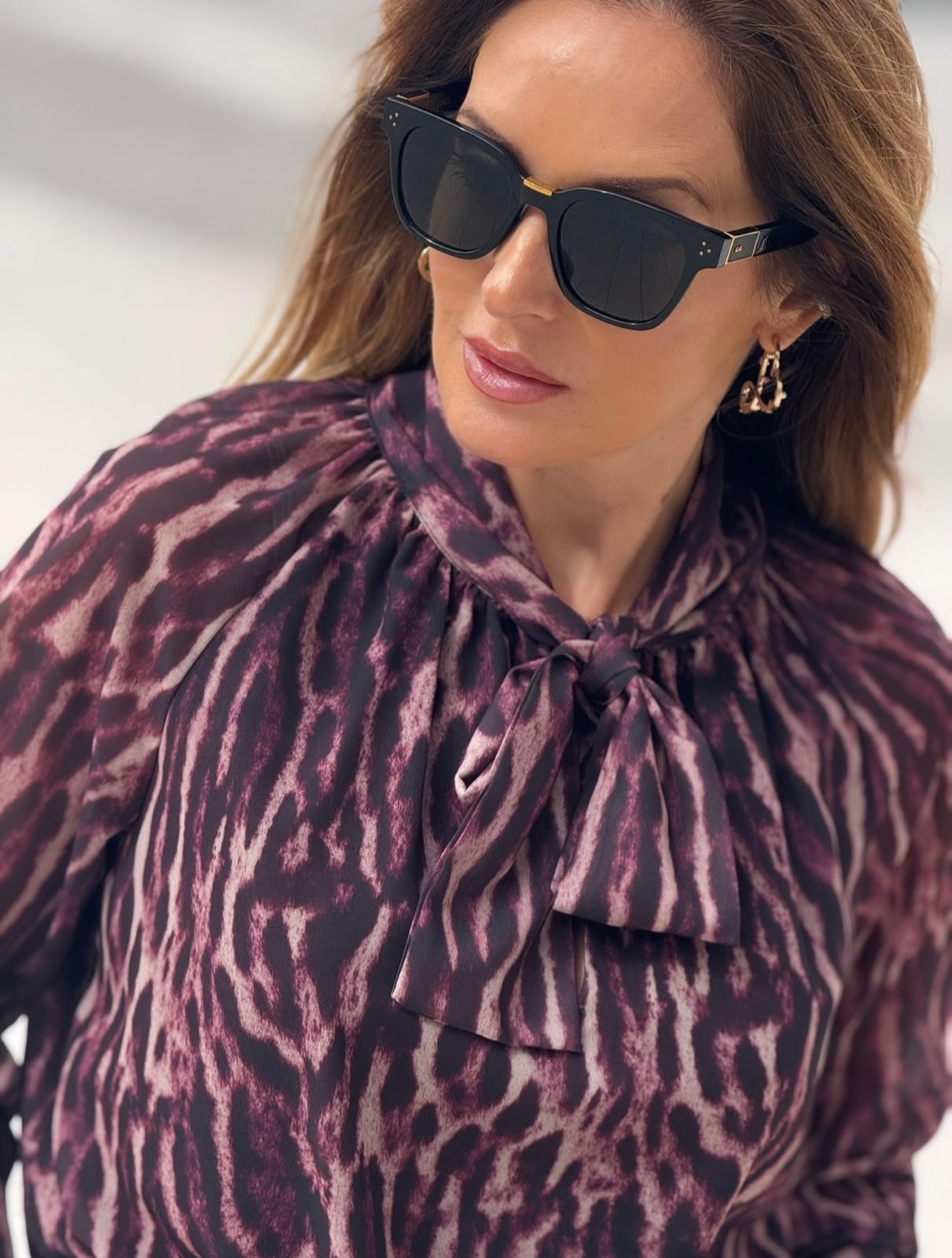 Blusa Vero Moda com estampado animal print, de manga comprida e decote com laçada, que adiciona um detalhe feminino e elegante ao look. Os punhos com elástico garantem conforto e ajustam a silhueta. Uma peça versátil, perfeita para coordenados casuais ou mais sofisticados.
