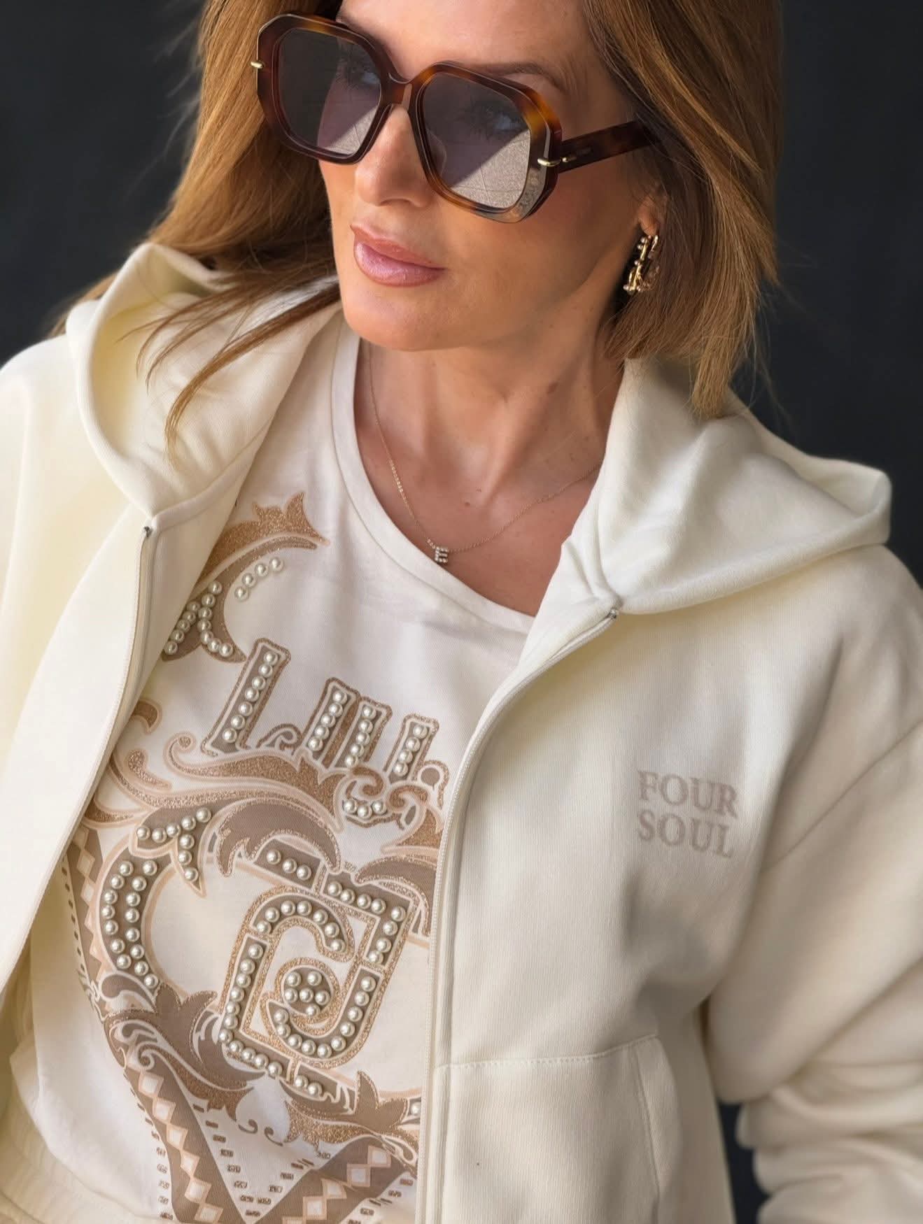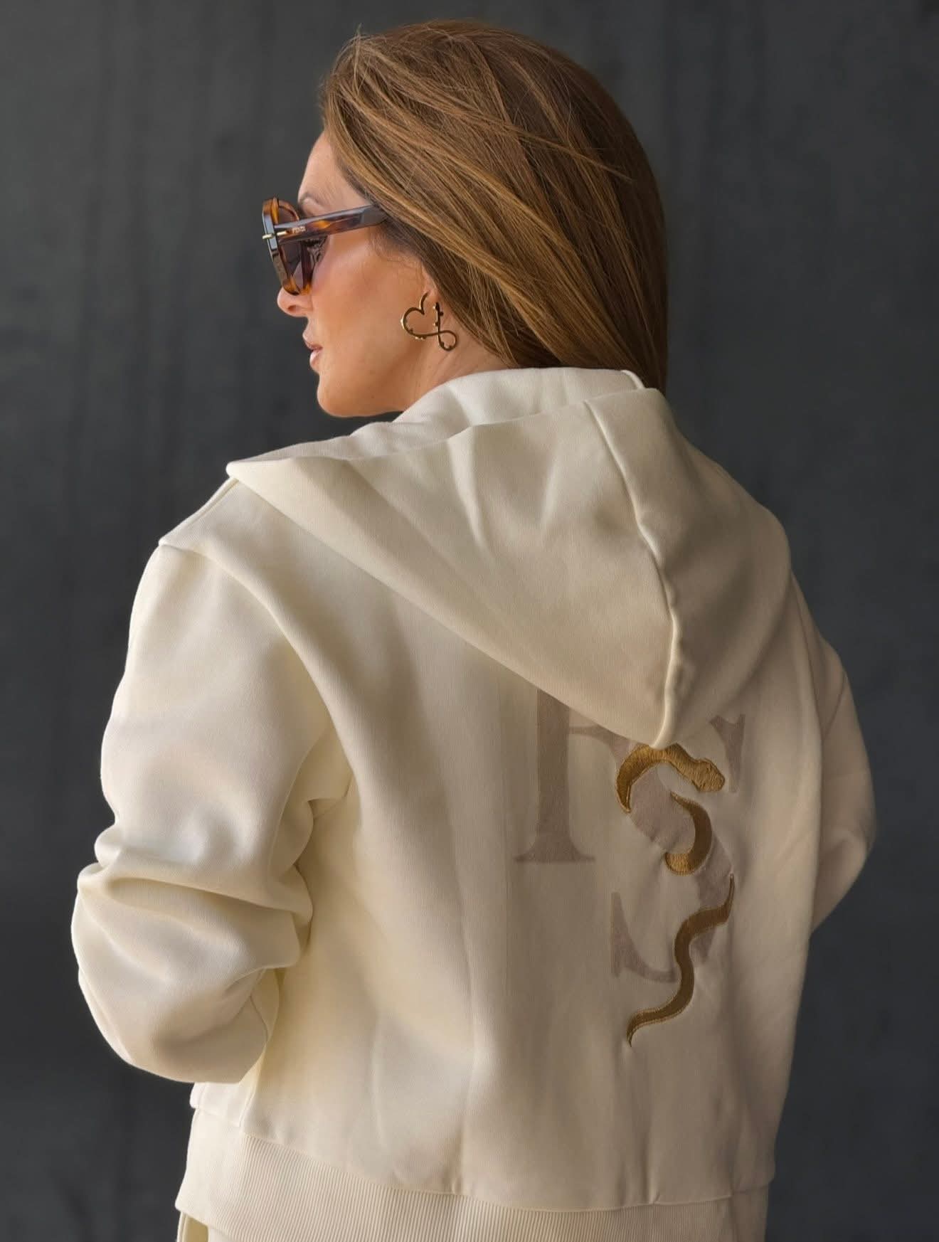 Bomber de fato de treino Foursoul, com fecho frontal em zíper e capuz prático. O destaque fica no estampado bordado com as iniciais da marca nas costas, que acrescenta estilo e identidade ao design. Pode ser combinado com as calças no mesmo tom para um conjunto coordenado, perfeito para looks casuais e confortáveis.