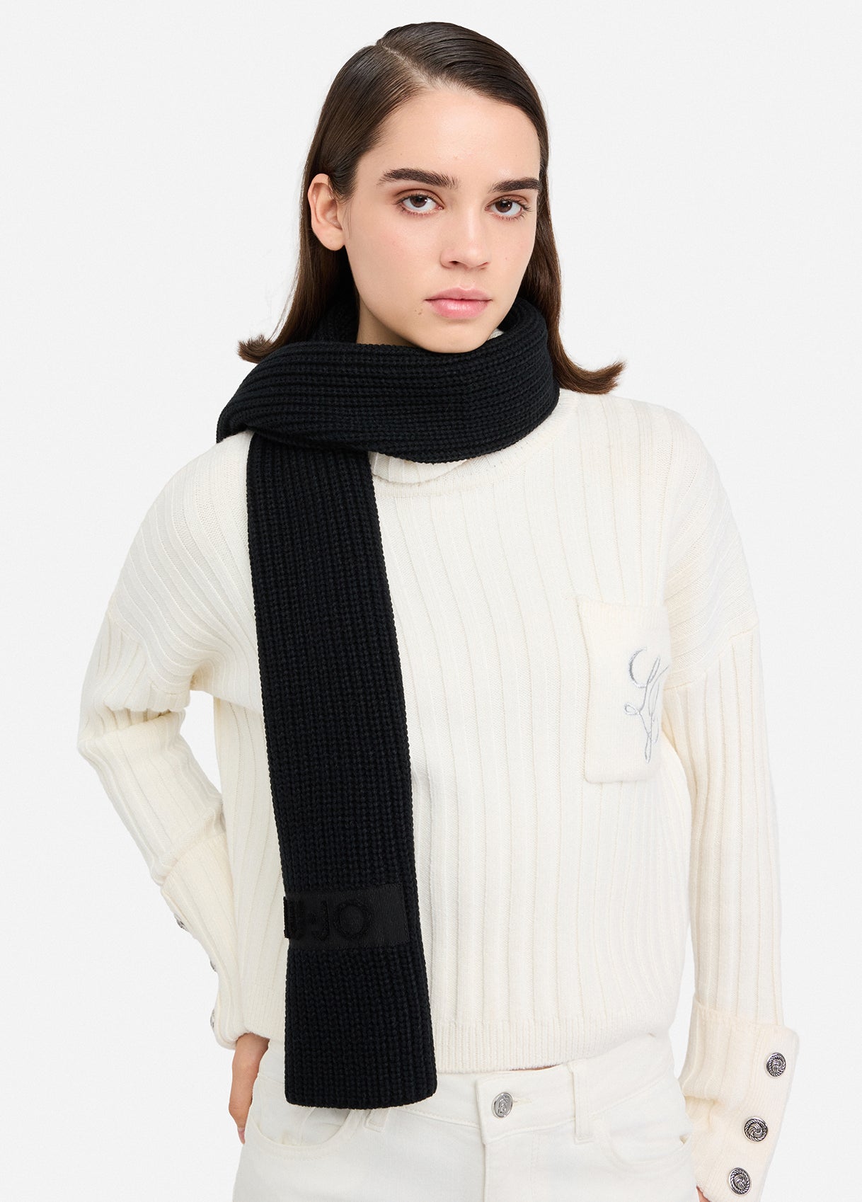 Cachecol Liu Jo em malha tricotada macia, ideal para os dias frios. Apresenta uma etiqueta grande com o logotipo da marca, adicionando um toque moderno e distintivo. Combina conforto e estilo, perfeito para complementar looks de inverno com elegância.