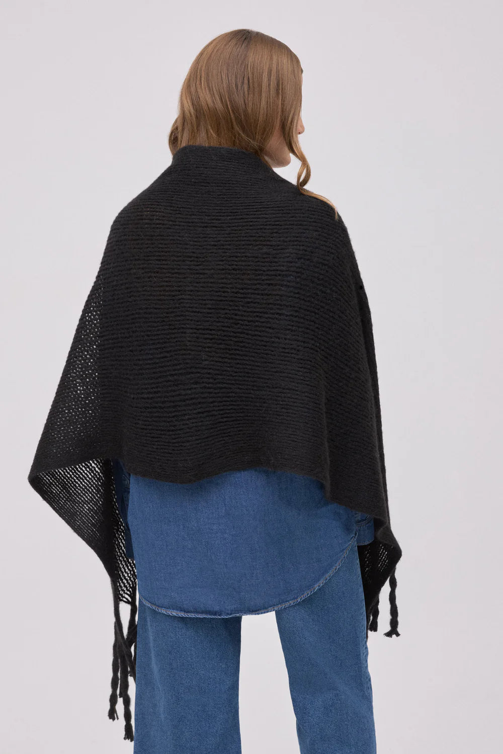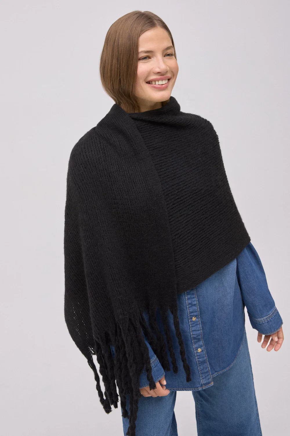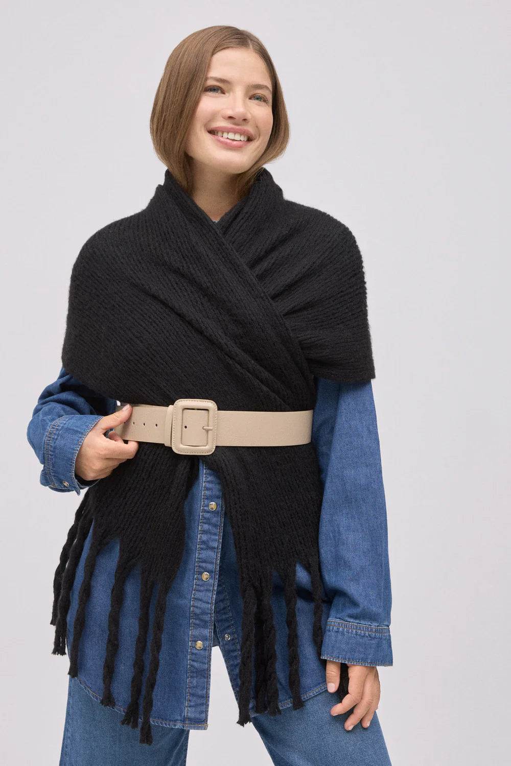 Cachecol Ysabel Mora em malha aberta, estilo pashmina, com textura macia e aconchegante. O design liso e o acabamento em franjas conferem um toque de elegância e versatilidade, ideal para complementar looks casuais ou sofisticados nos dias frios.