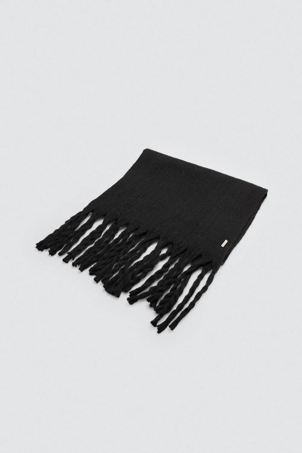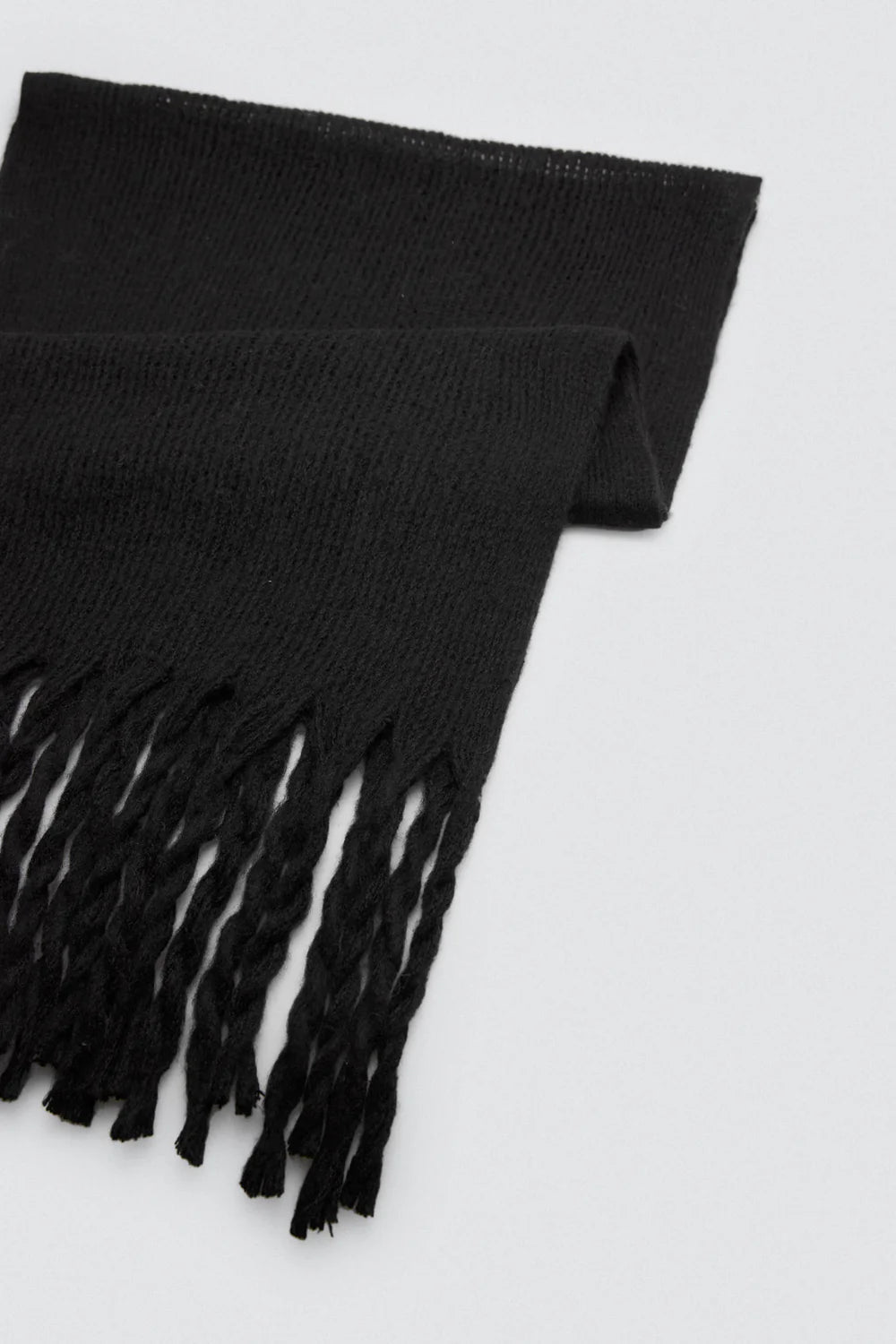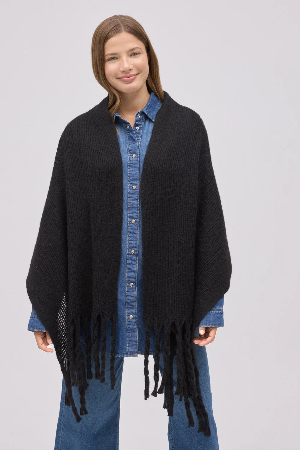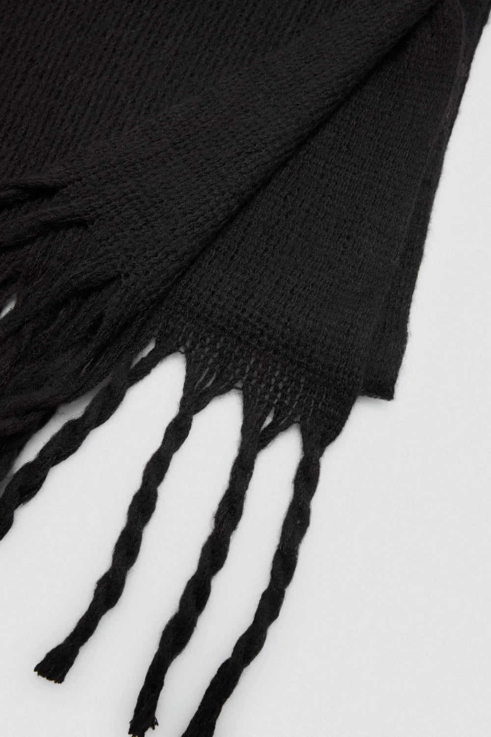 Cachecol Ysabel Mora em malha aberta, estilo pashmina, com textura macia e aconchegante. O design liso e o acabamento em franjas conferem um toque de elegância e versatilidade, ideal para complementar looks casuais ou sofisticados nos dias frios.