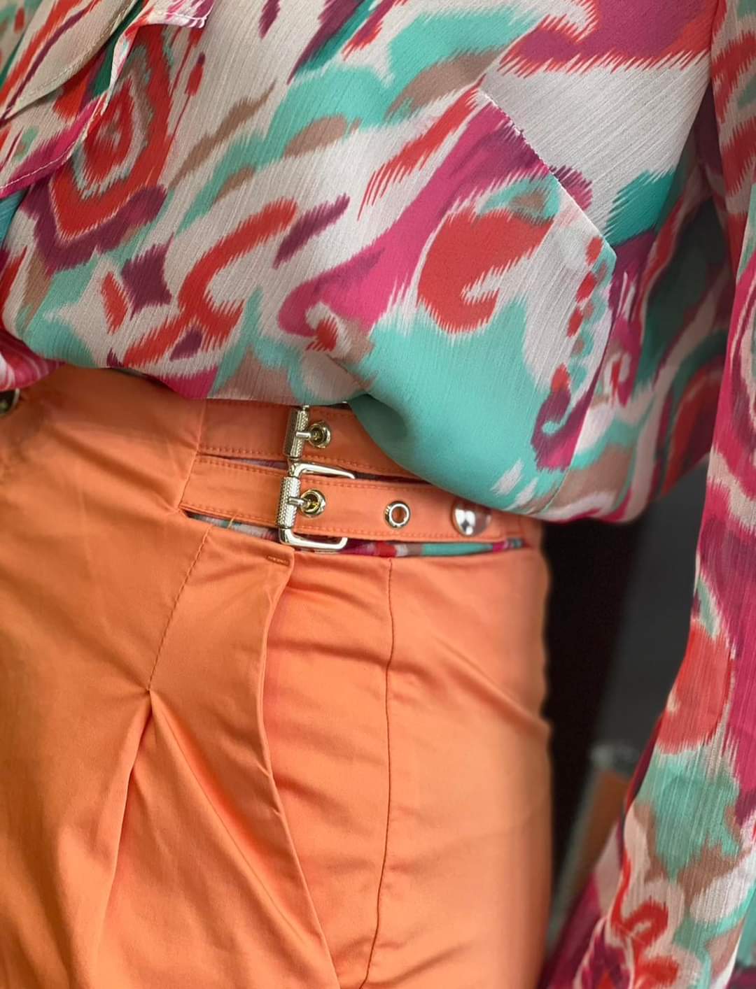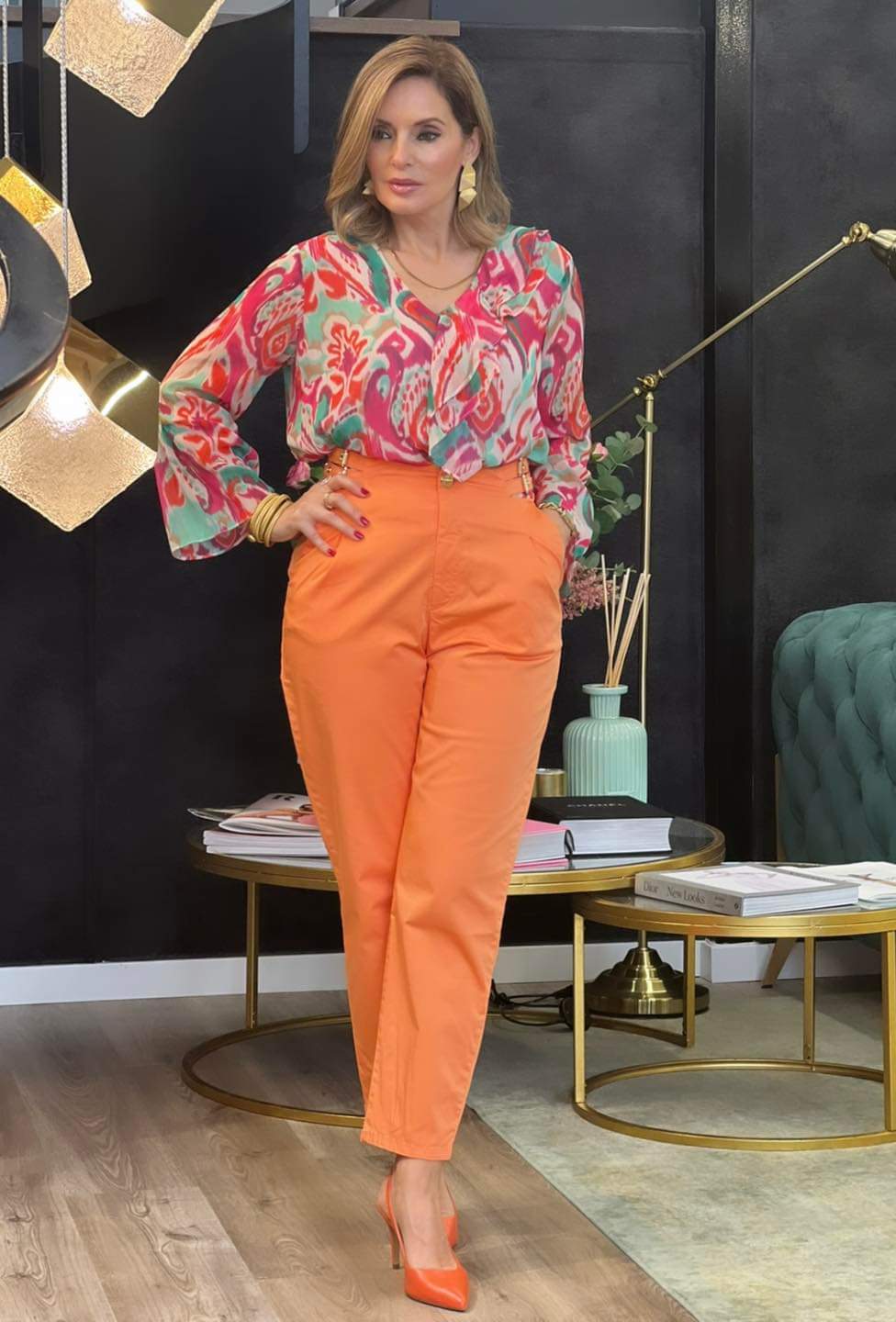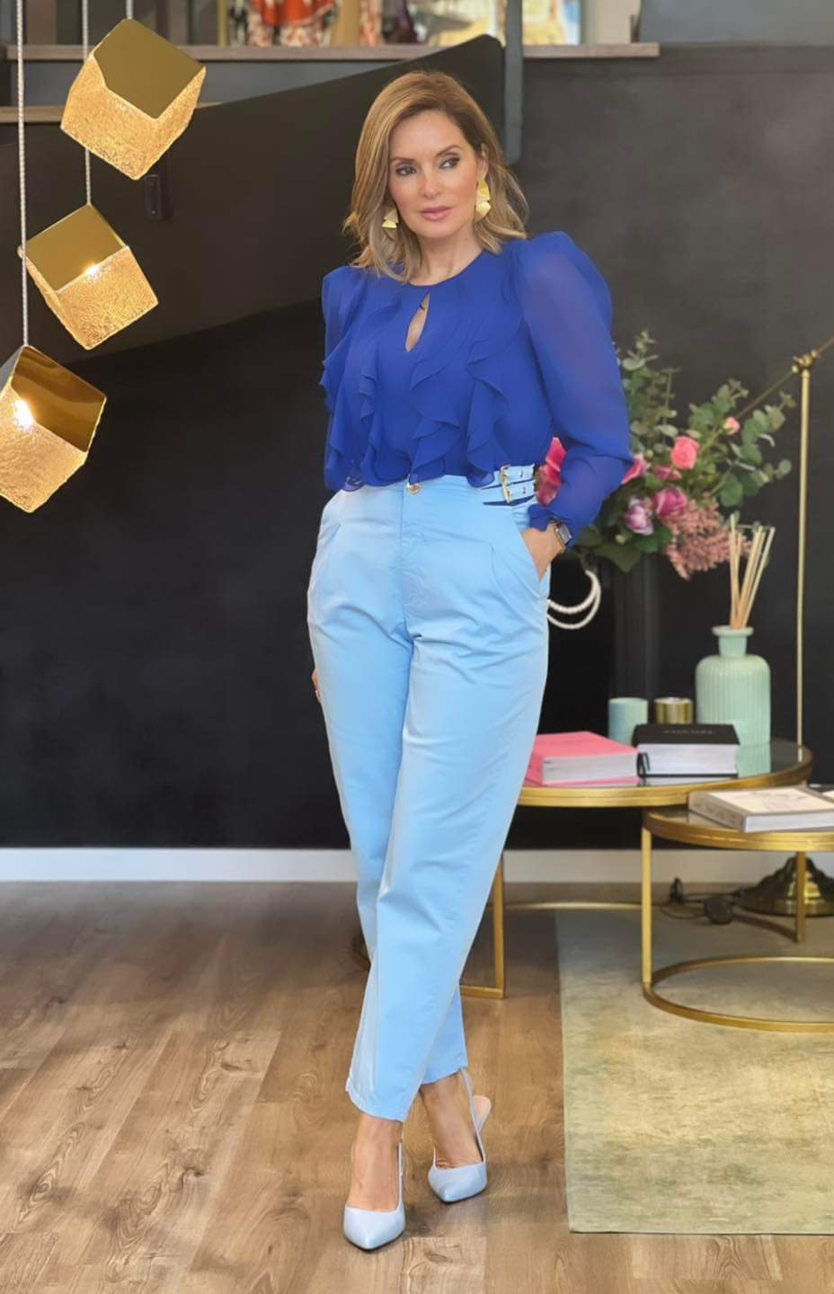 Calças tipo slouchy com aberturas nas laterais com fivelas.