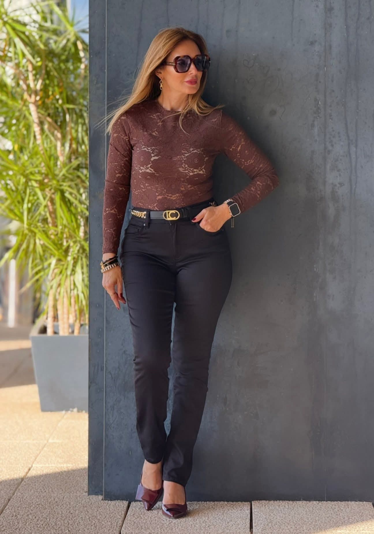 As calças Bigzone em sarja preta combinam estilo moderno e conforto. Com corte slim e cintura subida, apresentam fecho de botão e zíper, oferecendo um ajuste perfeito e elegante. Ainda tem aplicado strass nos bolsos de trás Uma peça versátil, ideal para looks casuais ou coordenados mais formais.