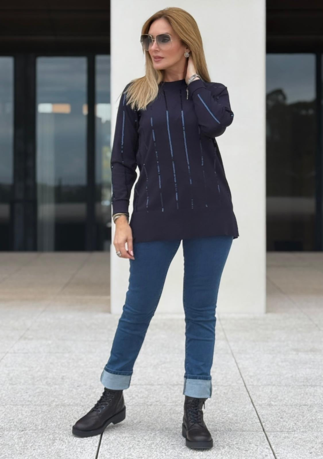 Calças de ganga Bigzone com corte slim e cintura subida, que realçam a silhueta de forma elegante e confortável. Possuem bolsos frontais e traseiros, estes com pormenores de strass brilhante que acrescentam um toque sofisticado e feminino. Fecho de botão e zíper. Um essencial versátil para looks casuais ou mais arranjados.