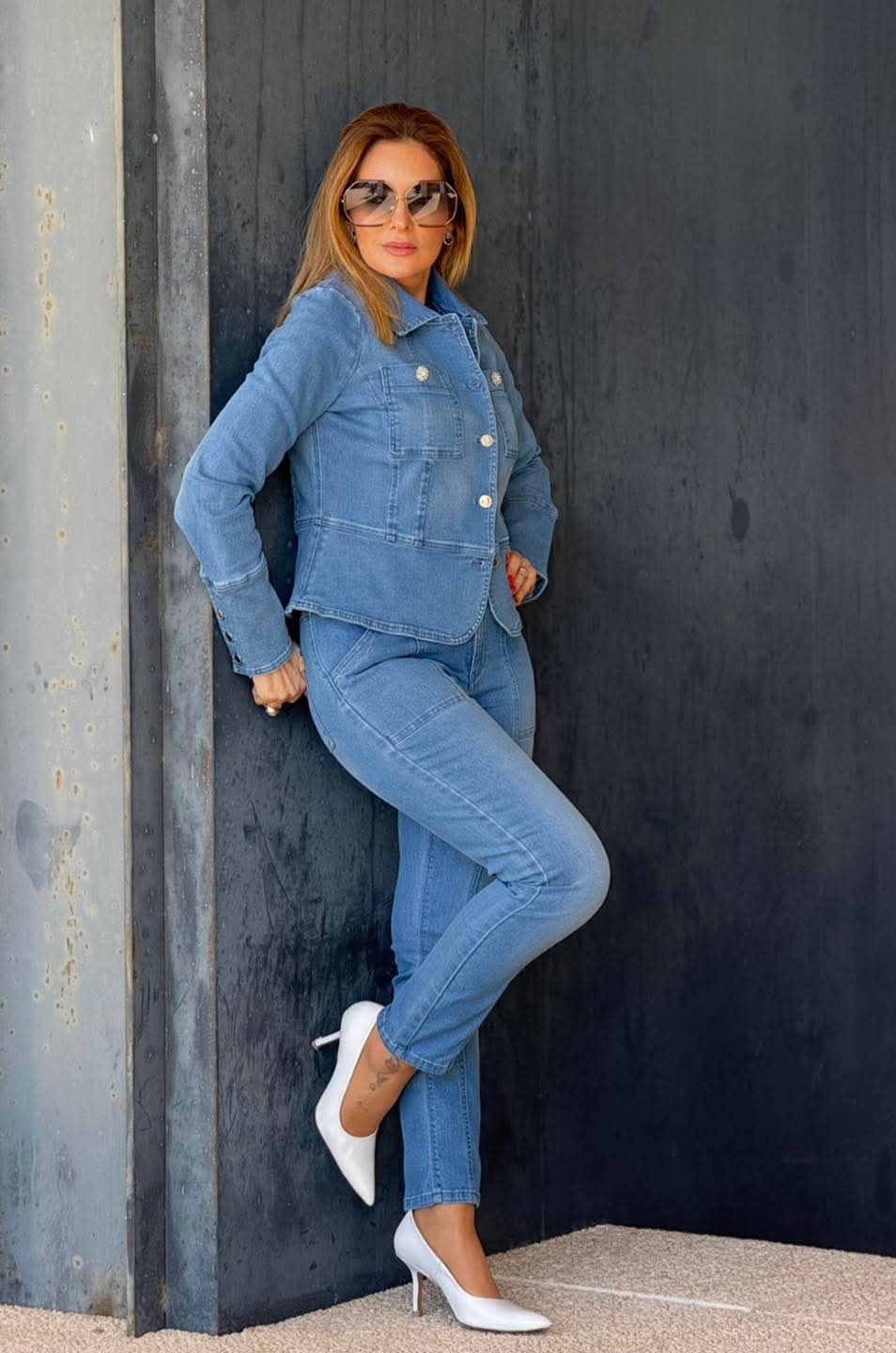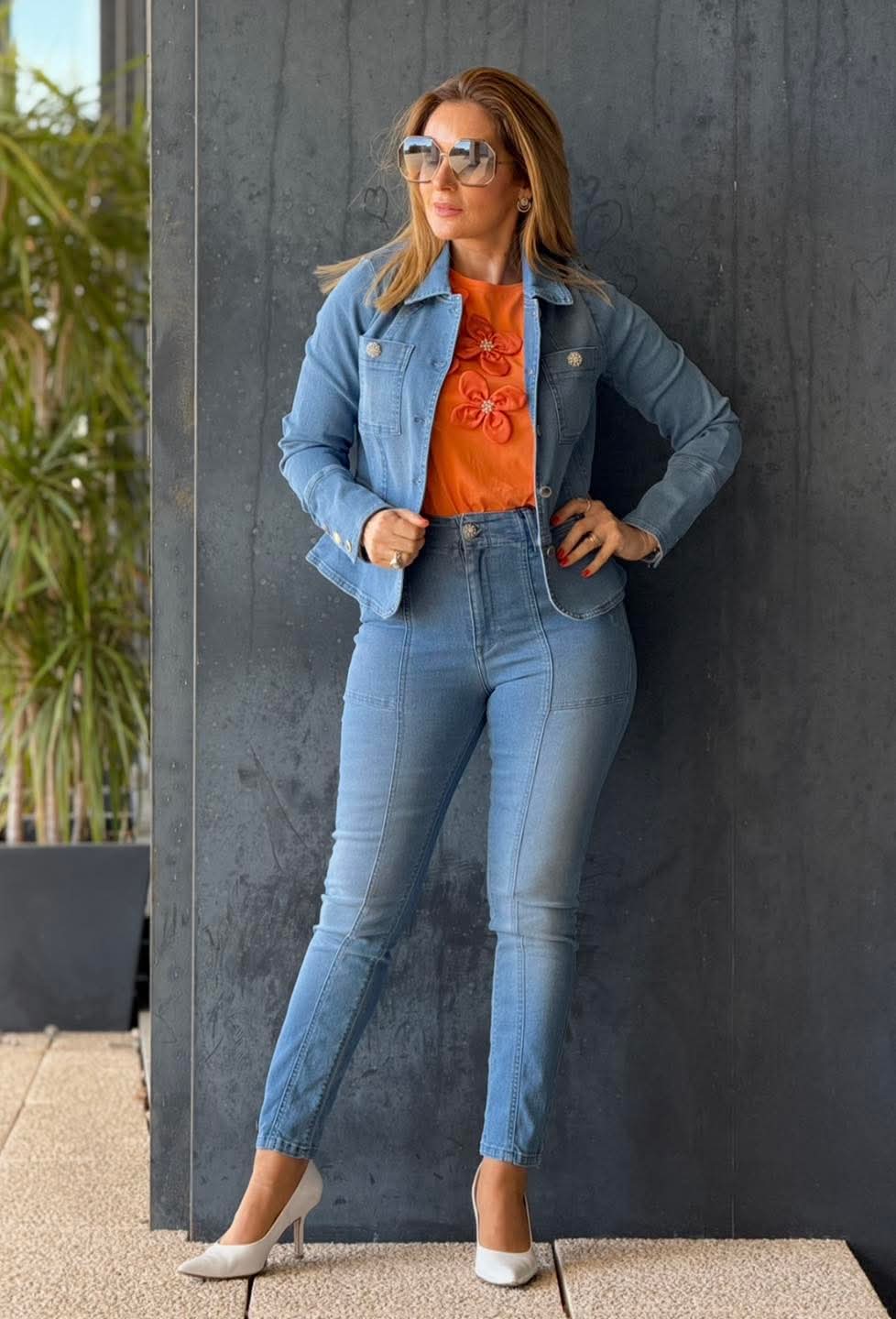 Calças de ganga básicas, cintura subida com pormenor de costura, fecho em zíper e botão.