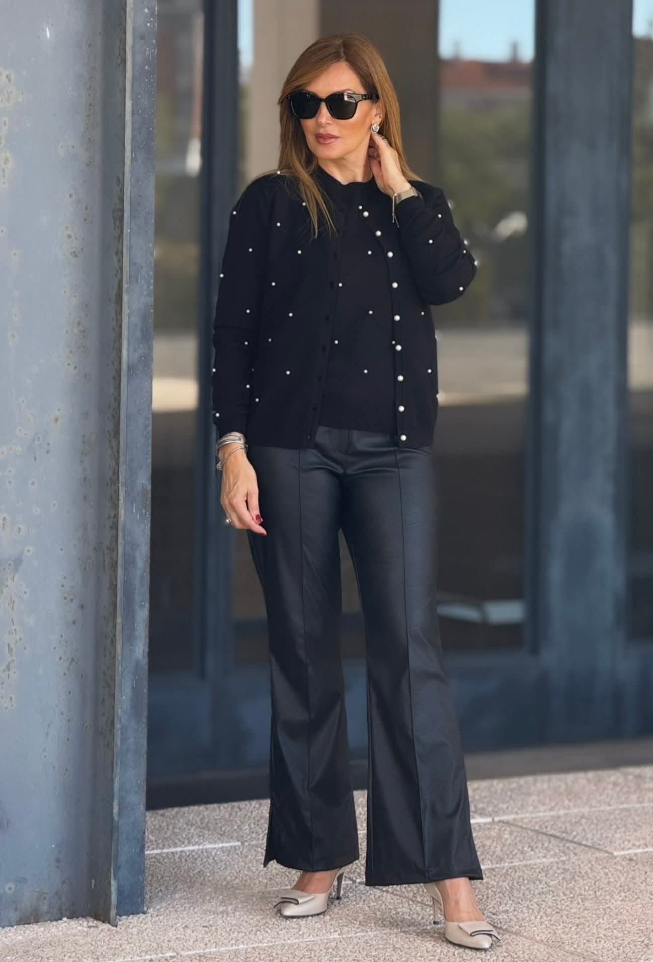 Calças à boca de sino Fé em ecopele com nervura vertical, que proporciona um efeito alongador e sofisticado. Modelo com fecho de botão e zíper frontal, sem bolsos, ideal para criar coordenados elegantes e modernos, perfeitas para looks urbanos ou casuais-chic.