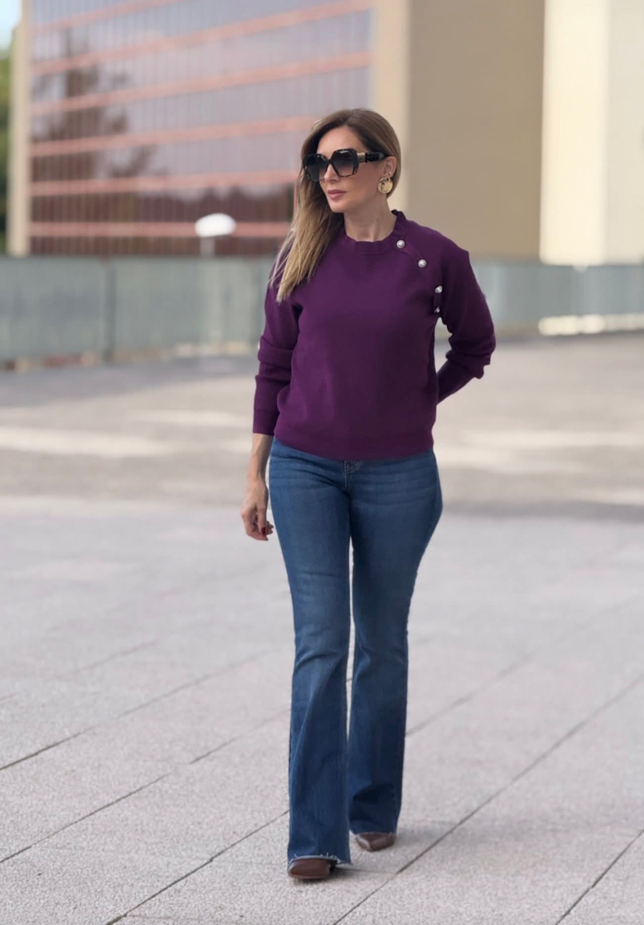 Calça de ganga Foursoul com corte à boca de sino e lavagem escura, oferecendo um visual clássico e elegante. Apresenta cintura subida, fecho frontal de botão e zíper, além de detalhe desfiado na bainha que acrescenta um toque moderno e descontraído. Ideal para criar looks casuais ou sofisticados, combinando com blusas ou camisolas.
