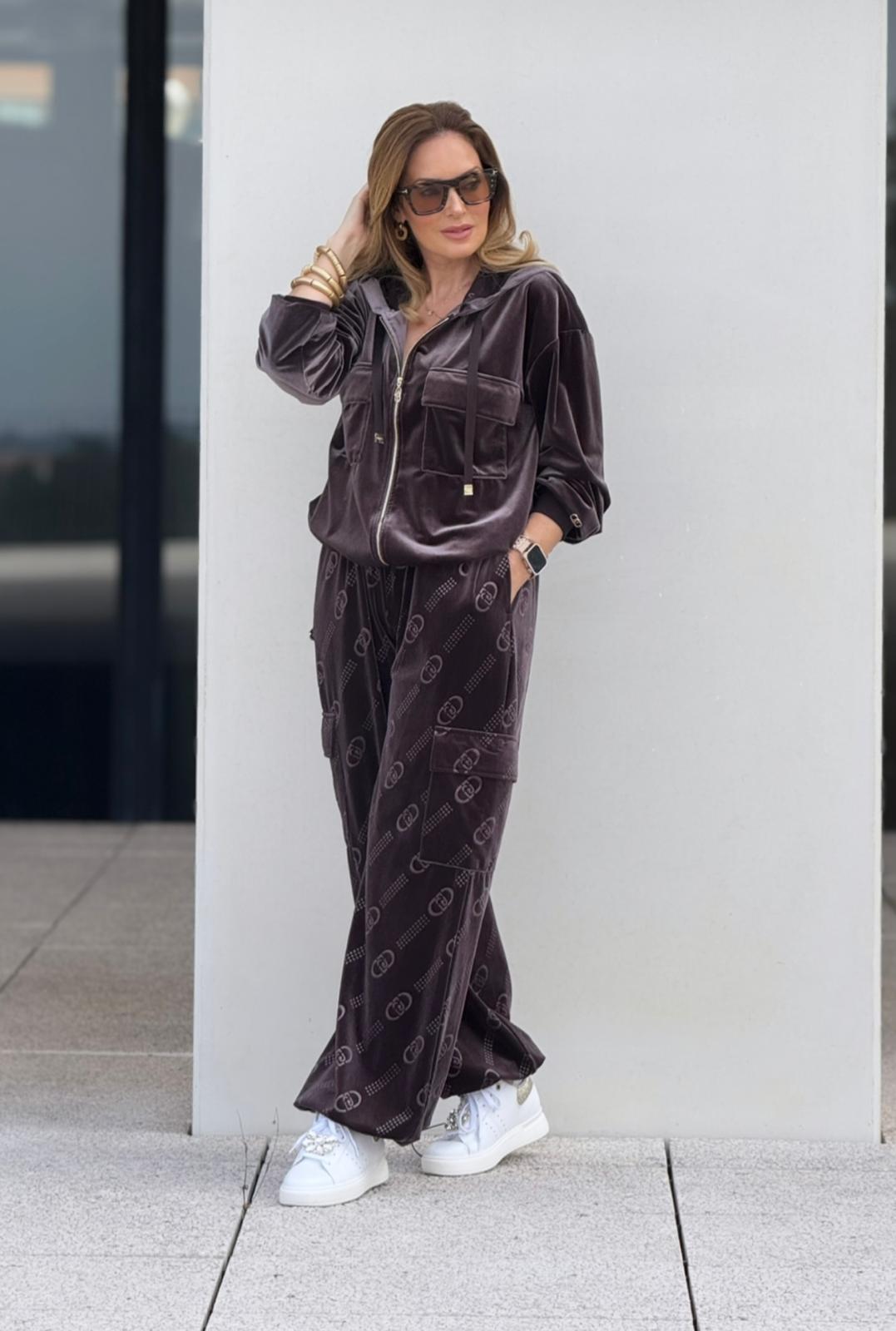 Calça de fato de treino Liu Jo em chenille macia, com cós elástico para conforto e ajuste perfeito. Apresenta bolsos cargo e laterais funcionais, logotipo metálico delicado e punhos elásticos nos tornozelos com cordão para um toque desportivo e moderno.