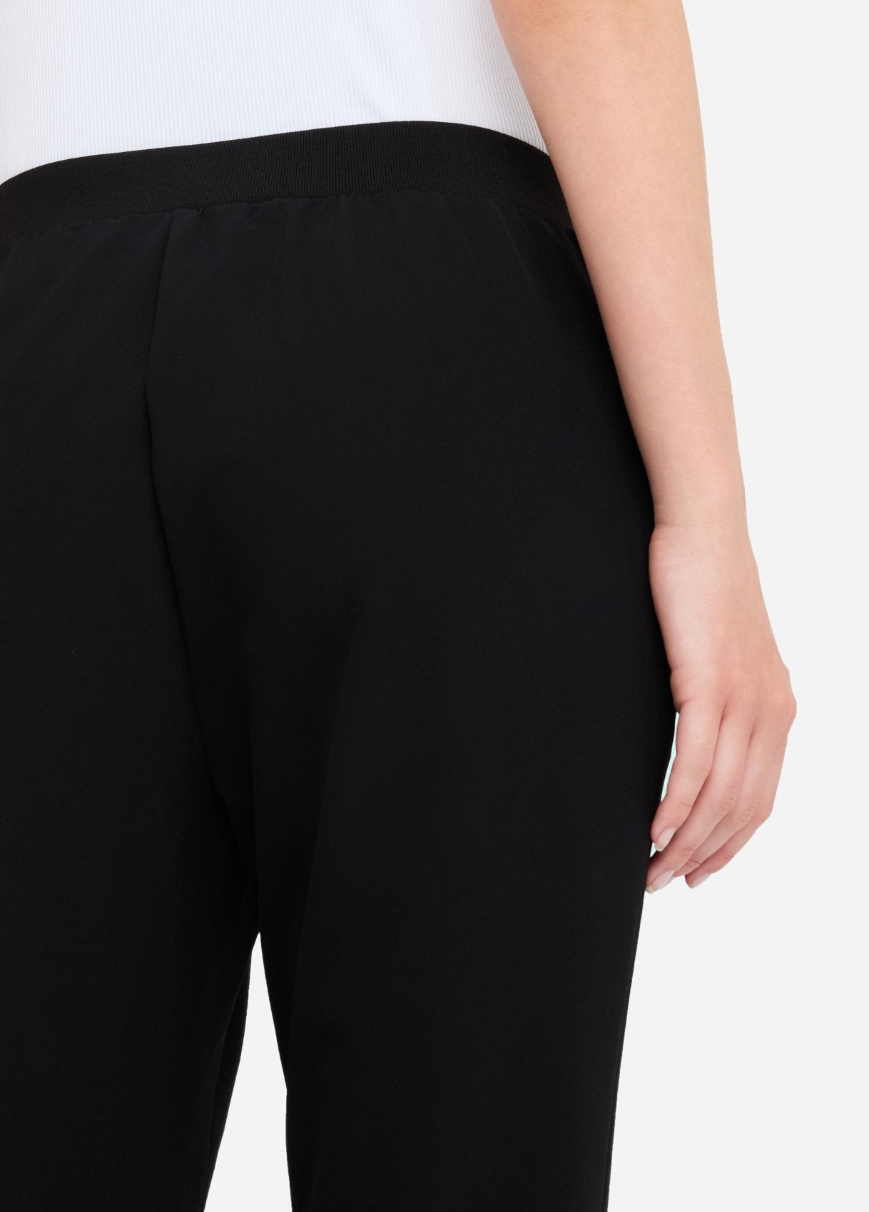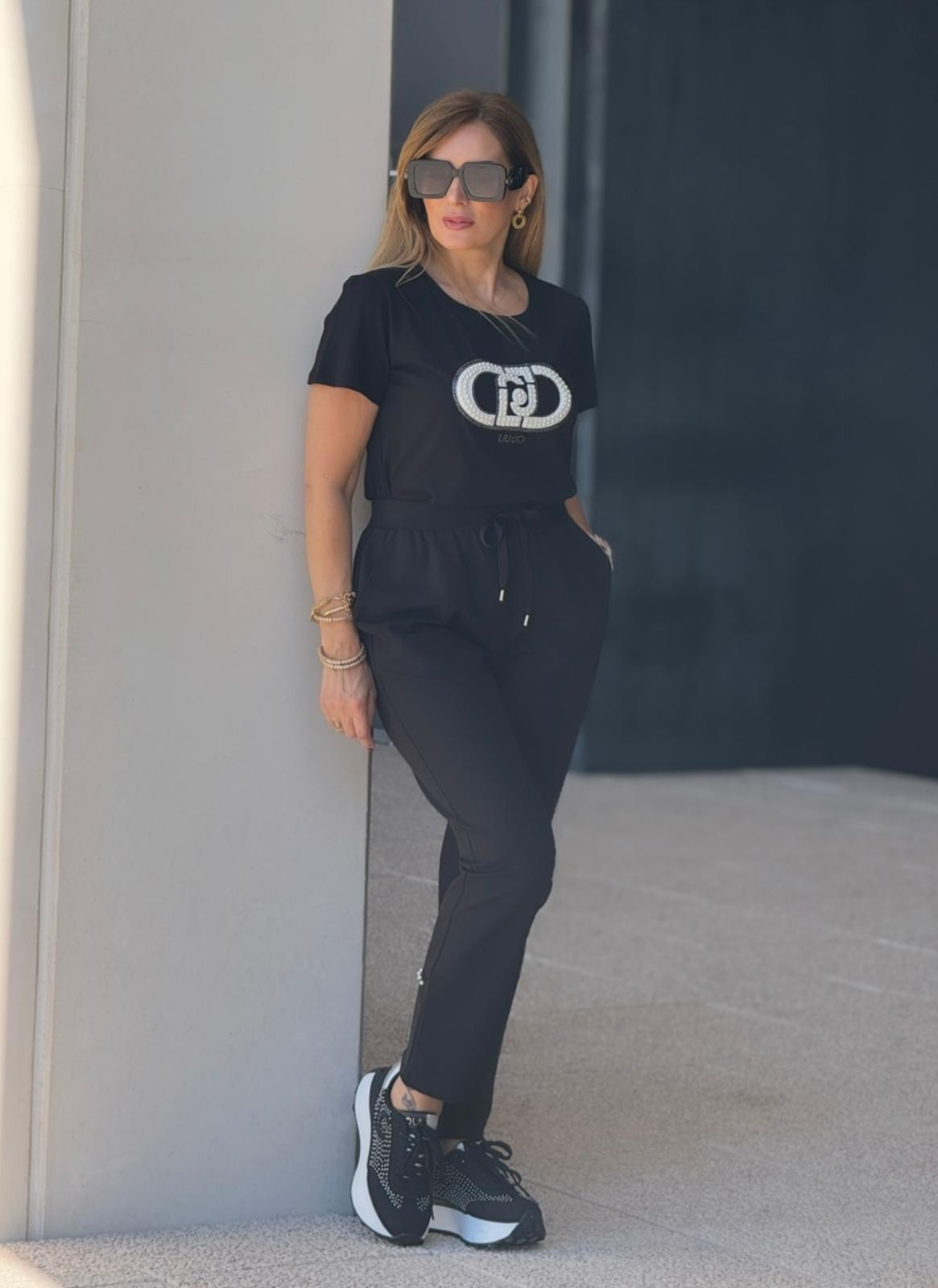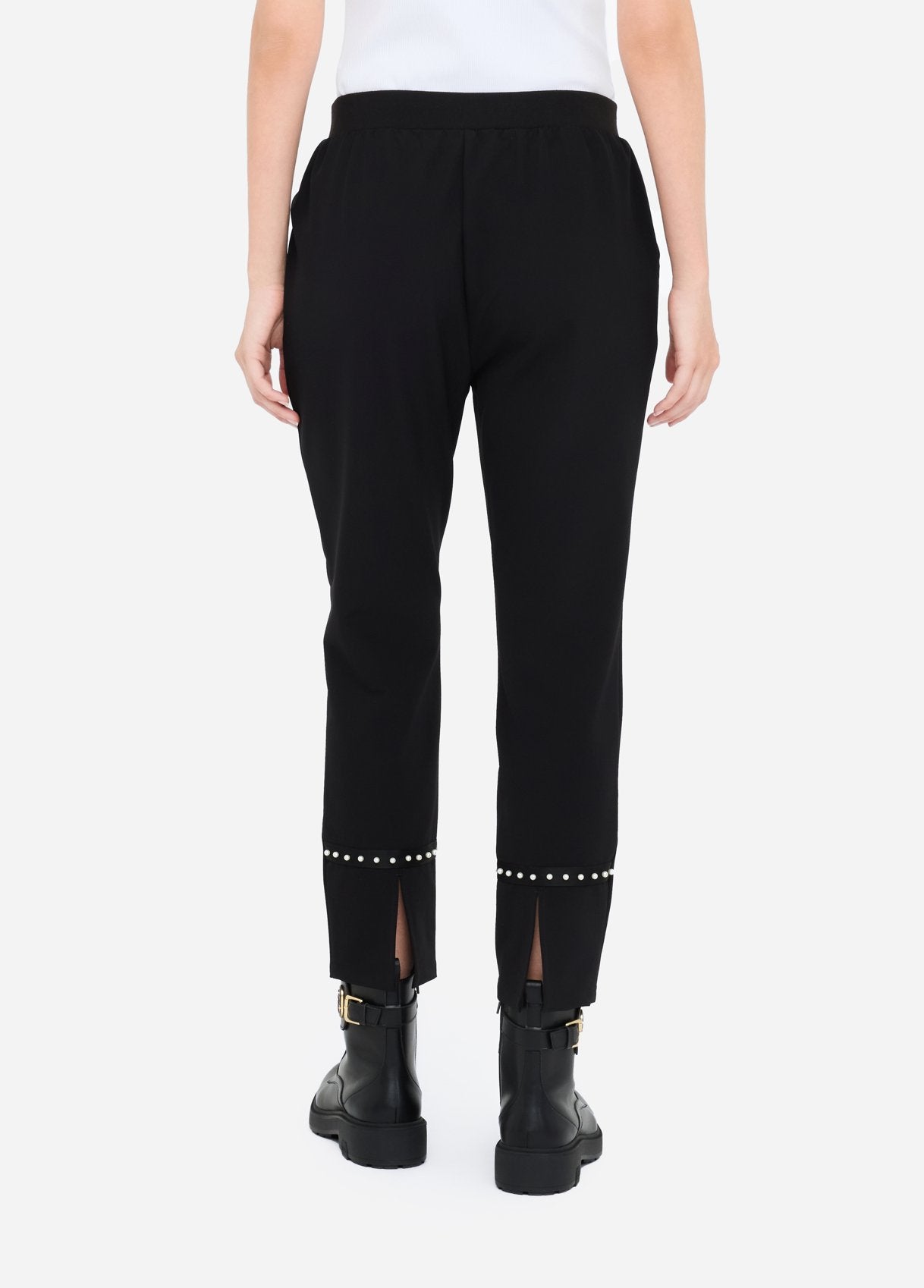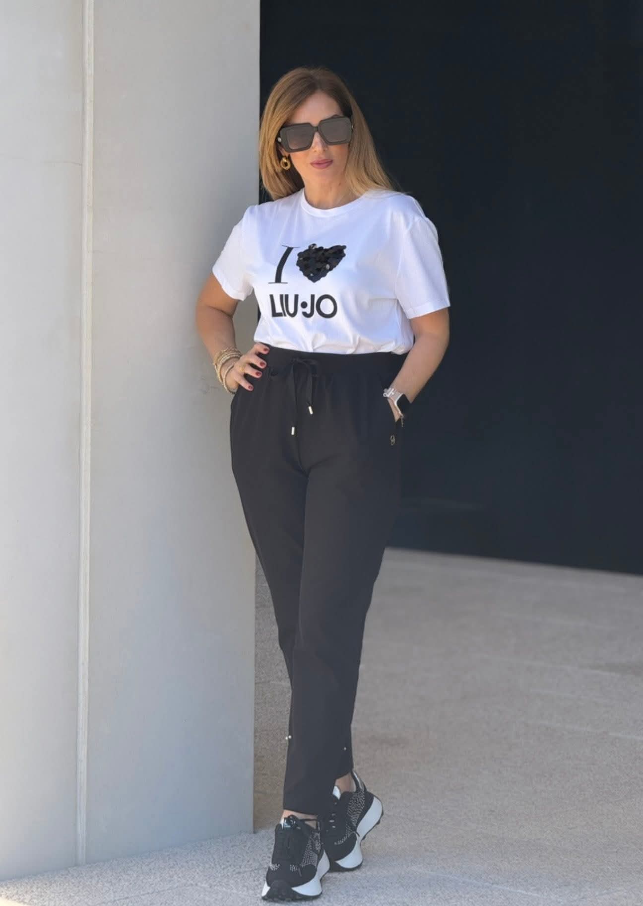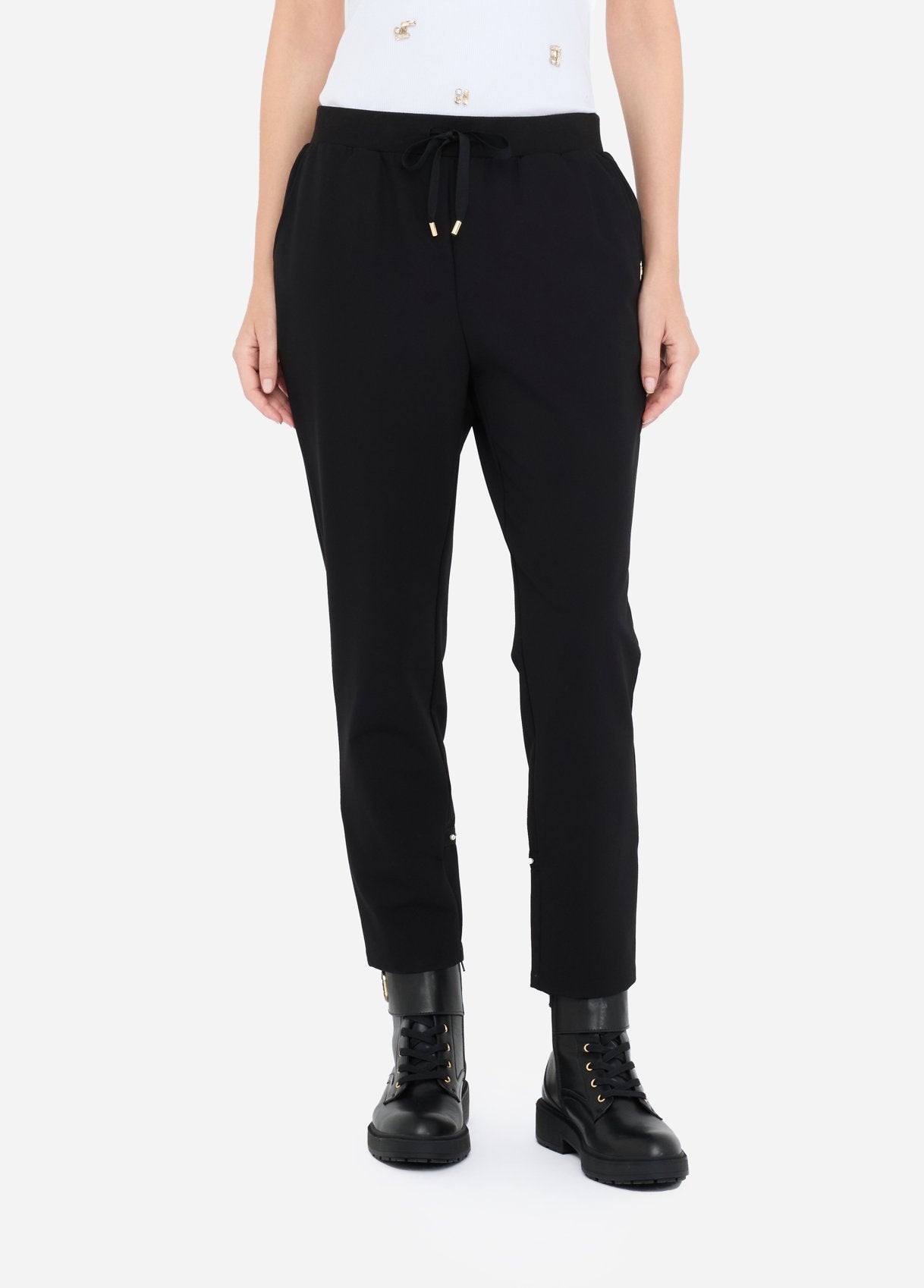 Calça Liu Jo de fato de treino, com cintura elástica ajustável por atilho para maior conforto. Conta com bolsos laterais funcionais e aplicações de miçangas que acrescentam um toque sofisticado ao estilo casual. Apresenta logotipo em metal e rachas discretas na barra traseira, que conferem modernidade ao design.