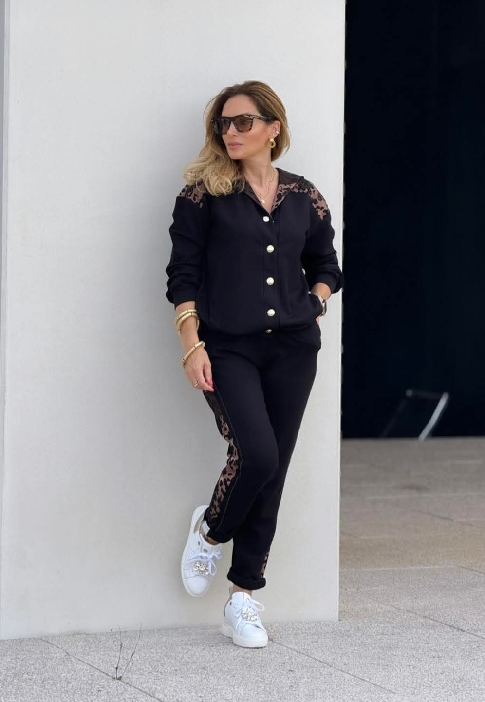 Calças de fato de treino Liu Jo que combinam estilo e conforto, com faixa lateral em animal print adornada por micro strass que adicionam um toque sofisticado. Apresentam costura central frontal nas pernas, bolsos laterais práticos e botões dourados decorativos na cintura, para um visual moderno e cheio de personalidade.