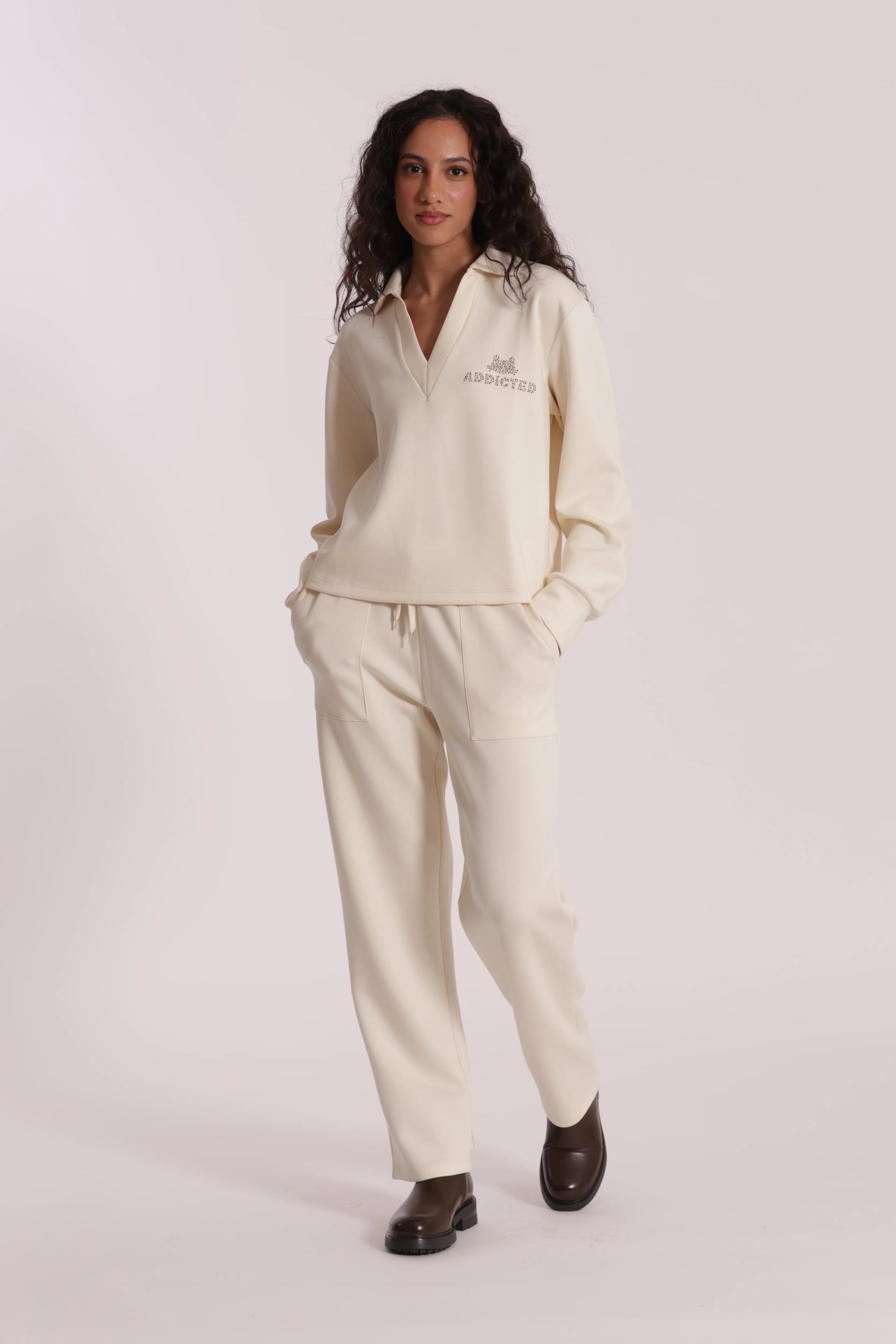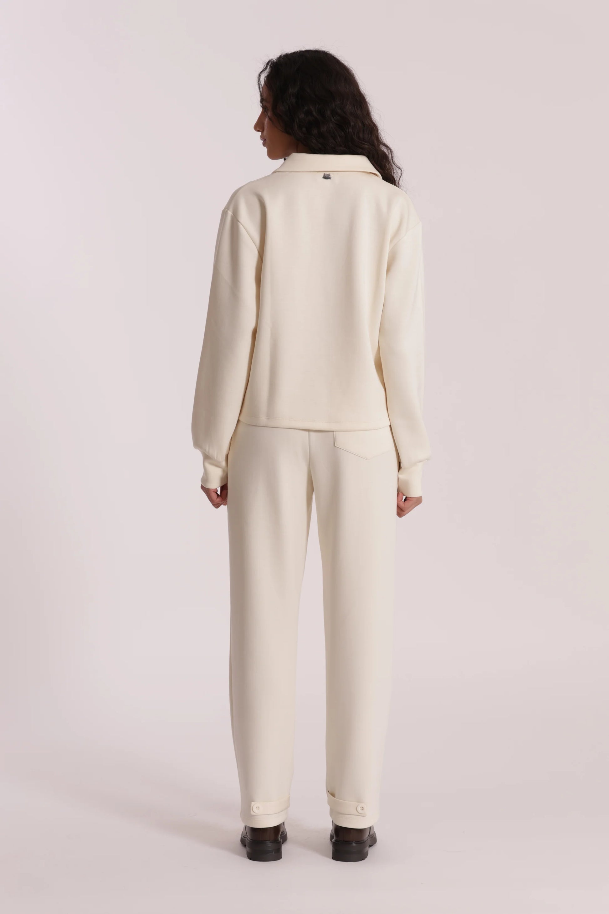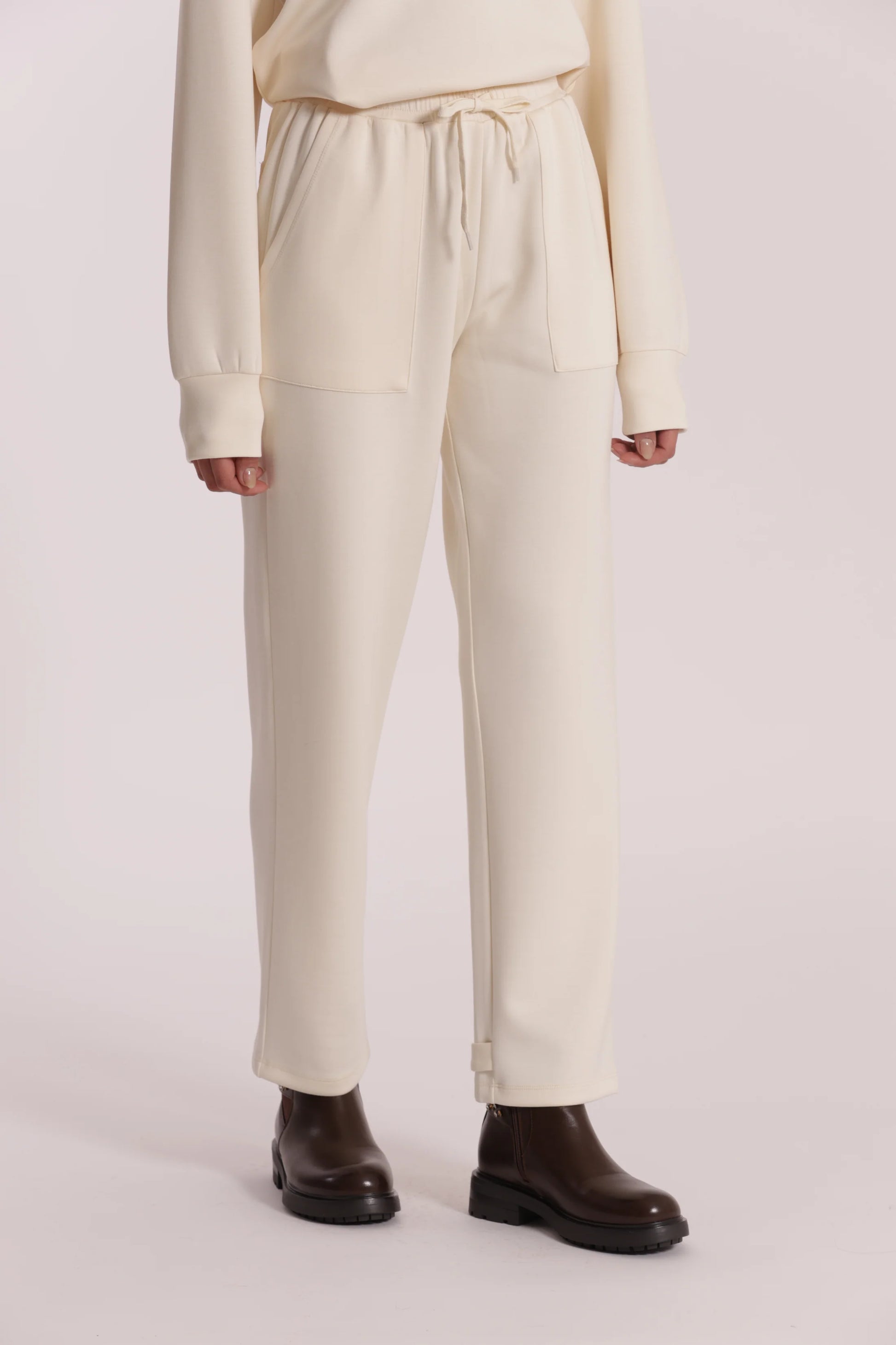 Calças Mimi Mua com corte reto, cintura elástica com atilhos para ajuste personalizado e bolsos laterais práticos. O acabamento da perna apresenta fivela com botão, adicionando um detalhe sofisticado. Pode ser combinado com a sweat do mesmo tecido para criar um conjunto de fato de treino completo, moderno e confortável.