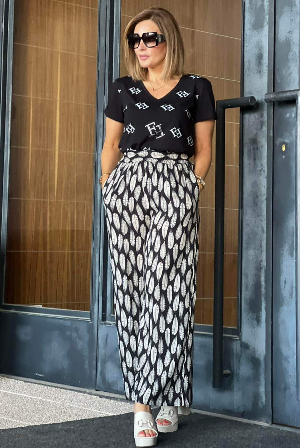 Calças pantalonas estampadas, com elástico na cintura.