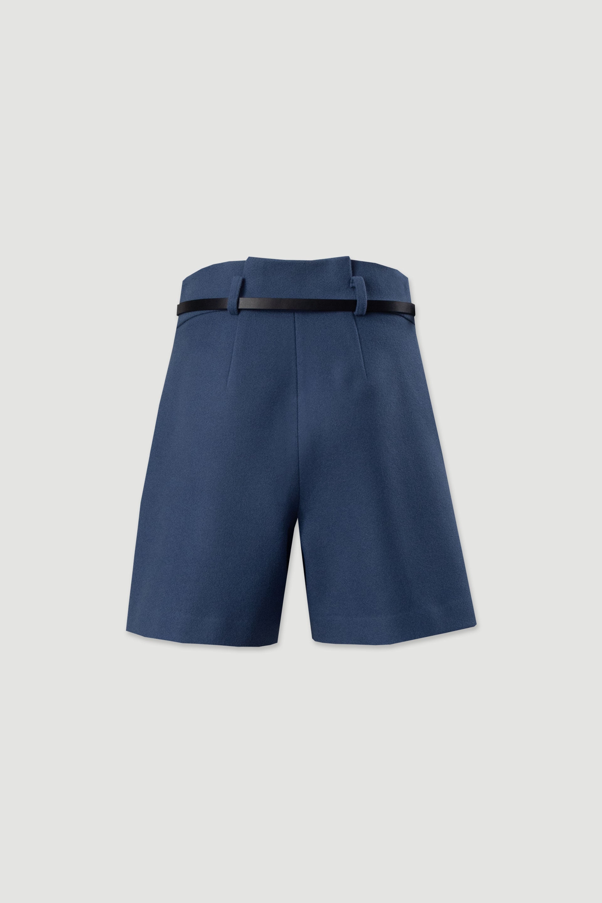 Calções Ferrache de corte estruturado com cintura subida e presilhas largas, acompanhados por um cinto fino removível que realça a silhueta. O modelo apresenta pregas subtis na frente, conferindo um toque elegante e feminino. Ideais para coordenar com camisas ou blazers, criando looks modernos e sofisticados.