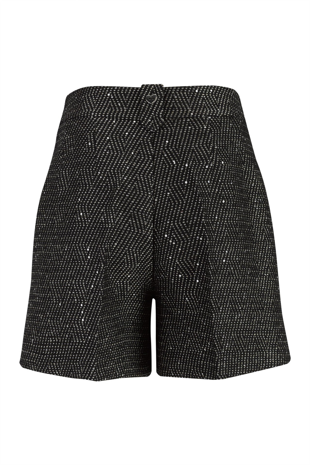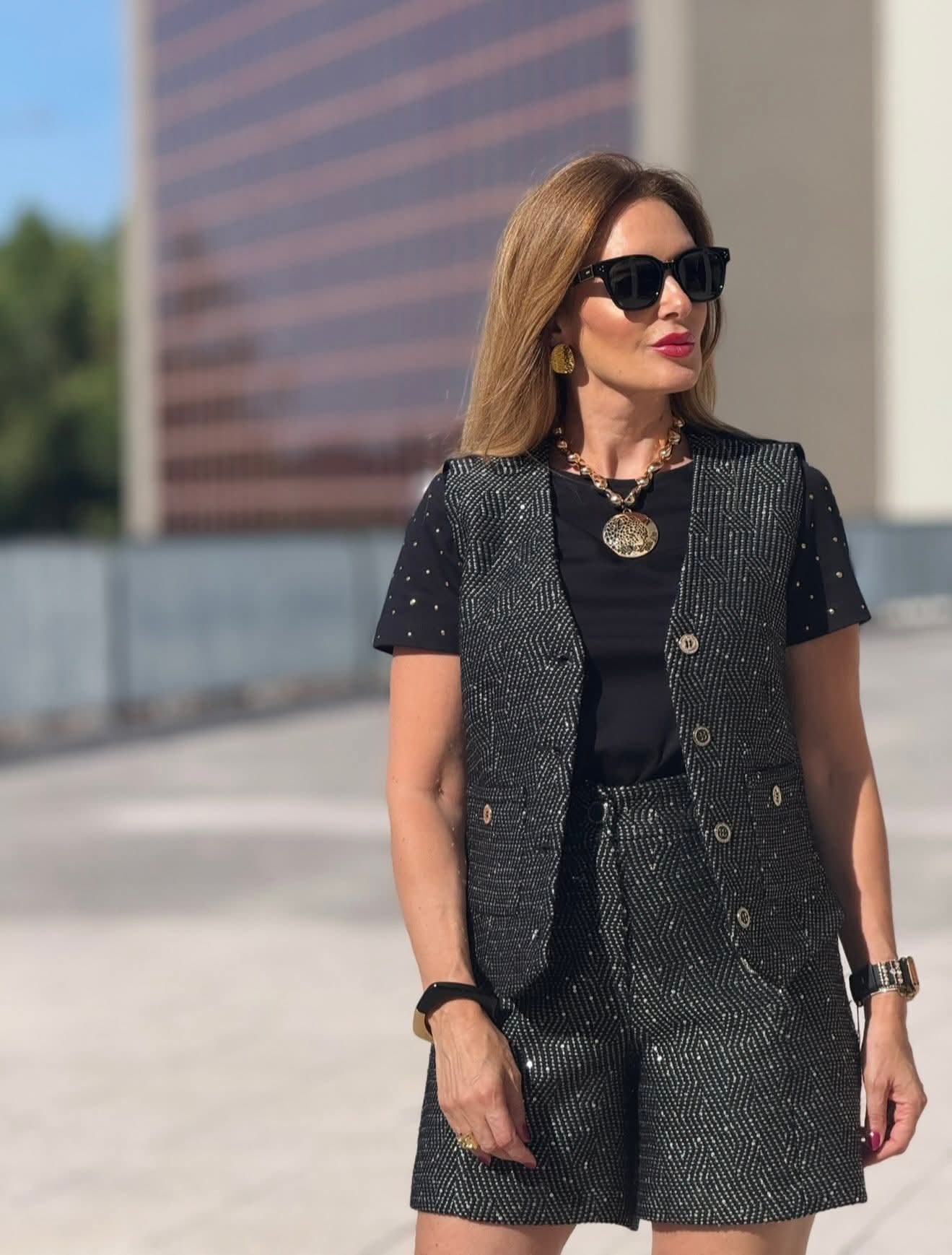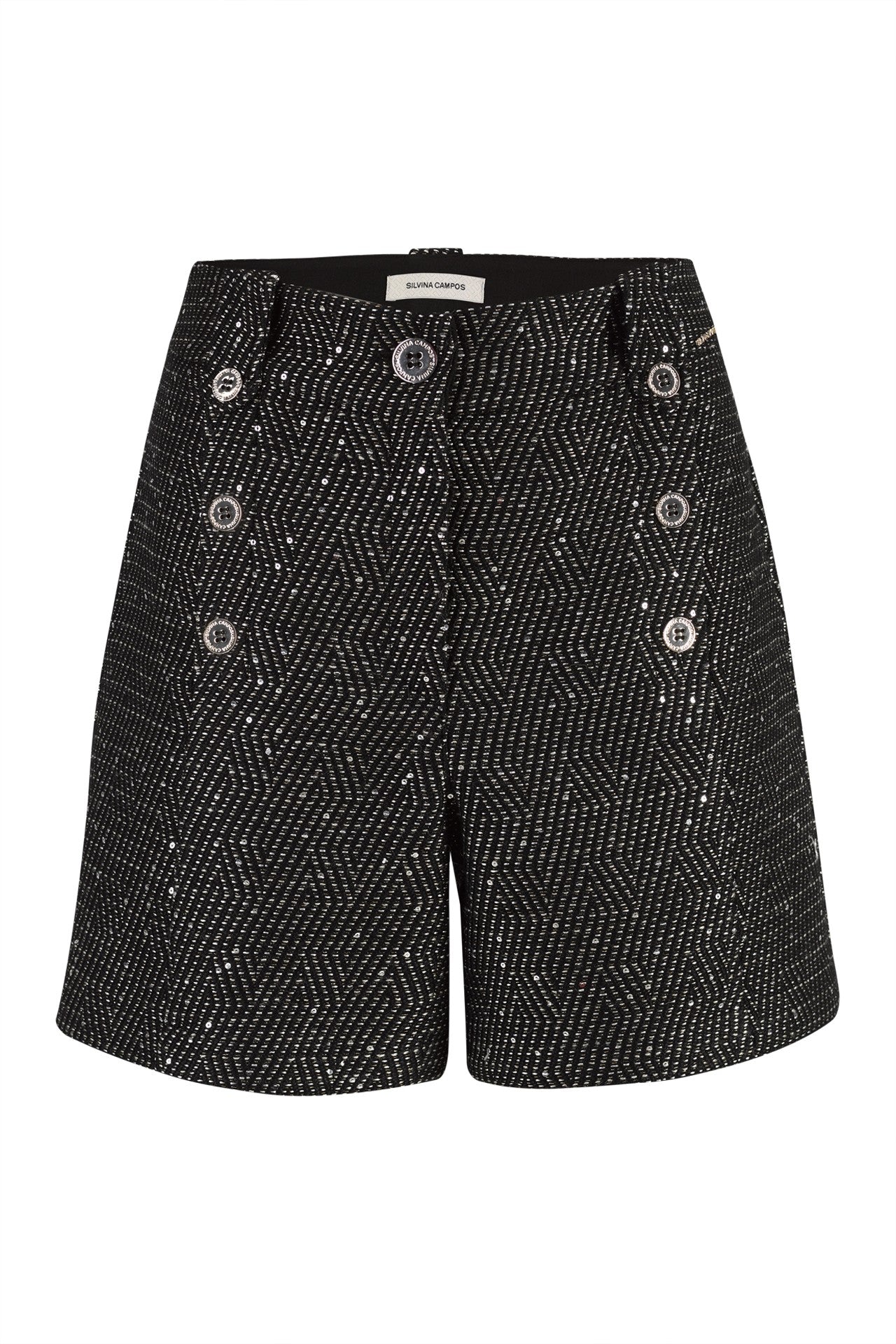 Calções Silvina Campos em tweed com brilho subtil, ideais para looks modernos e elegantes. Apresentam fecho frontal com botão e zíper, além de botões decorativos nas laterais que acrescentam sofisticação ao design. Podem ser conjugados com o colete ou o casaco no mesmo tecido, formando um conjunto coordenado cheio de estilo.