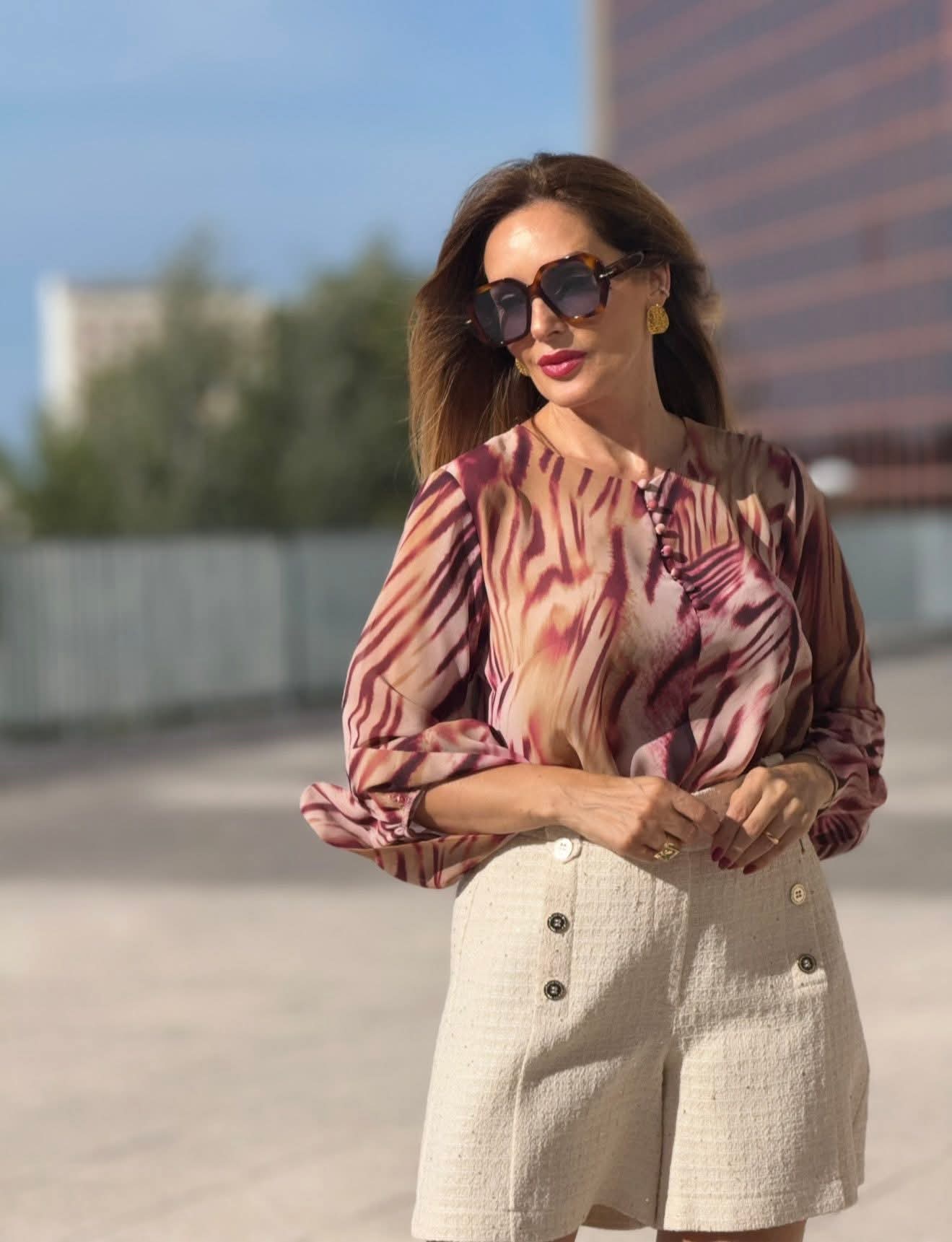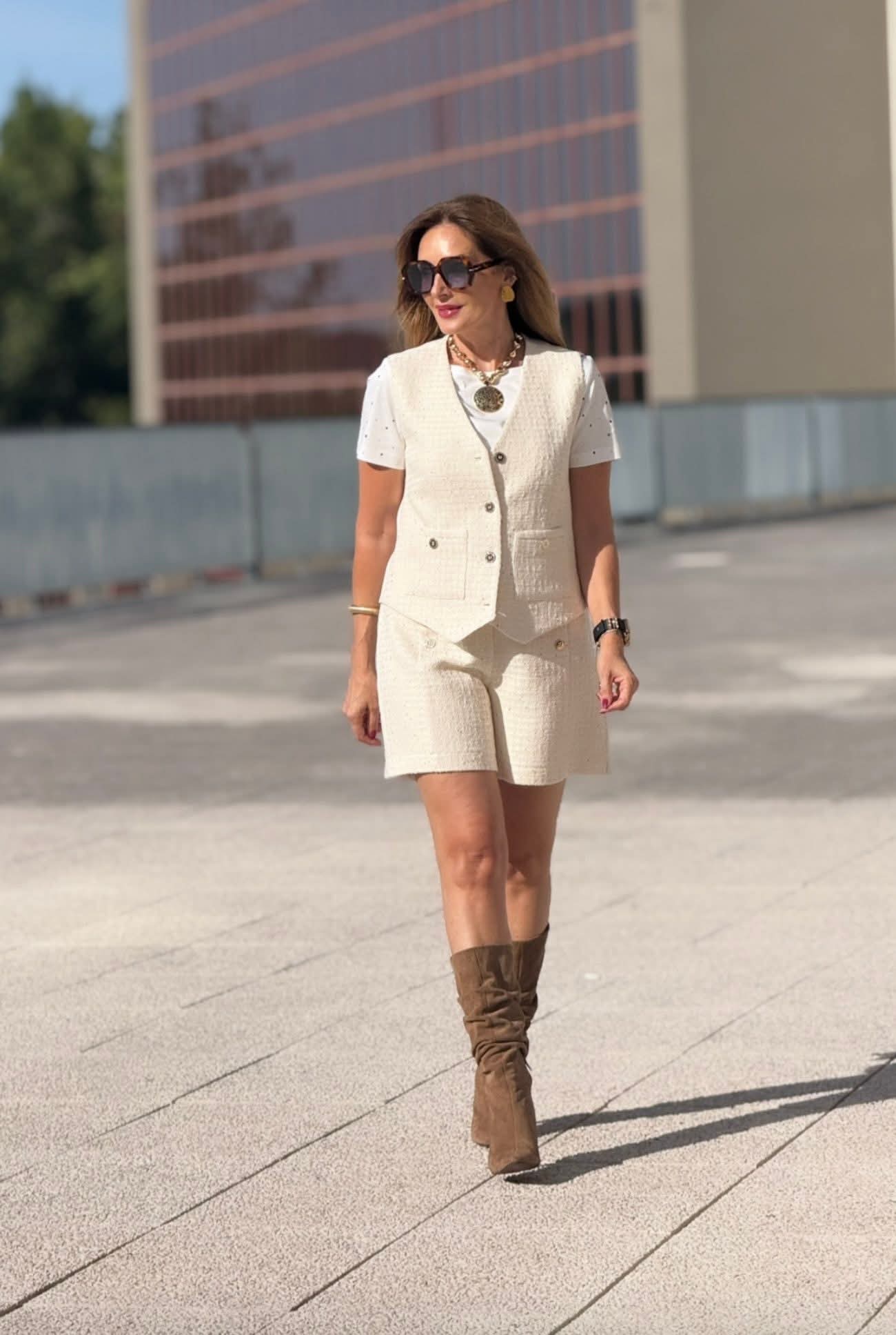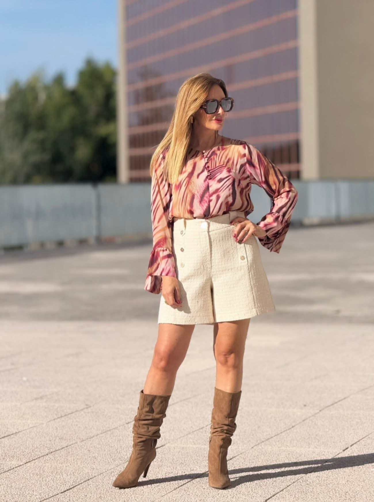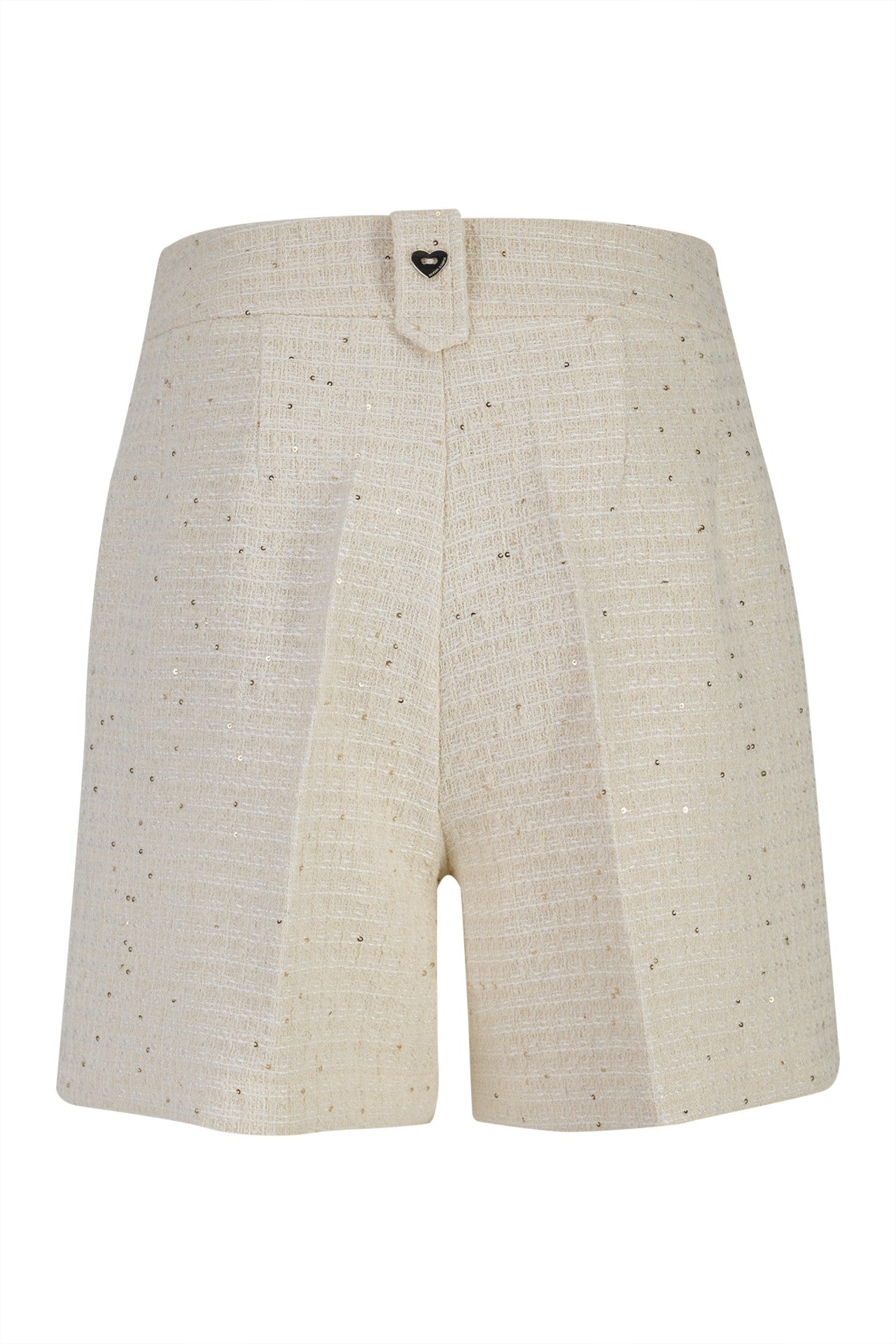 Calções Silvina Campos em tweed com brilho subtil, ideais para looks modernos e elegantes. Apresentam fecho frontal com botão e zíper, além de botões decorativos nas laterais que acrescentam sofisticação ao design. Podem ser conjugados com o colete ou o casaco no mesmo tecido, formando um conjunto coordenado cheio de estilo.