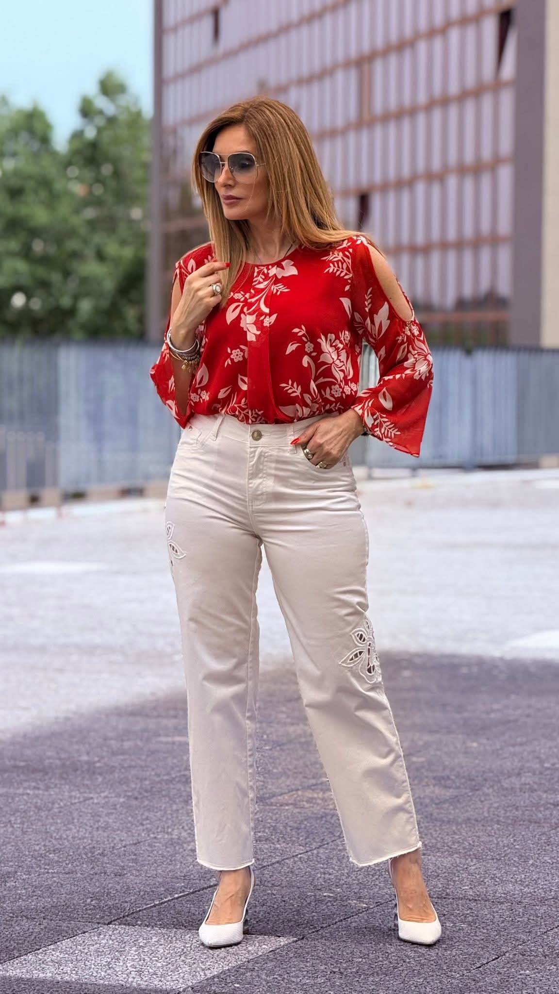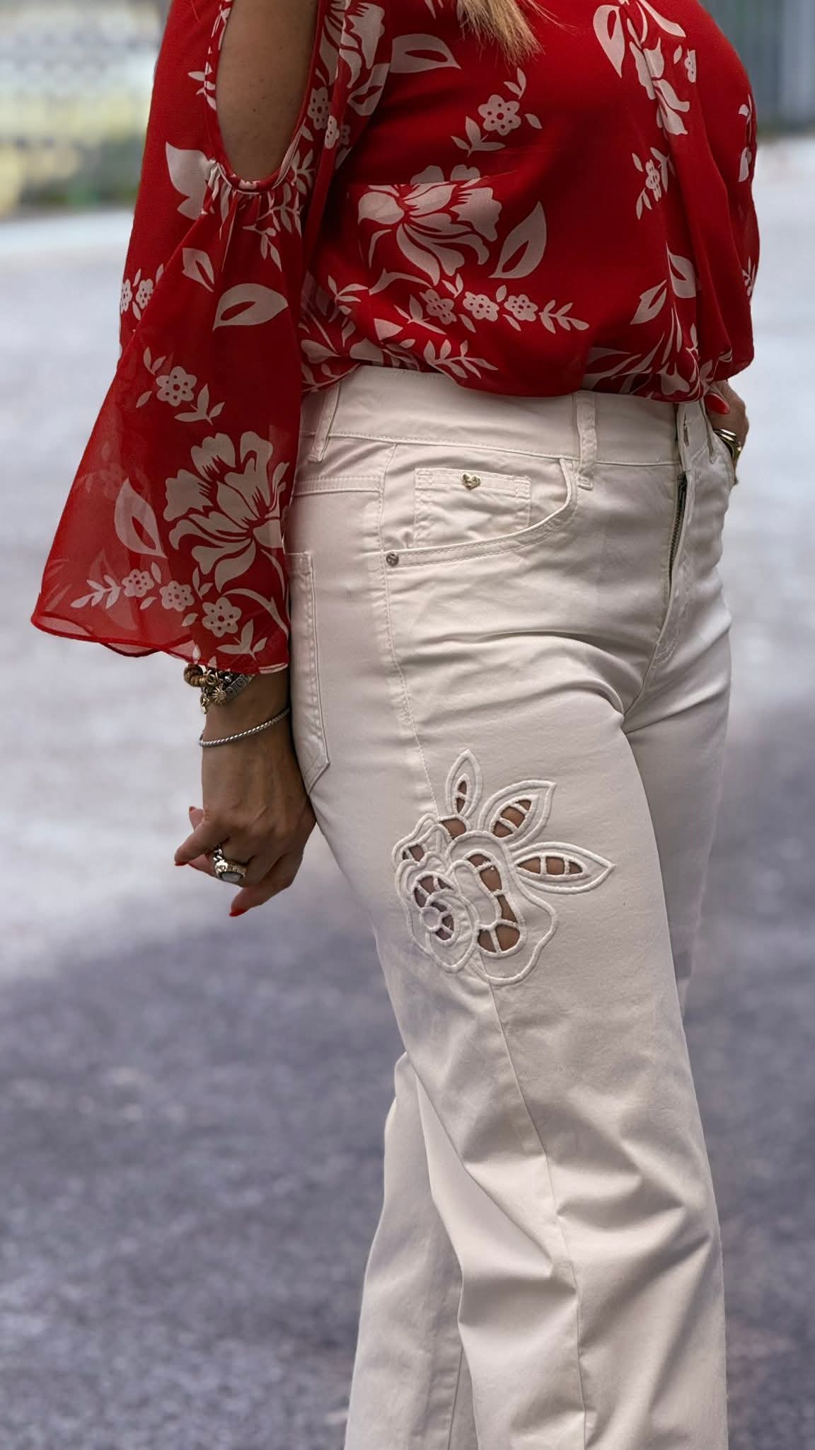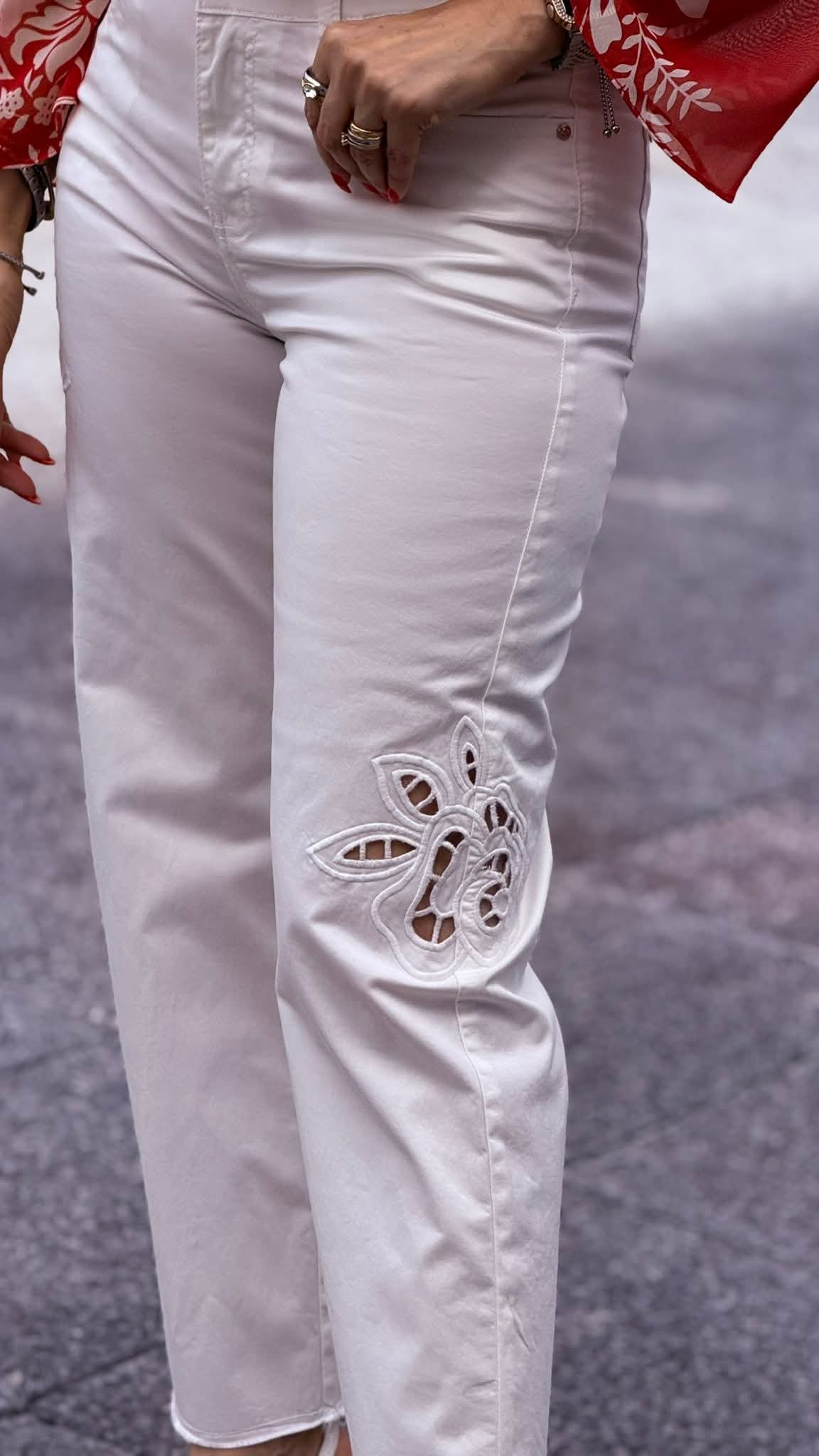 As calças de sarja Silvina Campos distinguem-se pelo bordado de flores nas perneiras, um detalhe artesanal de carácter distinto que transforma uma base clássica numa peça de identidade própria. O fecho de botão e zíper assegura um acabamento funcional e cuidado, enquanto os dois bolsos à frente e os dois bolsos de chapa atrás respondem às exigências práticas do quotidiano com rigor estético. O corte em sarja confere estrutura e versatilidade, permitindo integrar esta peça em composições mais polidas ou em looks casuais com presença. Um denim que reflete a sensibilidade da Silvina Campos na reinterpretação de um essencial do guarda-roupa feminino com detalhe e sofisticação.