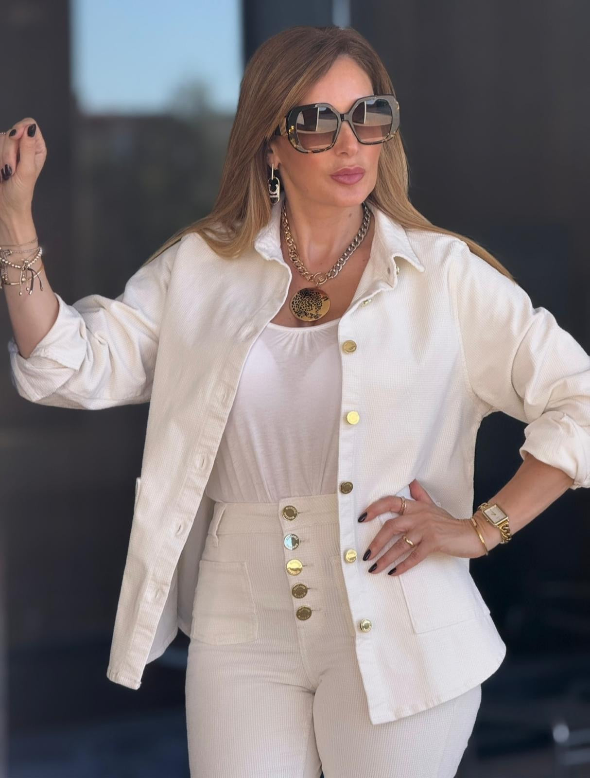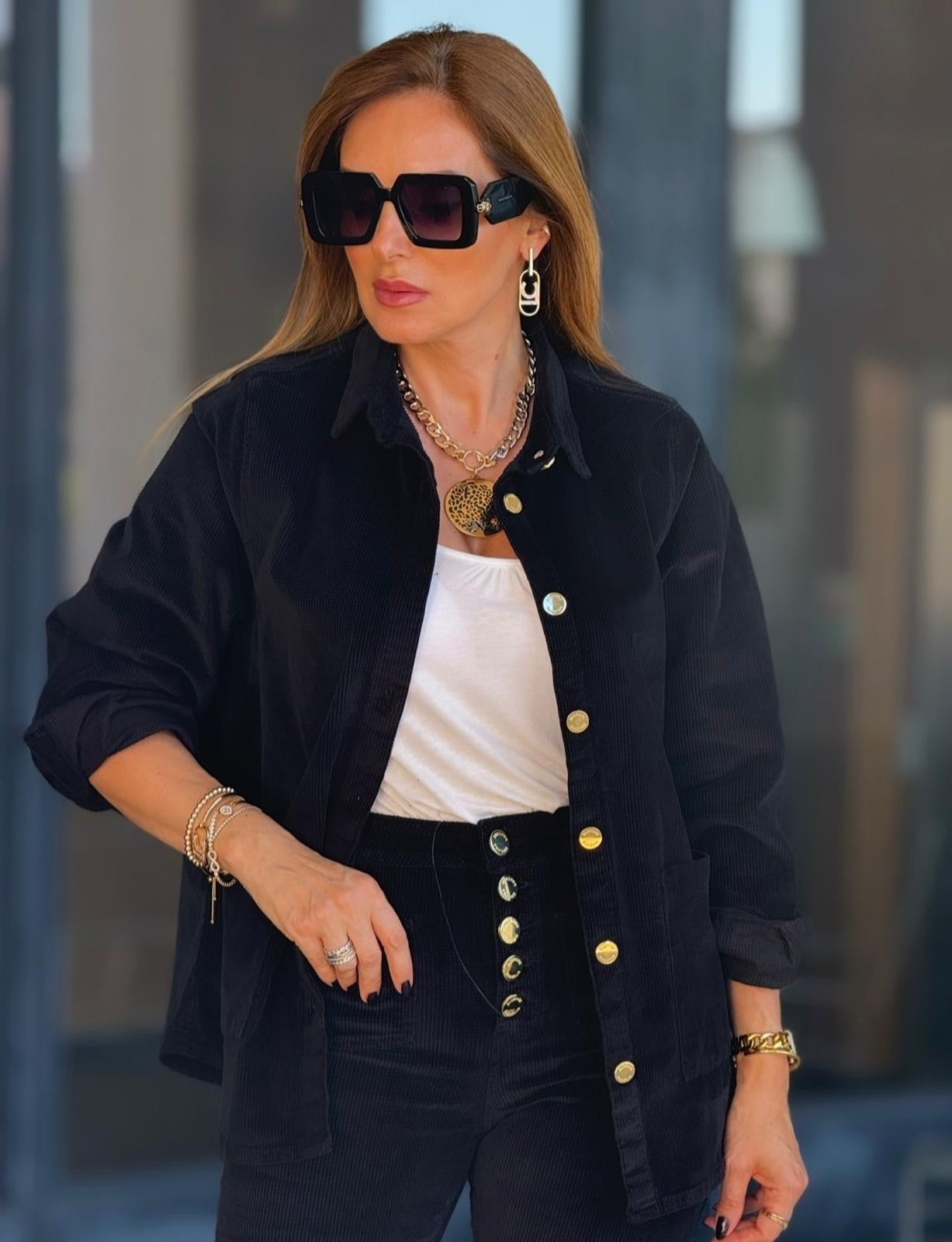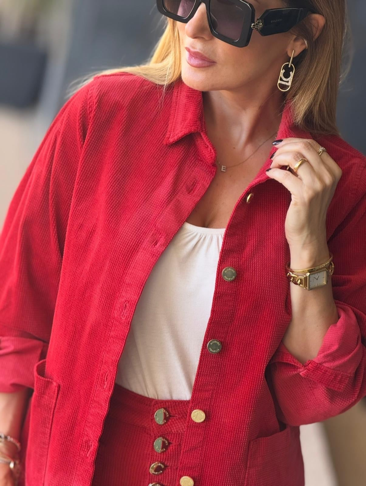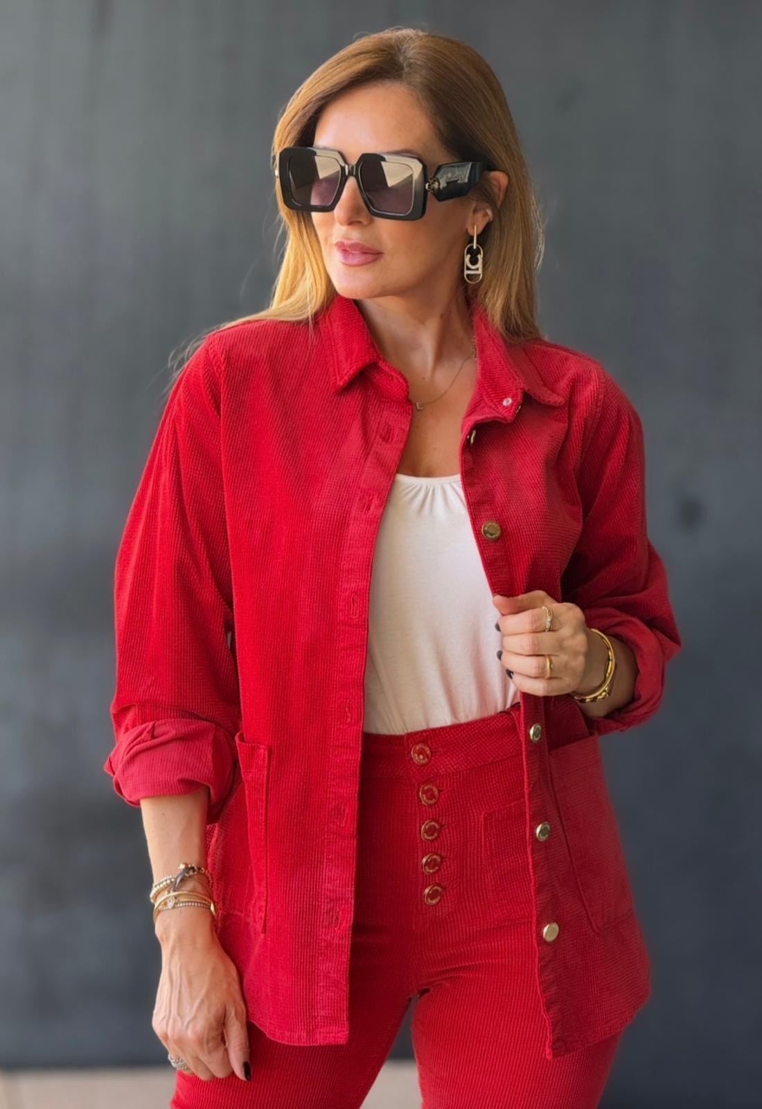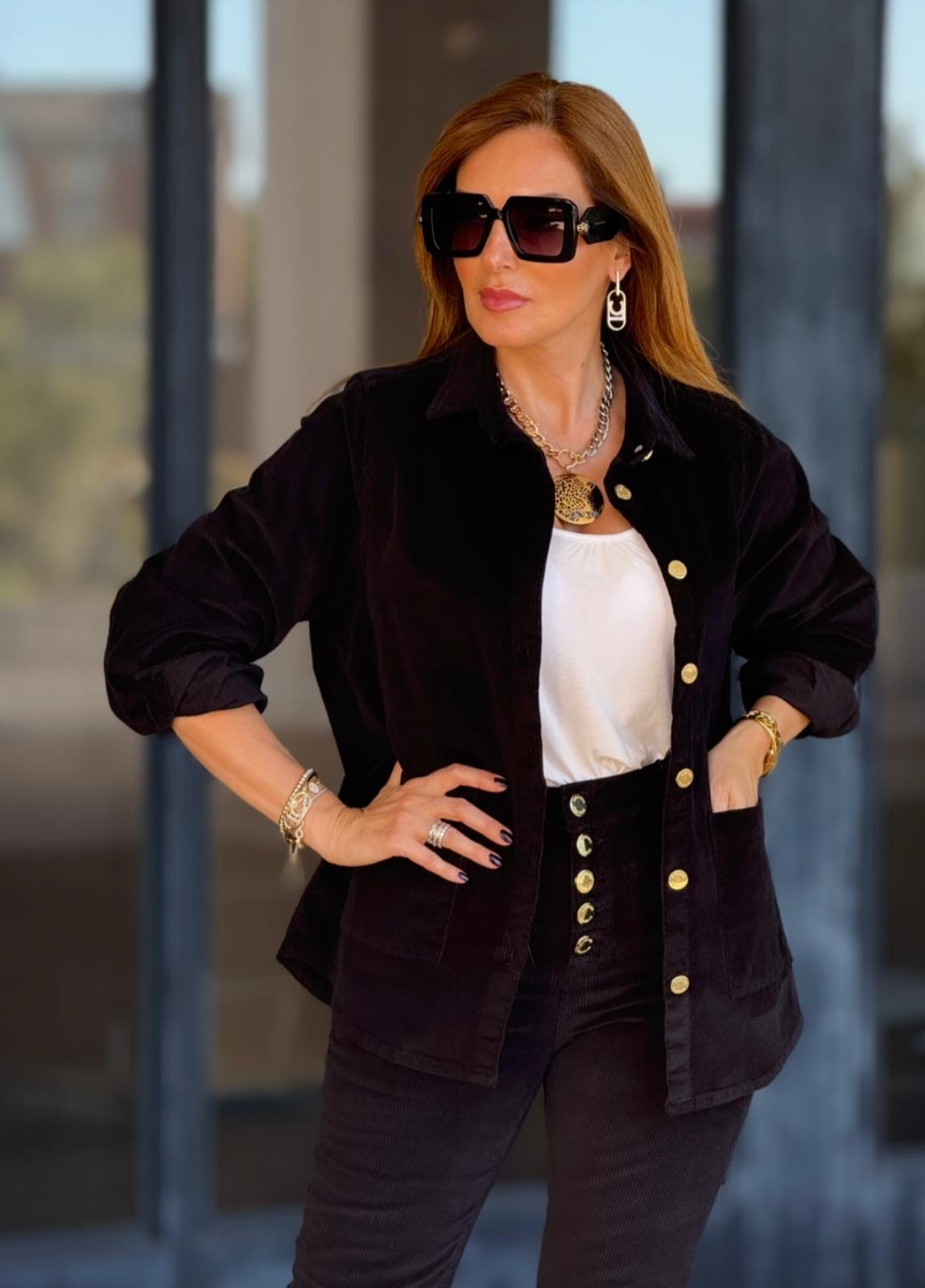 Camisa confecionada em bombazine macia, como bolsos laterais e pormenor de botões em dourado
