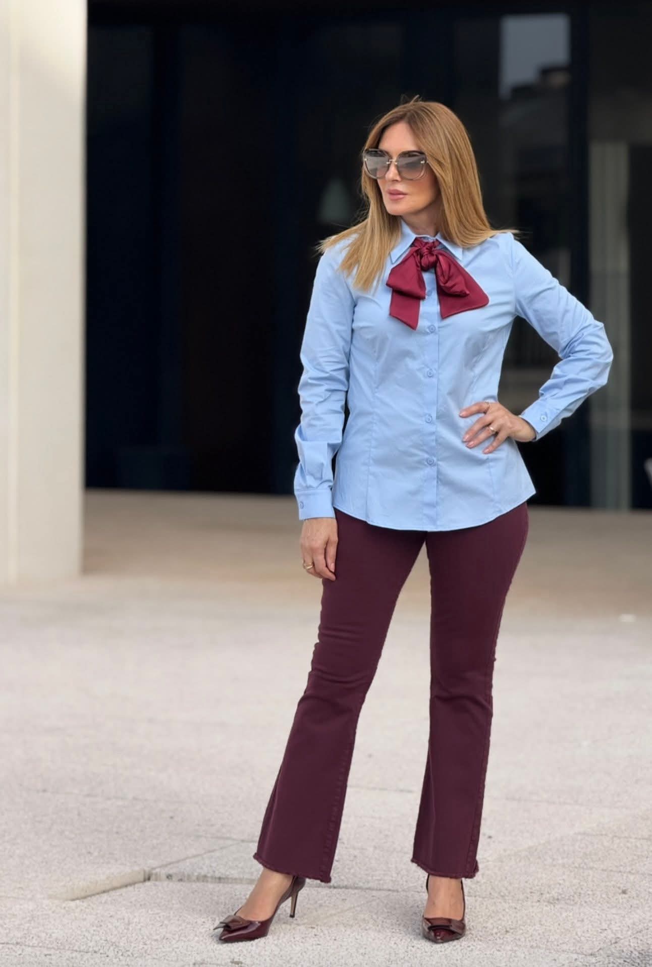 Camisa Fly Girl cintada, com manga comprida e fecho de botões frontais. O destaque fica por conta do laço acetinado em tom bordo aplicado no colarinho, que acrescenta um toque sofisticado e feminino. Uma peça versátil que pode ser usada em looks elegantes de trabalho ou em coordenados mais modernos para ocasiões especiais.