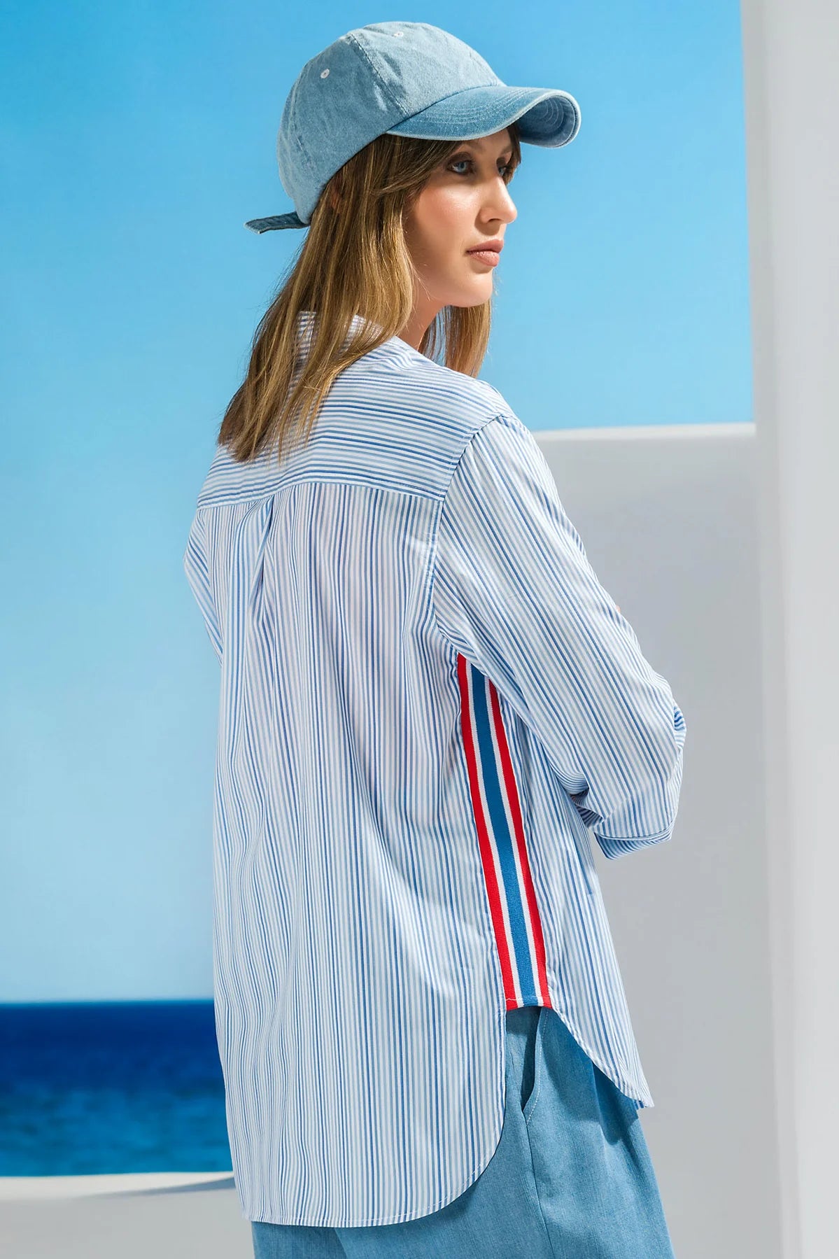 Camiseiro Foursoul em estampado de riscas com colarinho clássico e fecho de botões ao centro, numa composição atemporal reinterpretada com um detalhe de identidade própria. A faixa lateral em contraste quebra a regularidade do padrão com precisão e intenção, introduzindo um elemento gráfico que eleva a peça para além do básico e confere personalidade à silhueta. Uma proposta da Foursoul que equilibra o clássico do camiseiro tradicional com uma abordagem contemporânea e distinta, ideal para compor looks de escritório ou de fim de semana com facilidade e coerência.