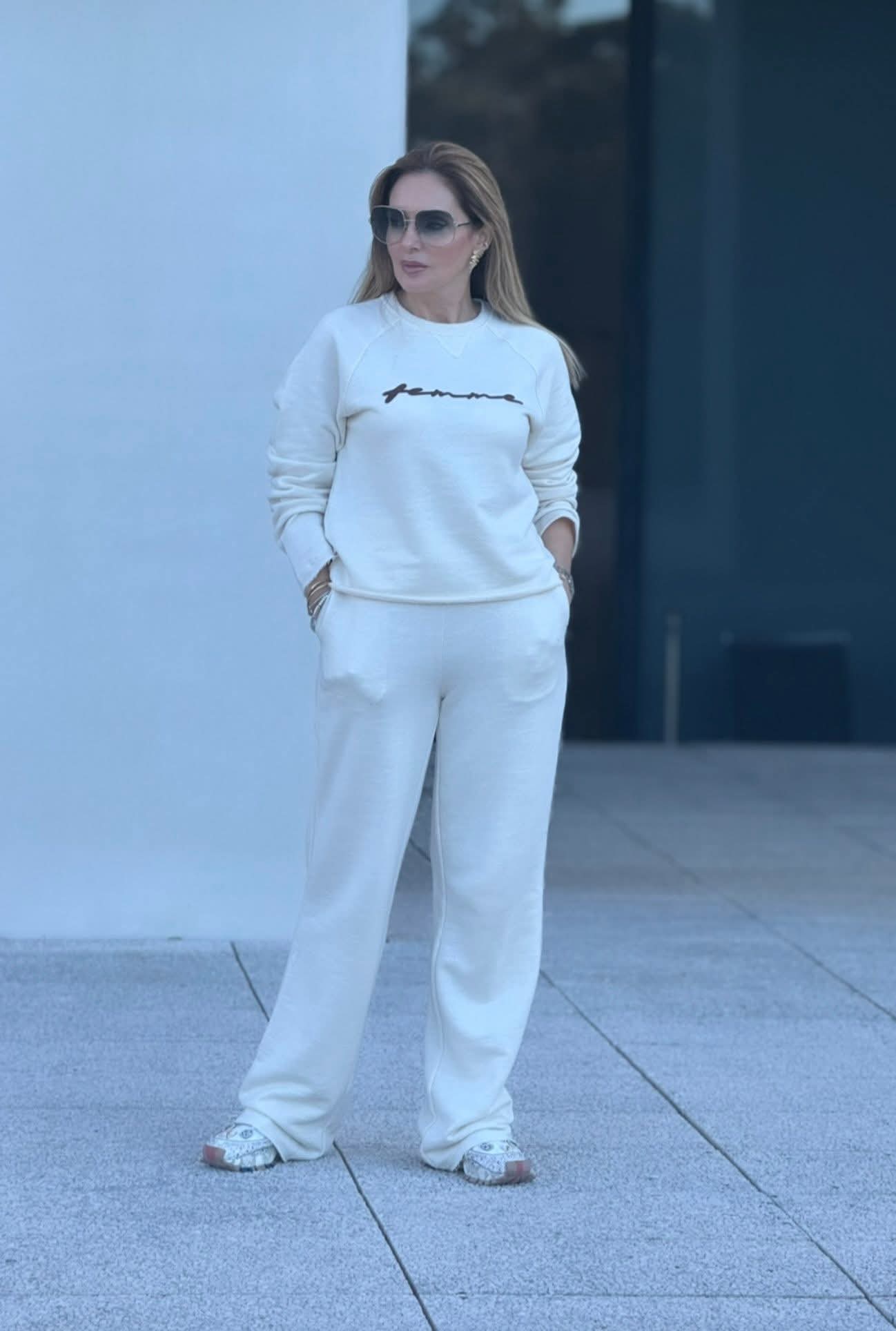Camisola Fé em algodão macio, com decote redondo e manga comprida. Apresenta estampado no peito que adiciona um toque moderno ao design simples e confortável. Ideal para usar no dia a dia ou combinar com as calças do mesmo tecido, formando um conjunto de treino prático e elegante.