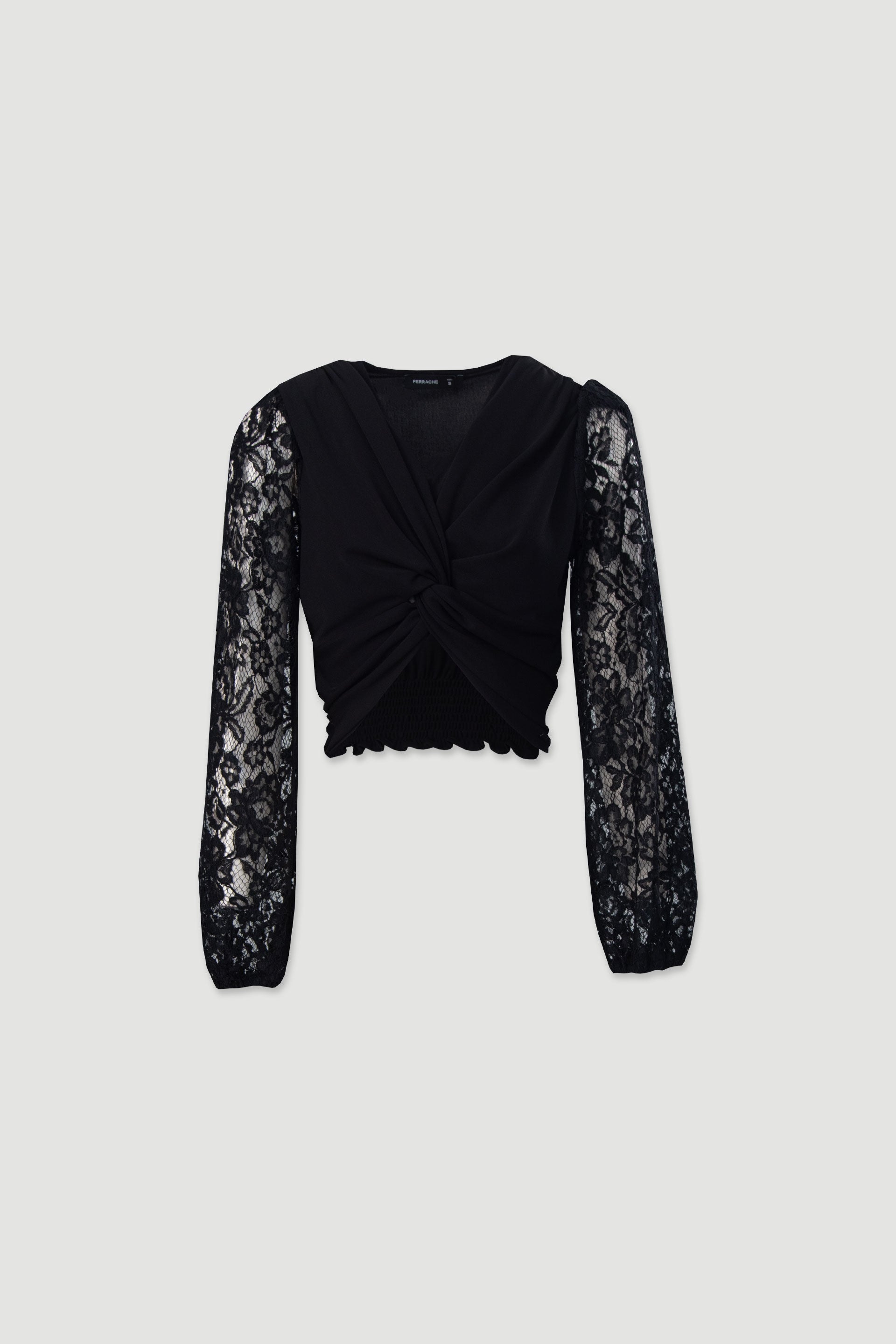 Camisola curta Ferrache com decote em V cruzado e elegante efeito de nó na frente. As mangas compridas em tecido de renda acrescentam um toque feminino e sofisticado. Os punhos com elástico e as costas ajustadas com franzido elástico na cintura garantem conforto e melhor adaptação à silhueta.
