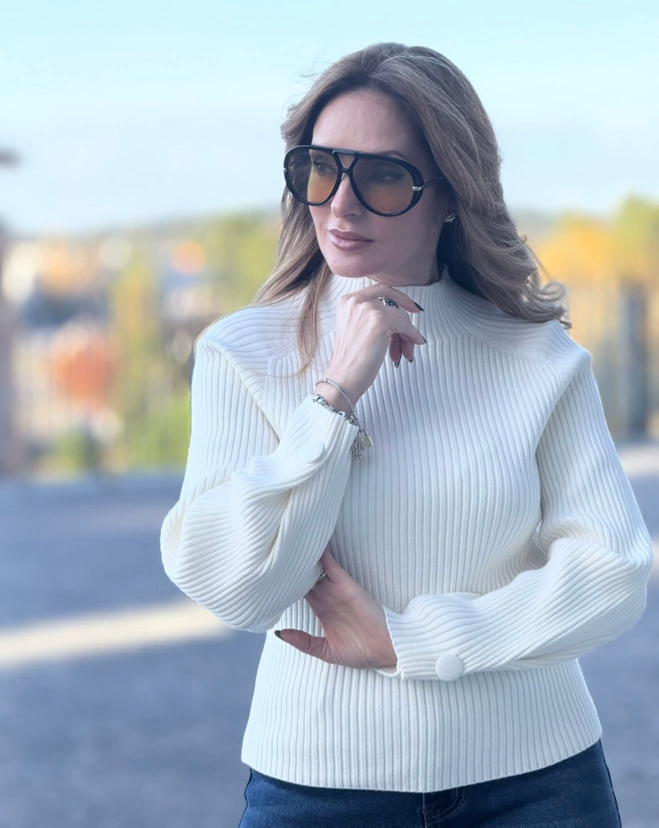 Camisola de malha canelada Ferrache com meia gola e corte ajustado que valoriza a silhueta. As mangas compridas incluem um elegante botão forrado no punho, adicionando um toque sofisticado. Perfeita para looks confortáveis e femininos.