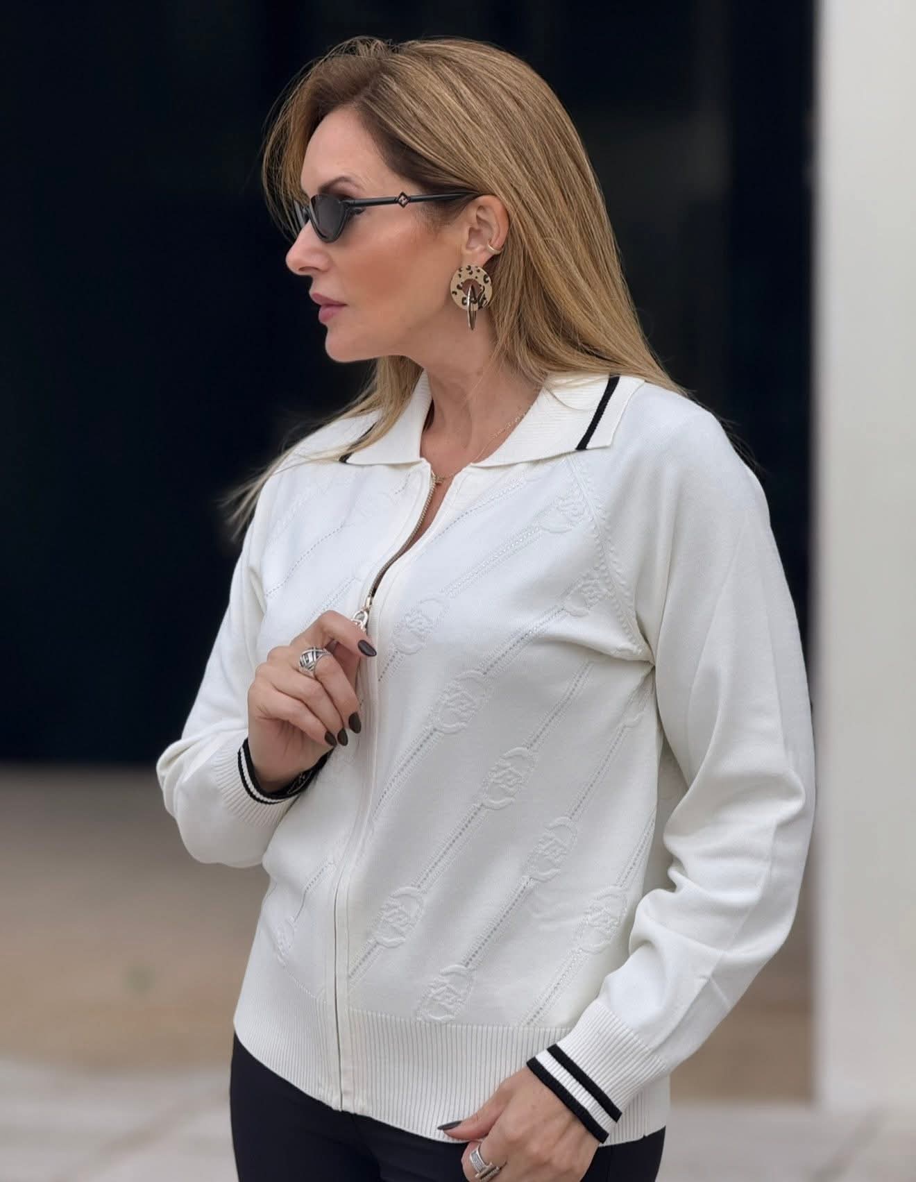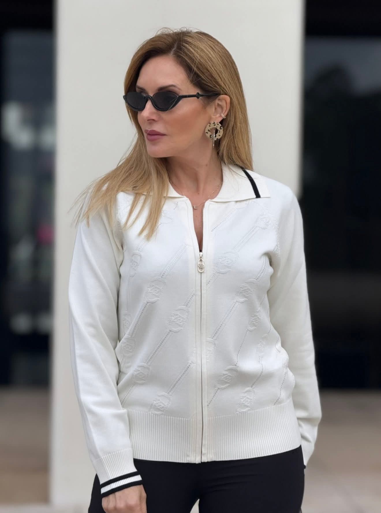 Cardigan em malha Liu Jo com logotipo monogramado adornado com strass, que acrescenta um toque de brilho sofisticado. Apresenta gola de colarinho, punhos e gola canelados com listras em contraste. Fecho de zíper frontal com puxador personalizado com o logo da marca. Um modelo elegante e confortável, ideal para looks casuais de luxo.