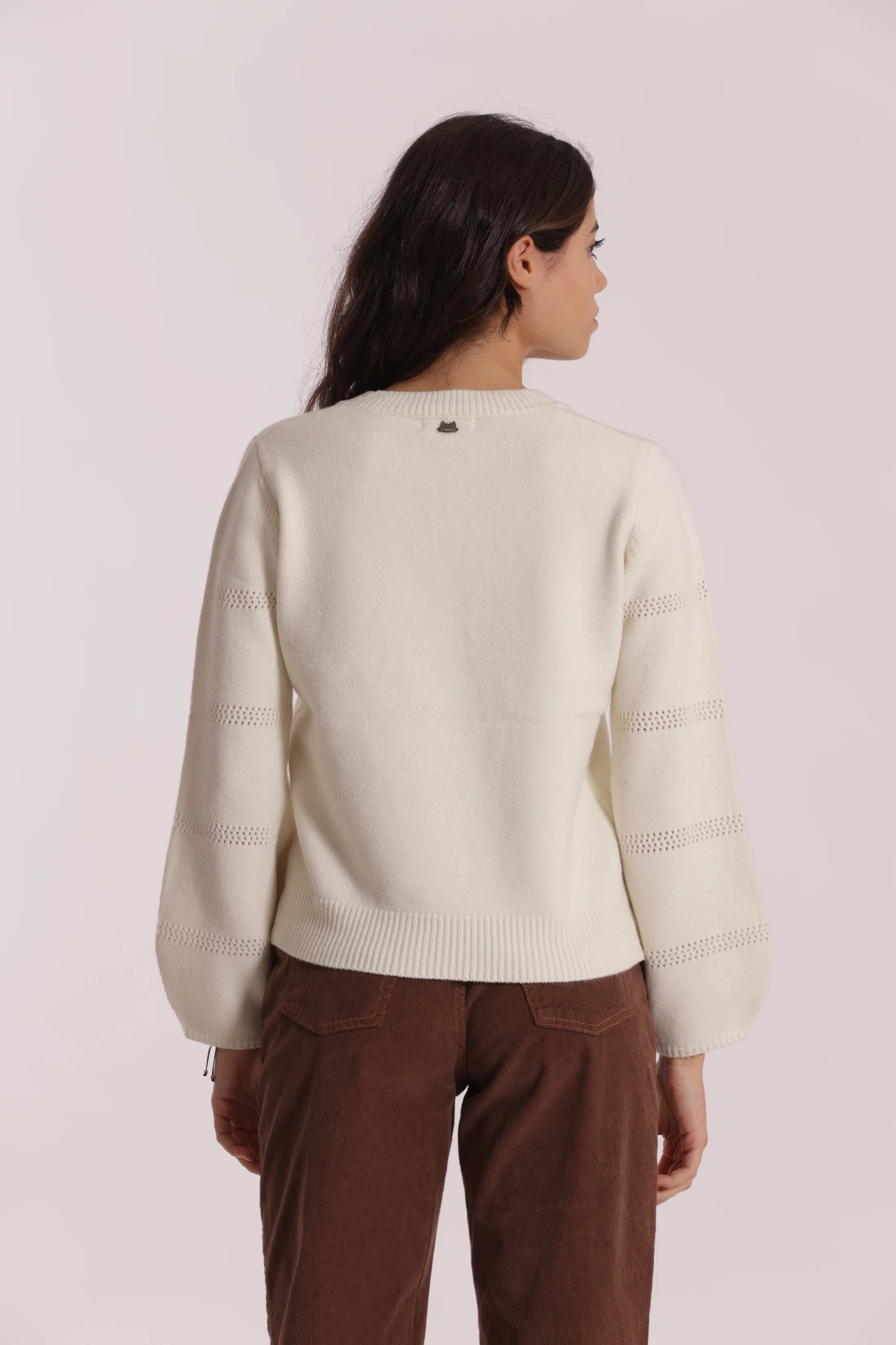 Camisola de malha Mimi Mua com decote em V e gola canelada que proporciona um acabamento elegante. As mangas apresentam perfurações delicadas que acrescentam sofisticação e leveza à peça. Estruturada em malha macia, é uma opção versátil para compor looks casuais ou mais requintados.