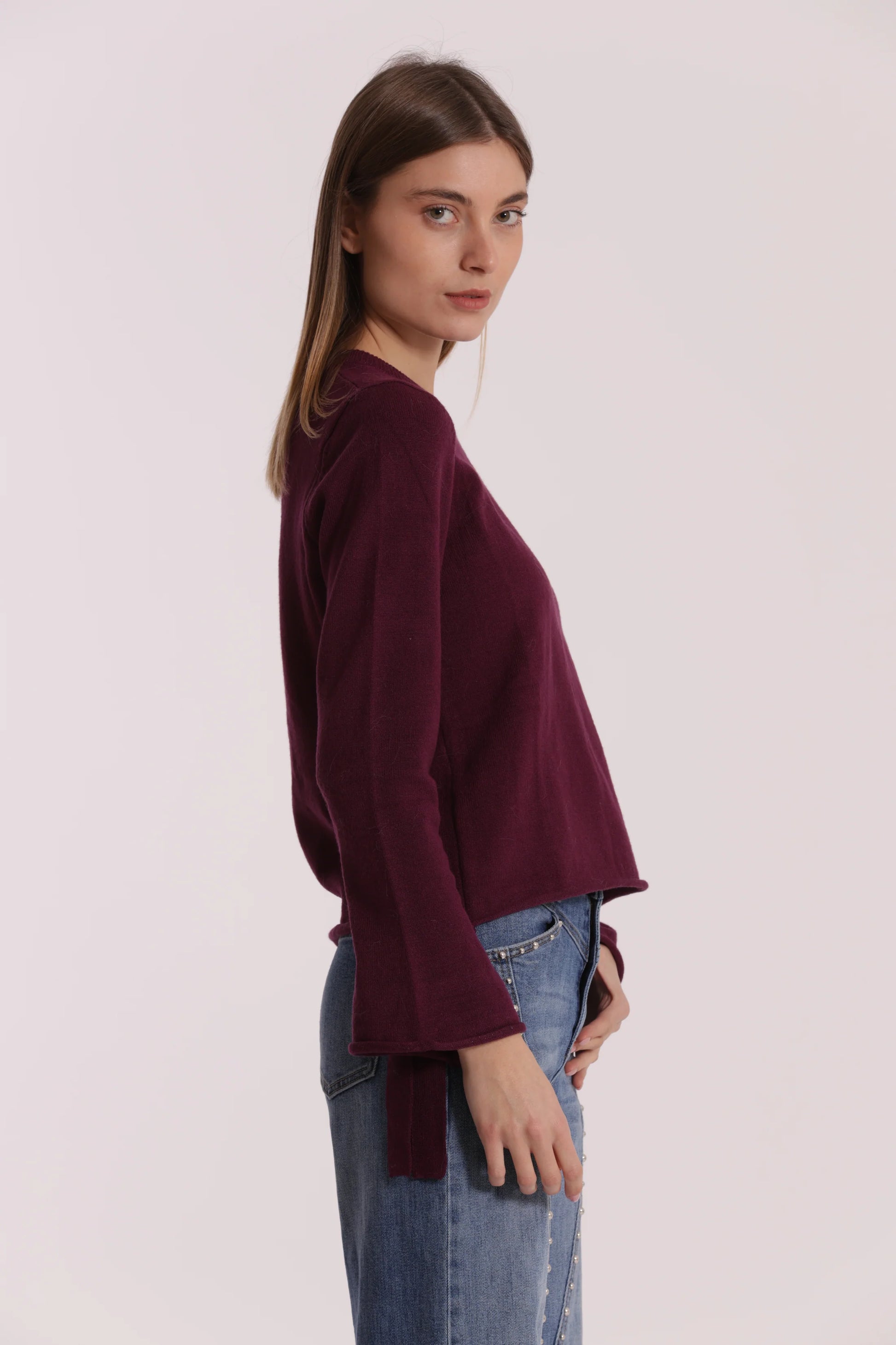 Camisola de malha Mimi Mua com decote redondo delicadamente trabalhado em lurex, que acrescenta brilho subtil à peça. As mangas compridas apresentam corte flare elegante, finalizadas com laçada, garantindo um detalhe sofisticado e feminino. Ideal para elevar coordenados casuais ou formais com um toque distinto.