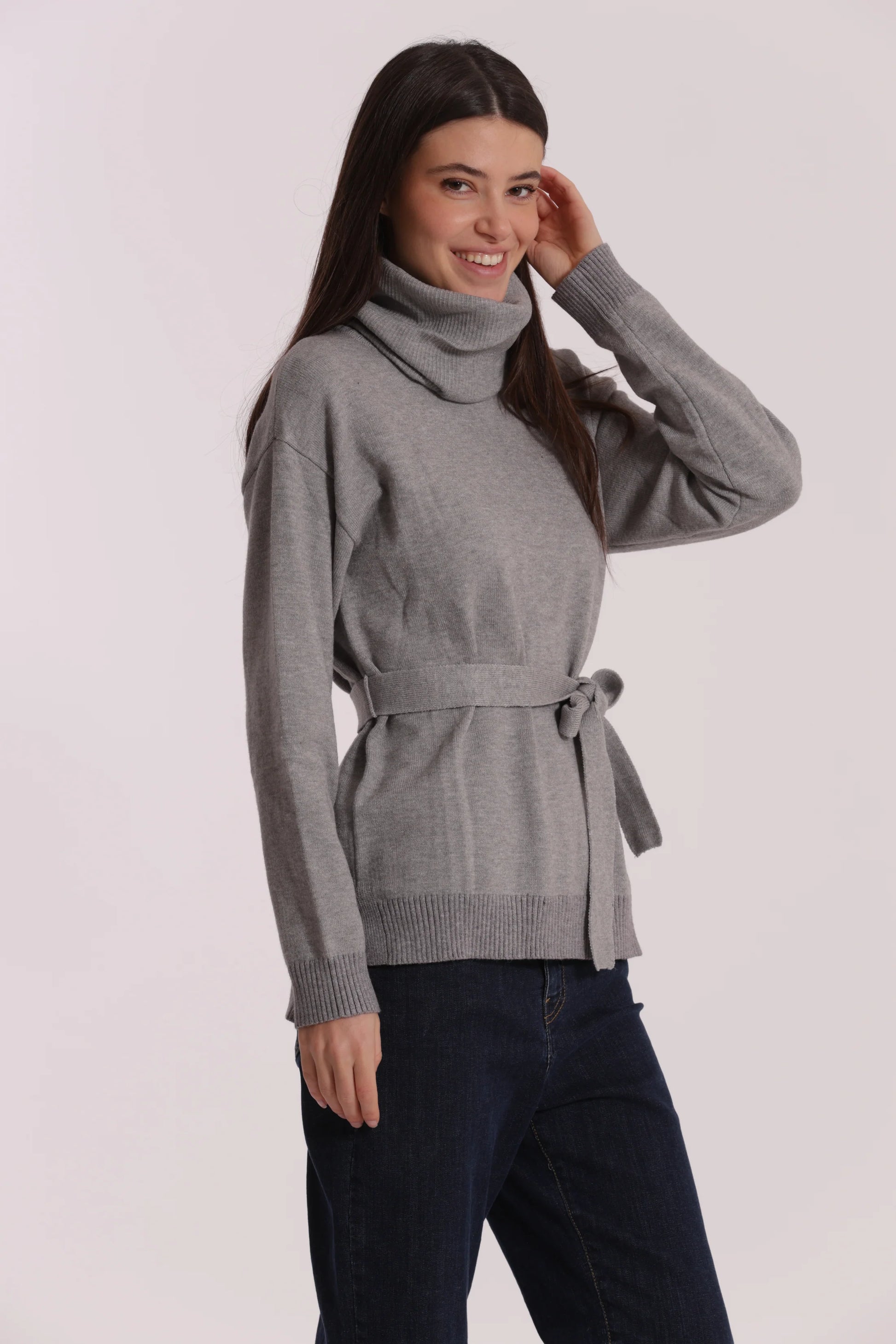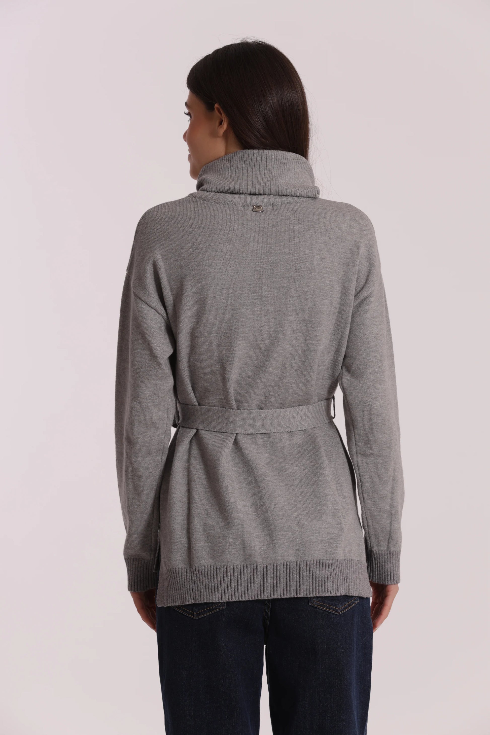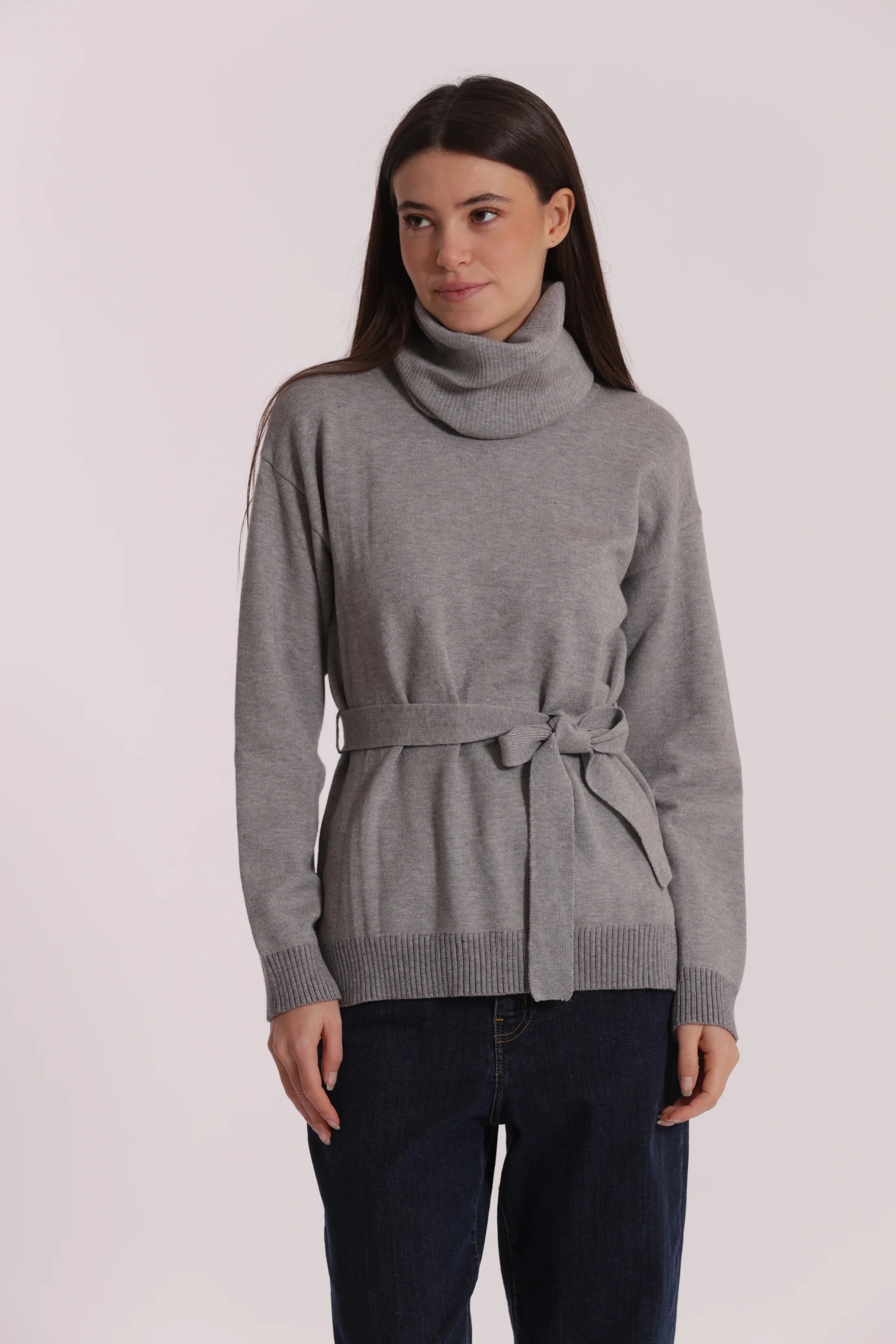 Camisola de malha Mimi Mua com gola alta removível, oferecendo versatilidade no estilo. Apresenta presilhas e cinto no mesmo tecido, permitindo ajustar a silhueta conforme desejado. Um modelo elegante e contemporâneo, ideal para combinar com calças ou saias, criando looks sofisticados e modernos.