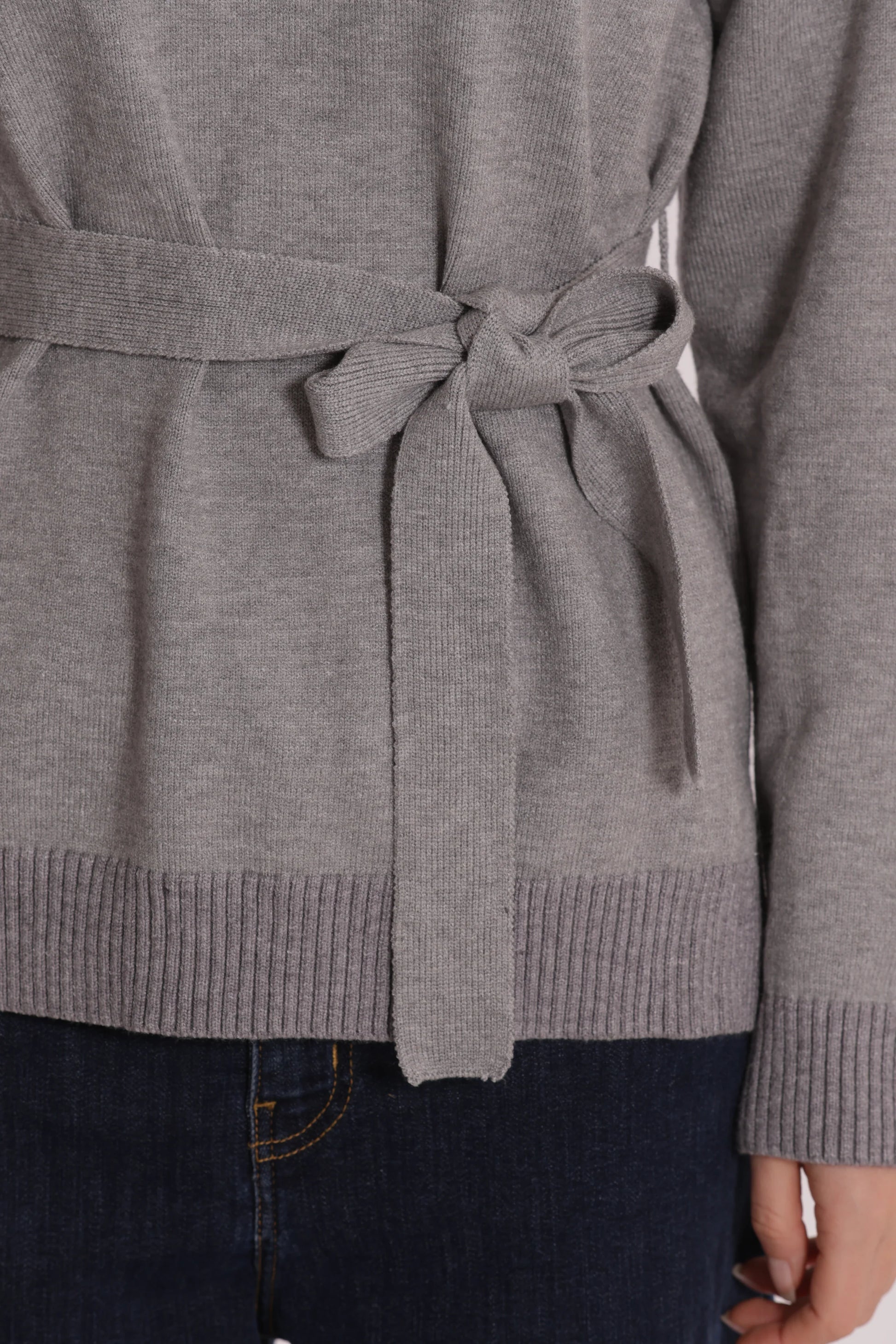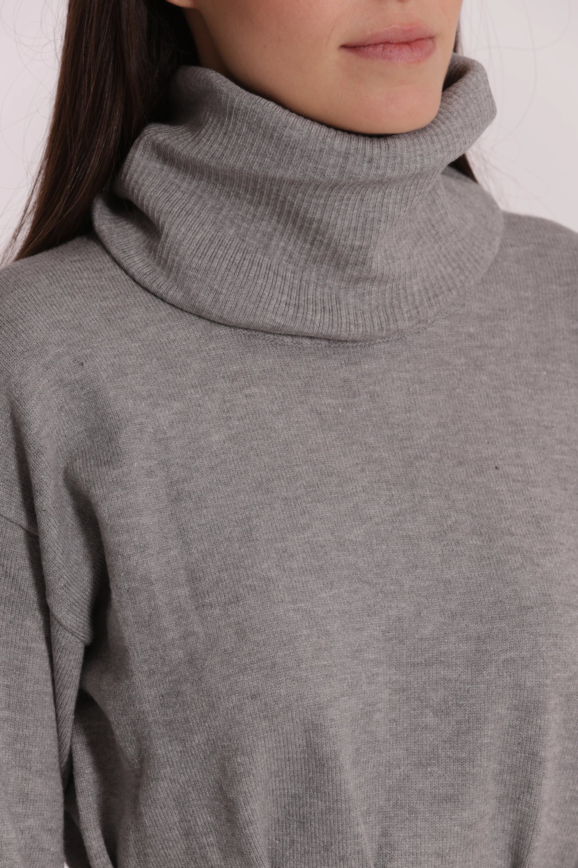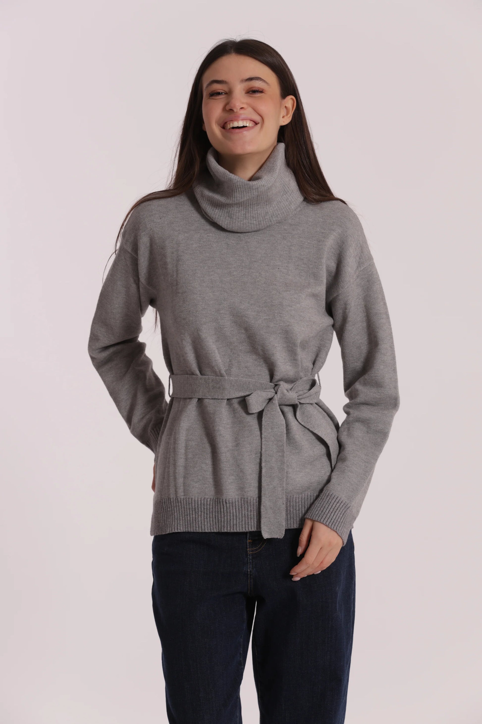 Camisola de malha Mimi Mua com gola alta removível, oferecendo versatilidade no estilo. Apresenta presilhas e cinto no mesmo tecido, permitindo ajustar a silhueta conforme desejado. Um modelo elegante e contemporâneo, ideal para combinar com calças ou saias, criando looks sofisticados e modernos.