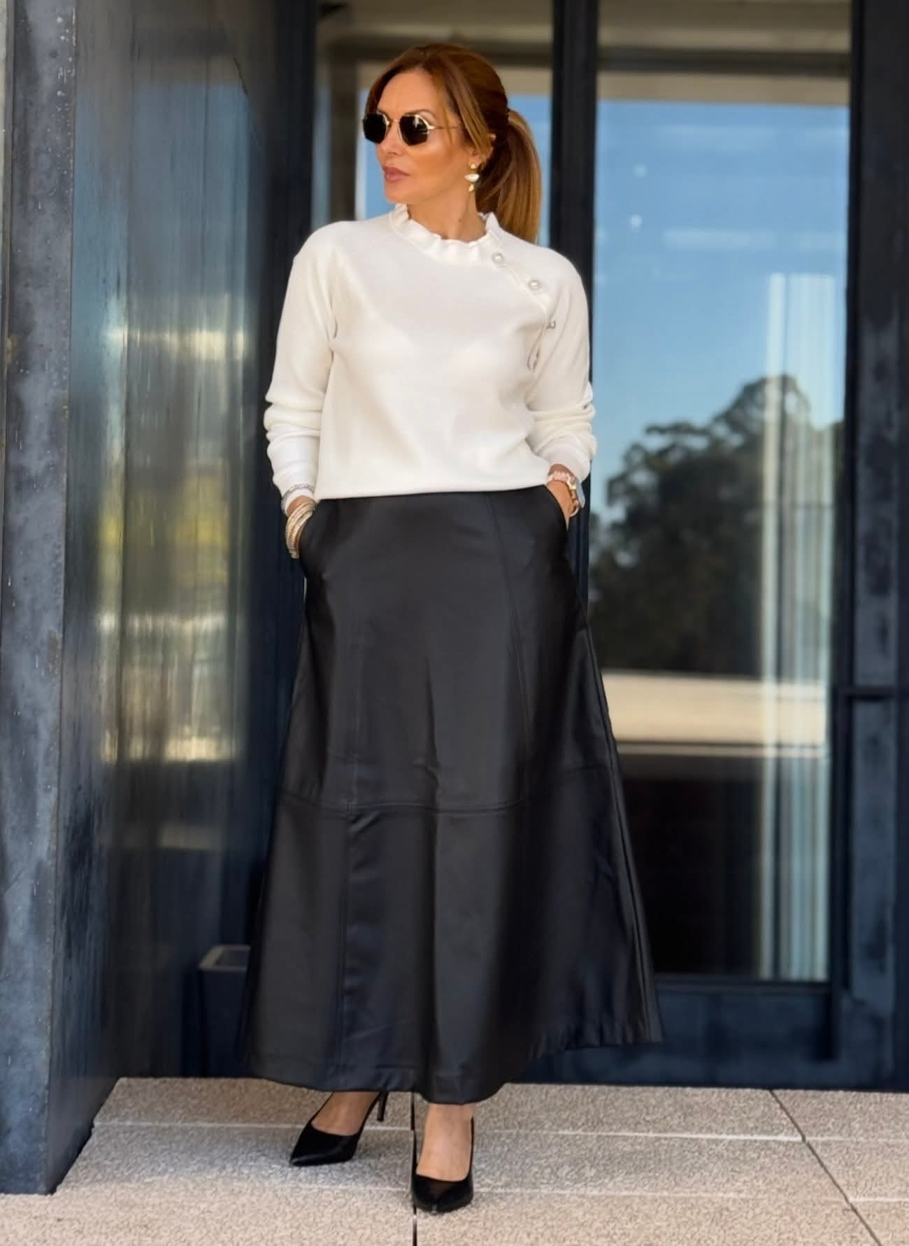 Camisola Mimi Mua em malha canelada, de manga comprida e decote redondo. Apresenta detalhe elegante de botões com pedras brilhantes que seguem até ao ombro, conferindo um toque sofisticado e moderno à peça. Ideal para elevar looks do dia a dia com brilho subtil.