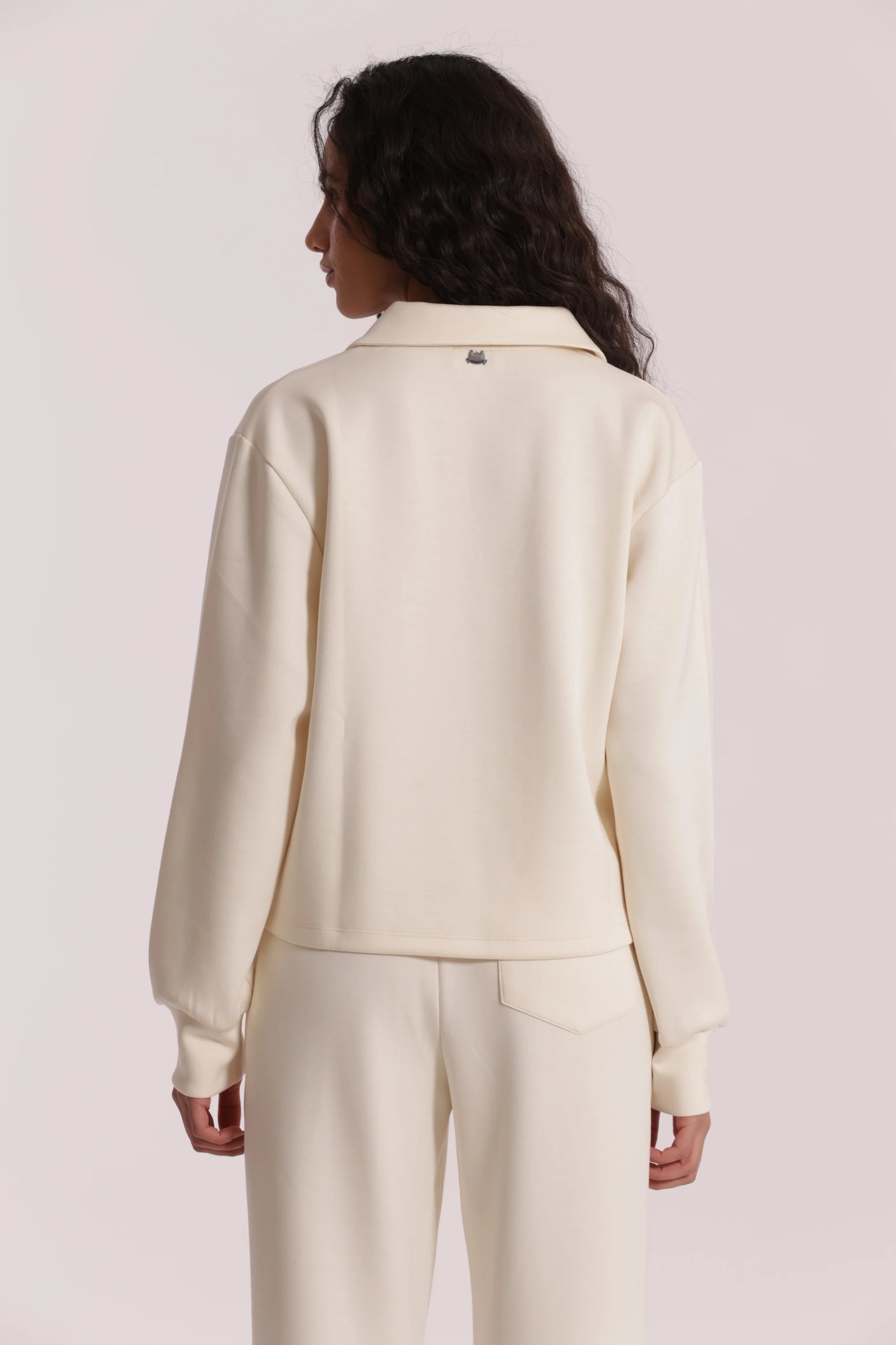 Sweat Mimi Mua em tecido suave com decote em V, adornada com strass aplicado no peito do lado esquerdo, conferindo brilho discreto e elegante. Pode ser combinada com as calças do mesmo tecido para criar um conjunto de fato de treino completo e estiloso, perfeito para looks confortáveis e modernos.