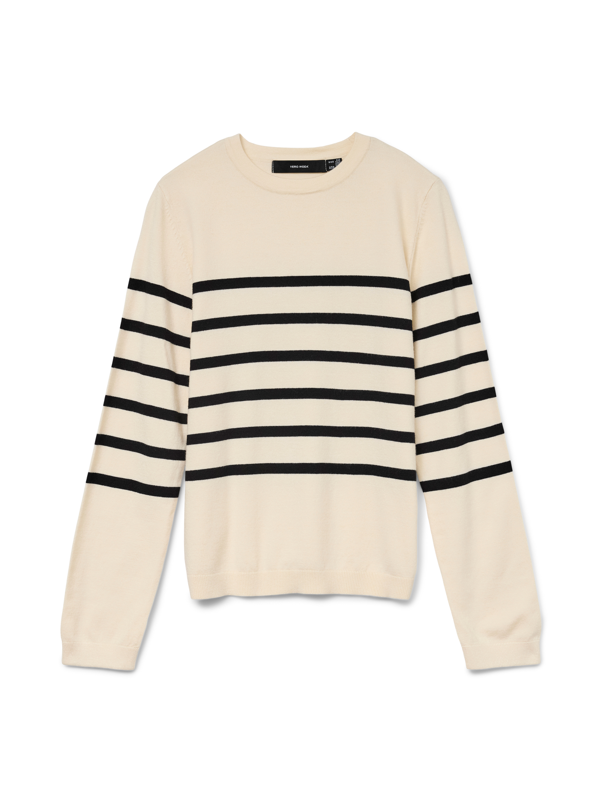 Camisola de malha Vero Moda com decote redondo e manga comprida, apresentada com estampado de riscas horizontais em contraste que acrescenta um toque moderno e versátil. Uma peça confortável e fácil de combinar, perfeita para looks casuais e descontraídos.