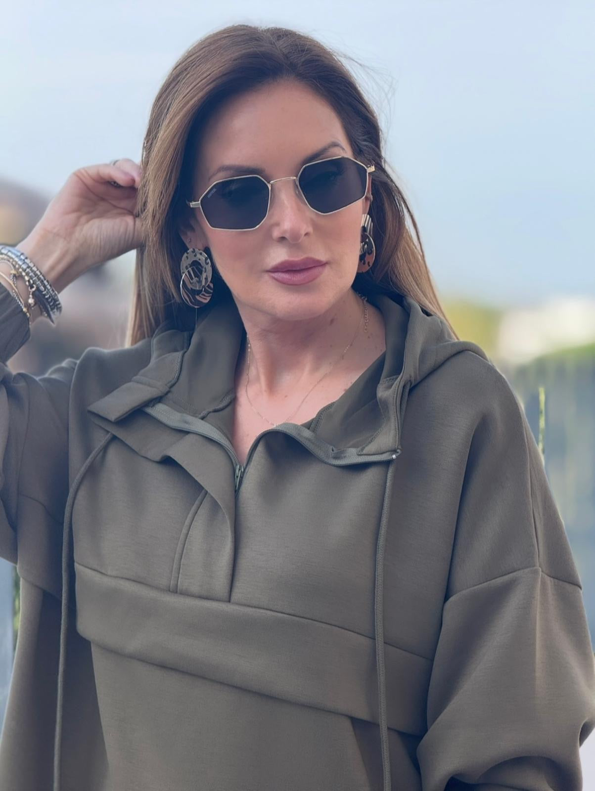 Sweat Ysabel Mora com capuz, confecionada em tecido macio e leve que proporciona conforto durante todo o dia. O design fluido e o capuz ajustável garantem um ajuste perfeito e um visual descontraído. Pode combinar com a calça do conjunto ou outras peças para um look moderno e confortável.