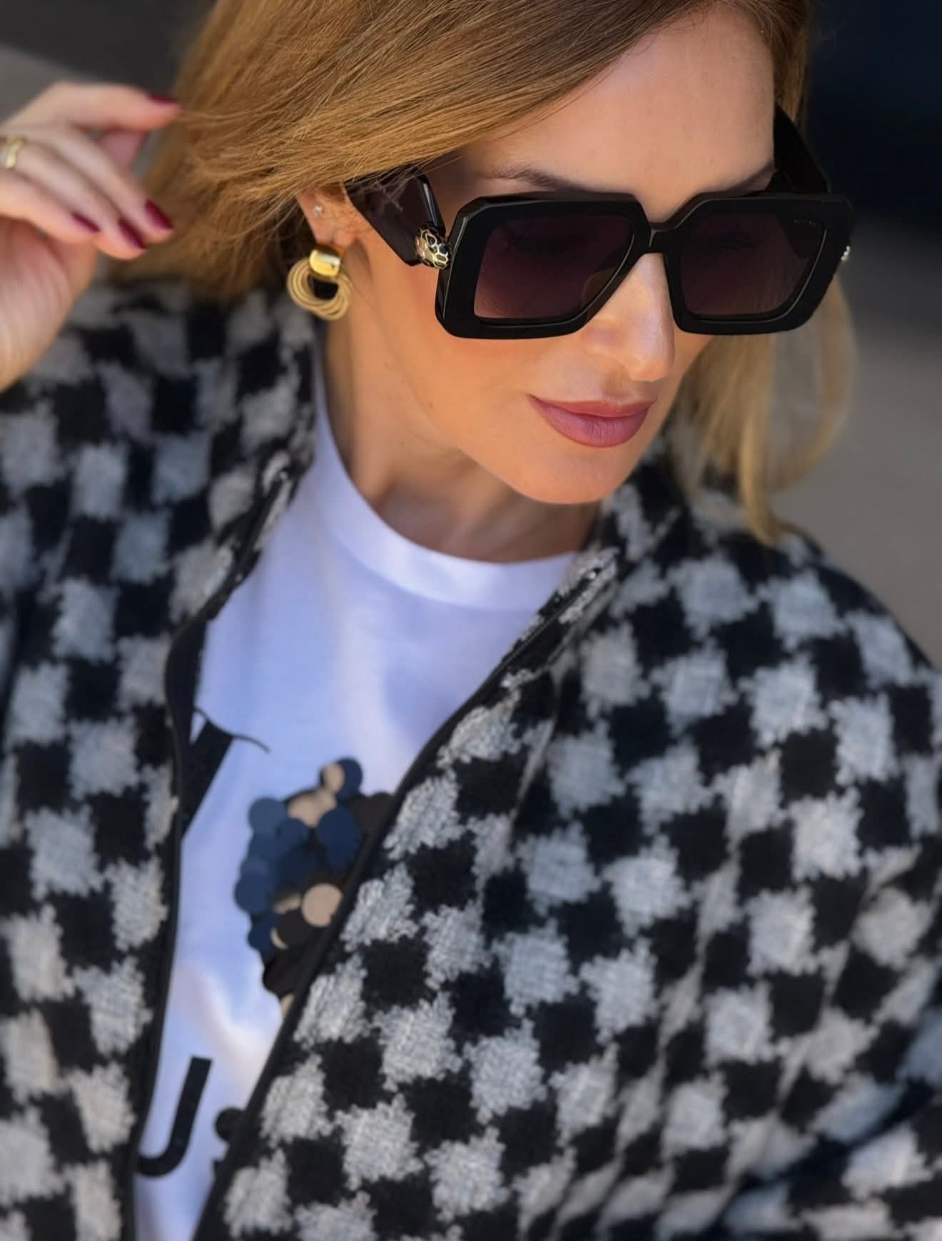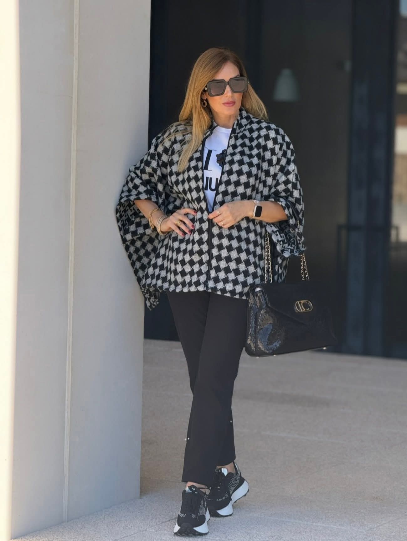 Capa de malha Fé com elegante estampado pied de poule em tamanho grande, perfeita para criar coordenados sofisticados e modernos. Apresenta fecho de zíper frontal, garantindo praticidade e conforto. Uma peça versátil que combina facilmente com diferentes looks de outono e inverno.