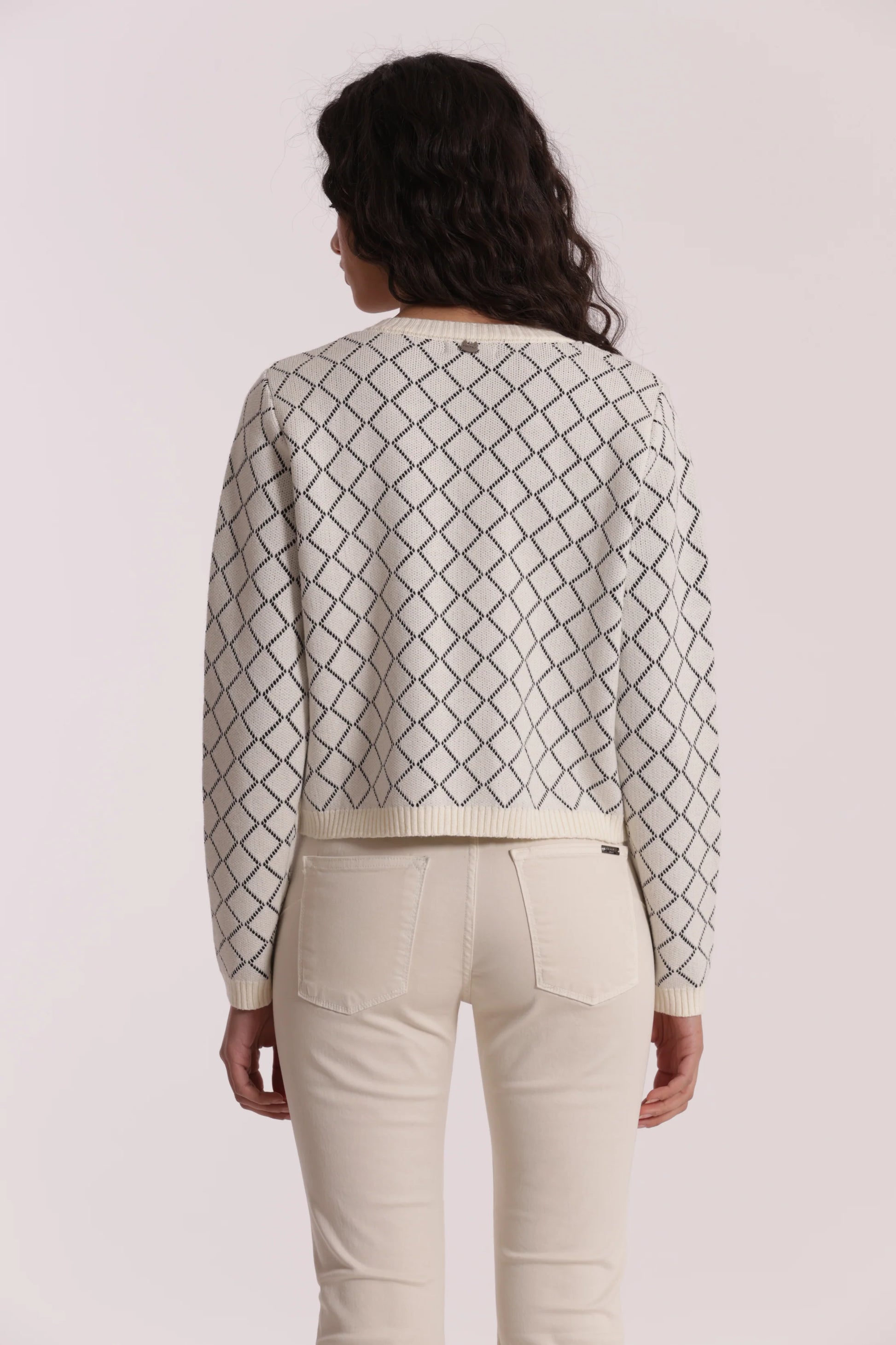 Cardigan de malha Mimi Mua com losangos desenhados em perfurações que acrescentam textura e sofisticação ao design. Fecho frontal com botões delicadamente ornamentados com pérola e dois bolsos de efeito que reforçam o charme da peça. Um modelo elegante e versátil para complementar looks casuais ou mais formais.