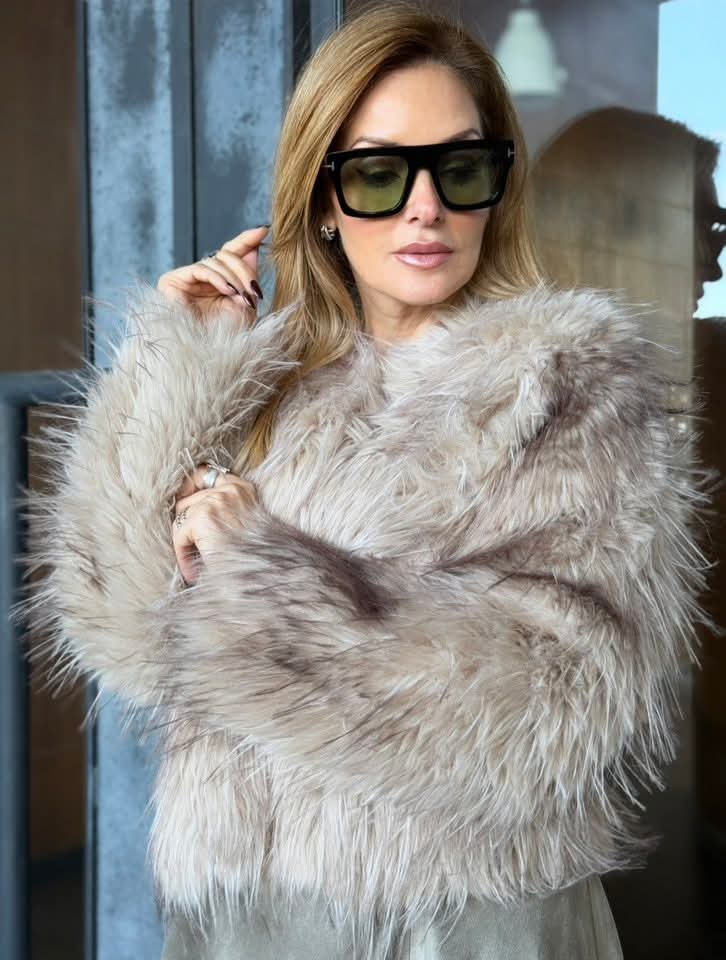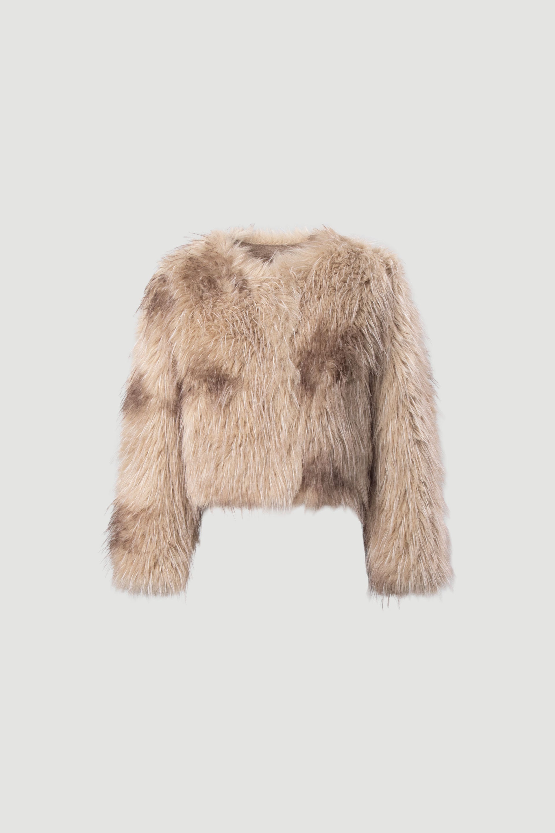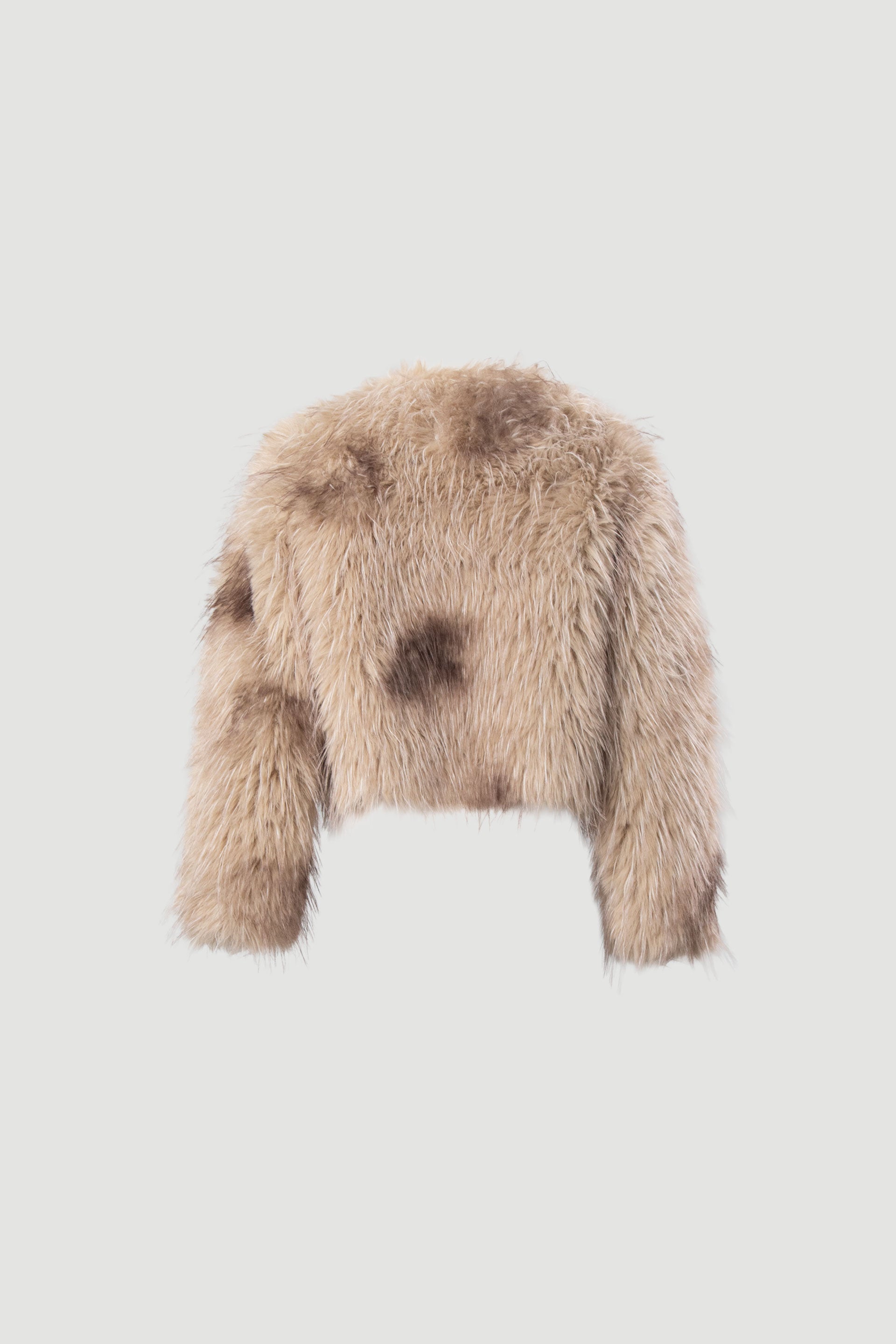 Casaco curto Ferrache em pelo sintético, com efeito visual manchado em tons naturais que acrescenta personalidade ao look. O corte reto e o comprimento curto garantem uma silhueta moderna e equilibrada. O fecho com botão de pressão assegura praticidade e um acabamento discreto.