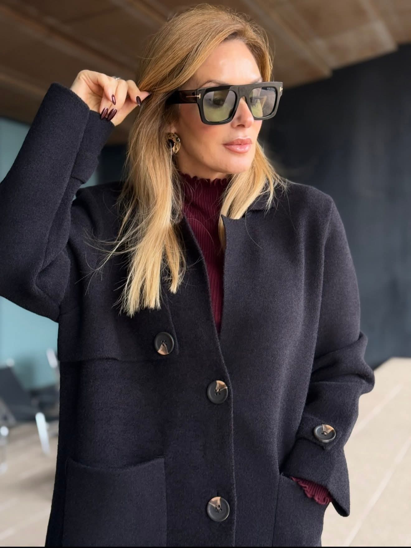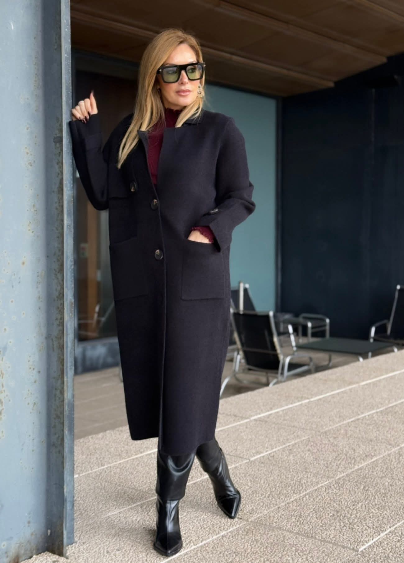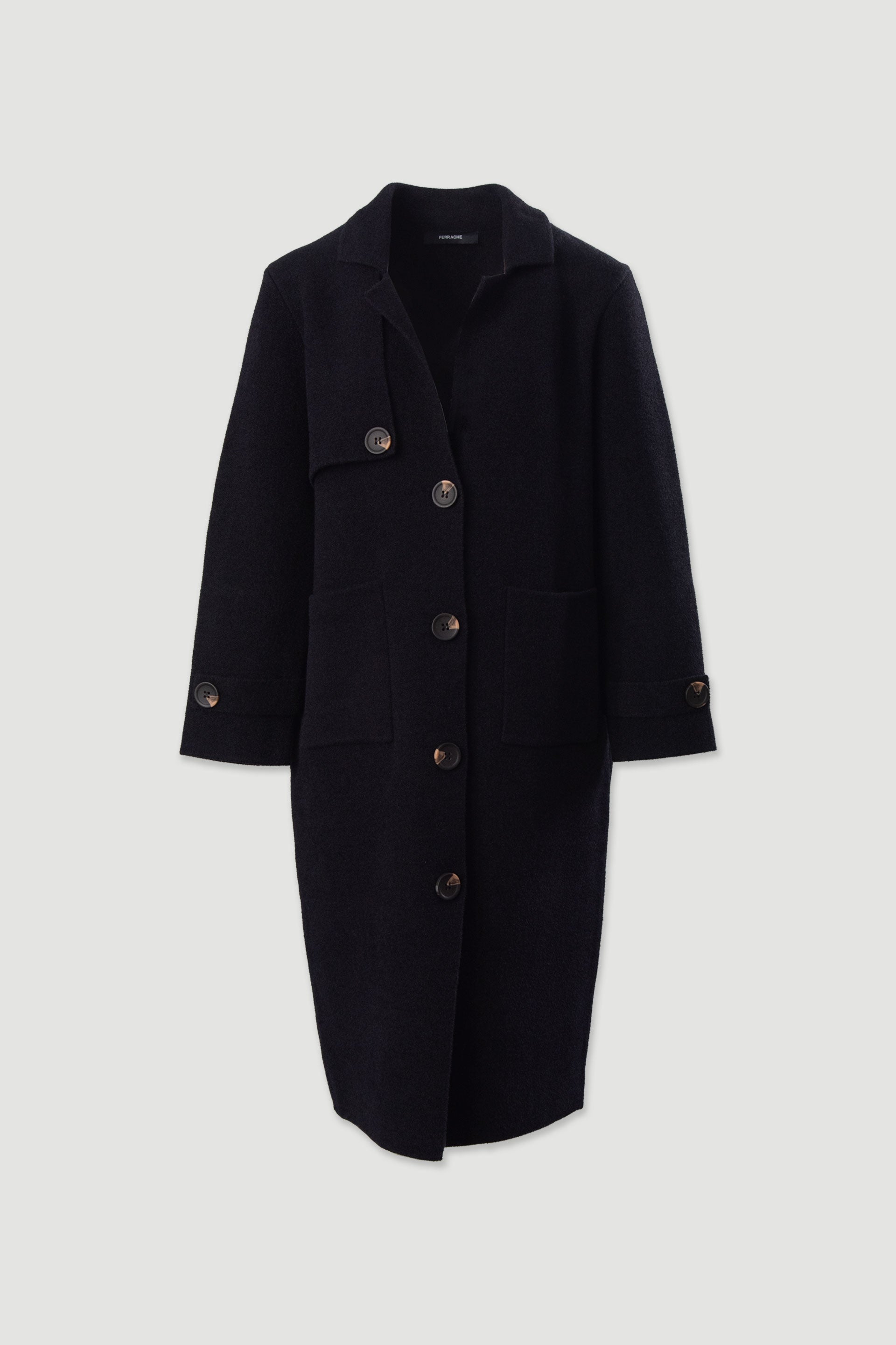 Casaco de malha comprido da Ferrache com um design elegante e intemporal. A gola clássica confere sofisticação ao modelo, enquanto o fecho frontal com botões de destaque acrescenta personalidade e detalhe. Os bolsos frontais garantem funcionalidade, complementados por abas no peito e nos punhos que reforçam o carácter estruturado da peça. Ideal para usar como sobreposição em looks de meia-estação ou em dias mais frios, combinando conforto e estilo.