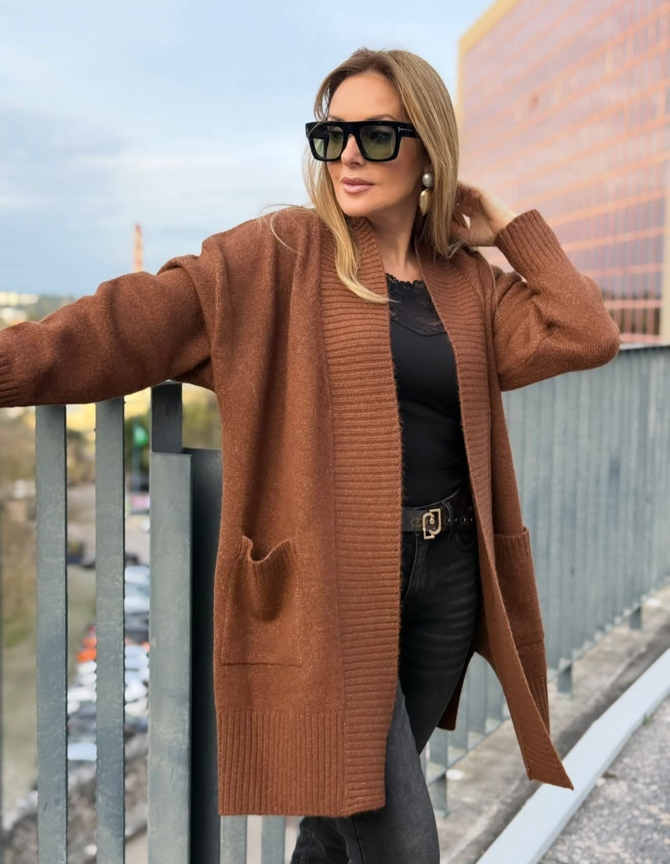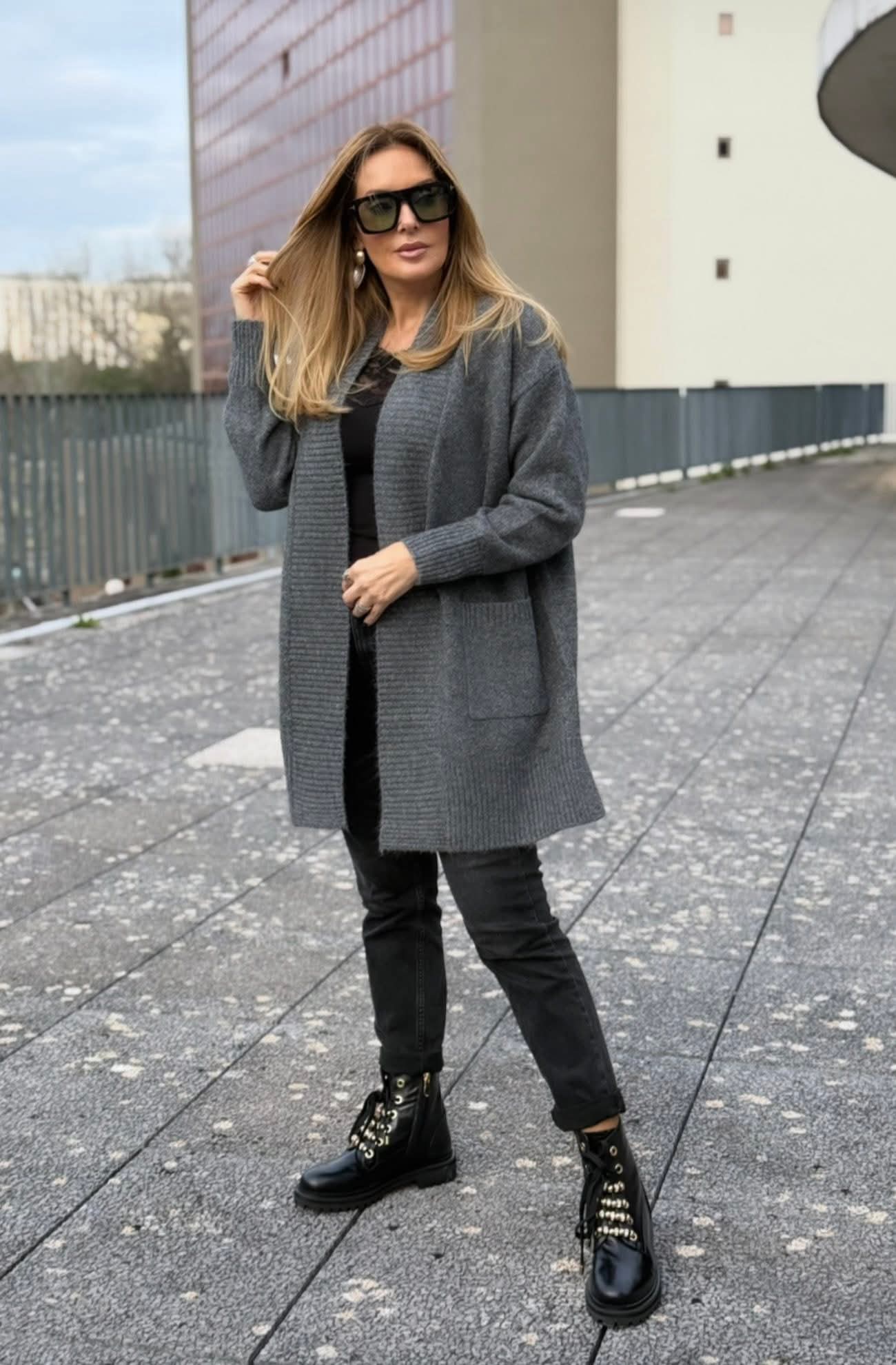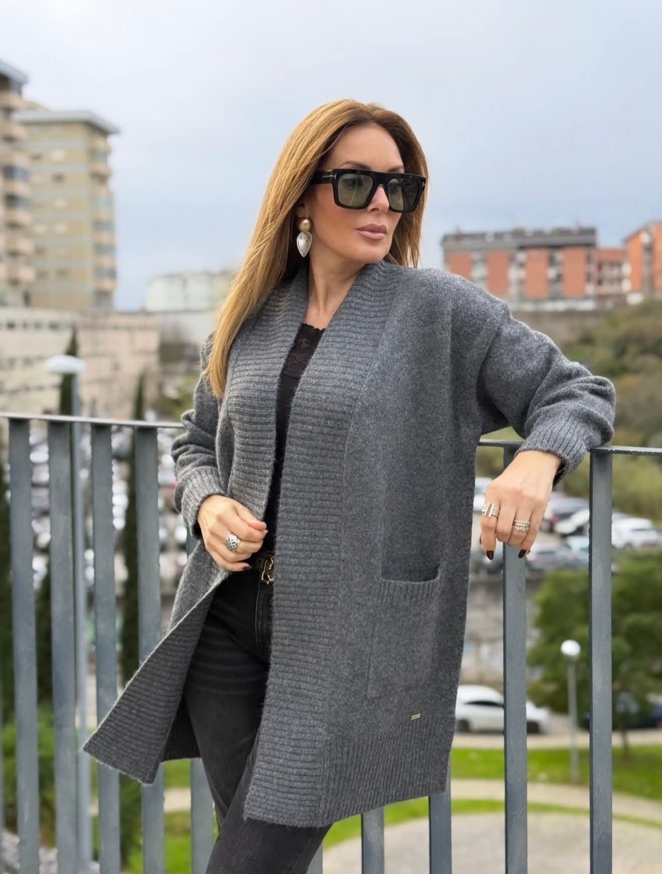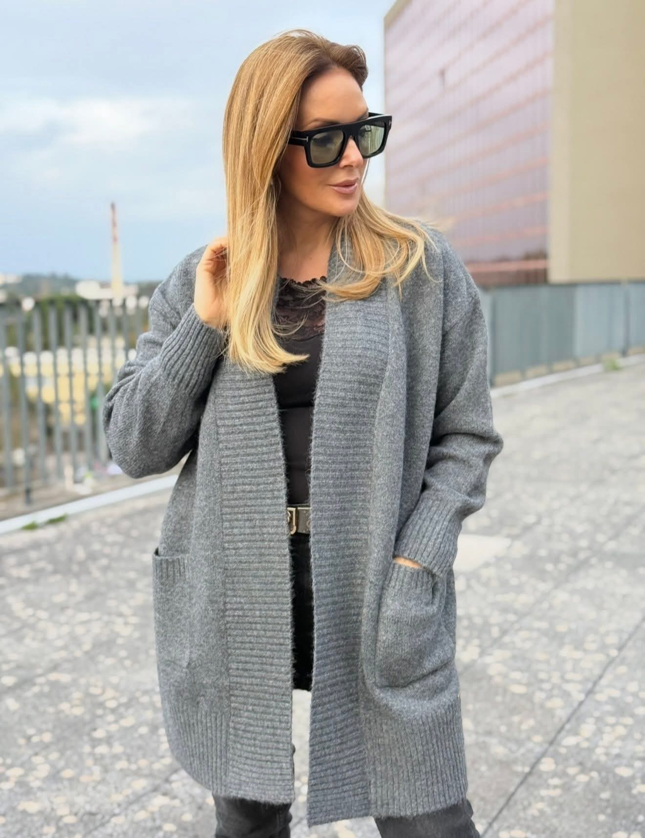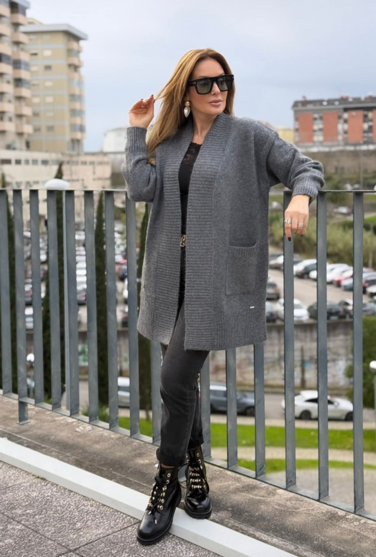 Casaco de malha oversized da Ferrache, de corte aberto e silhueta fluida, ideal para sobreposição em looks casuais ou urbanos. A malha canelada na frente, gola e punhos acrescenta textura e detalhe subtil, enquanto os bolsos frontais oferecem funcionalidade sem comprometer o design minimalista. O comprimento médio garante versatilidade, tornando-o uma peça-chave para coordenados confortáveis e contemporâneos.