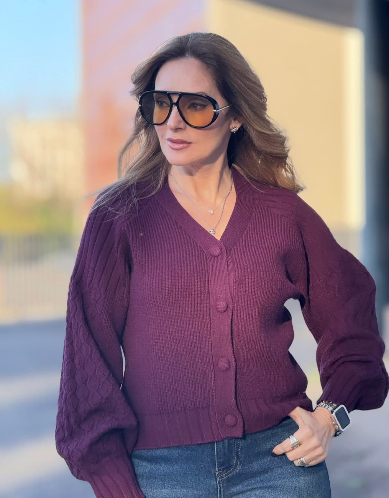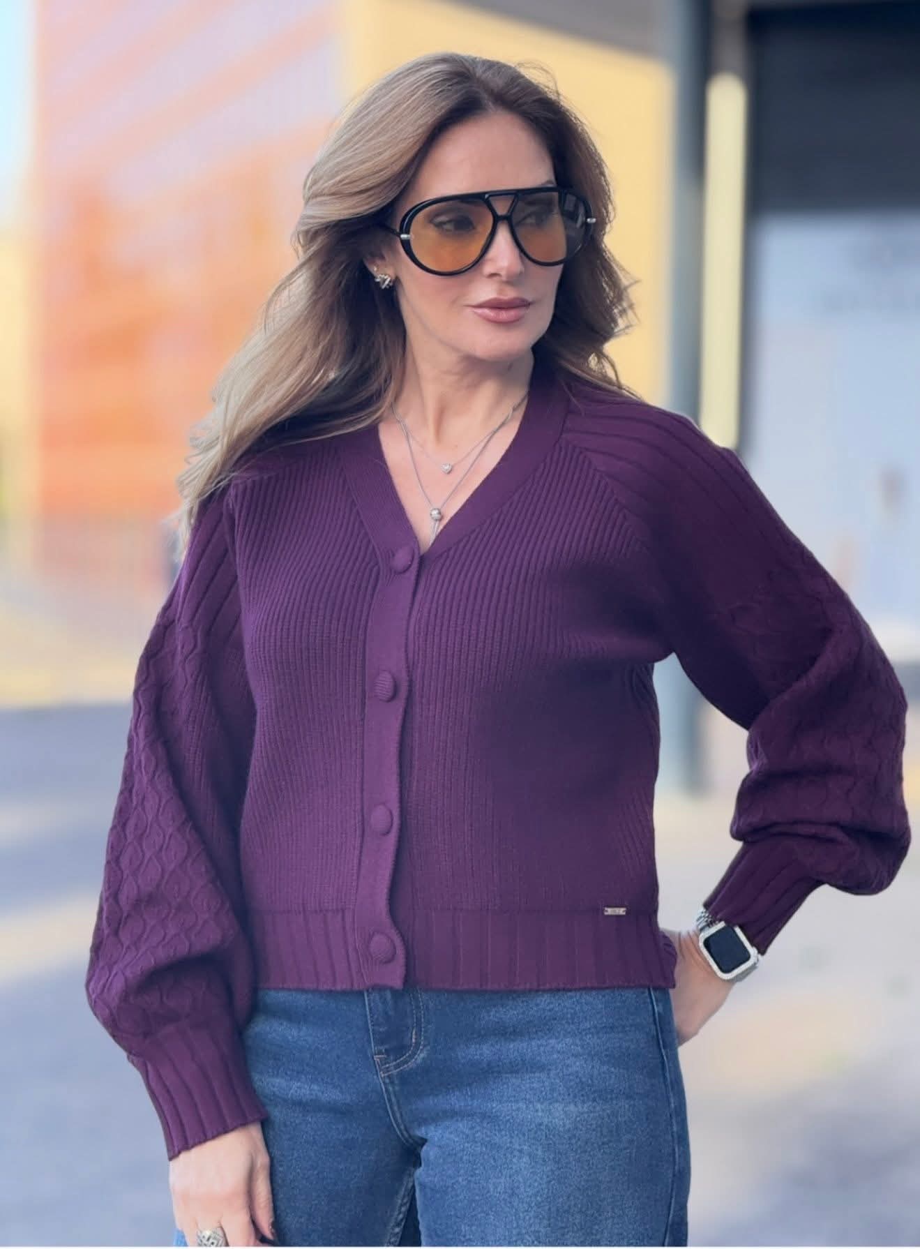 Casaco de malha Ferrache de corte curto, produzido em malha canelada com detalhe em ponto trabalhado nas mangas. Apresenta decote em “V”, fecho frontal com botões forrados e acabamentos canelados nos punhos e bainha. Uma peça elegante e confortável para complementar looks do dia a dia.