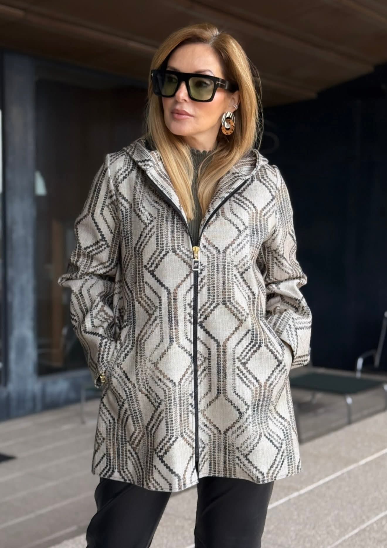 Casaco Ferrache confecionado em tecido com padrão geométrico, combinando estilo contemporâneo e conforto. Apresenta capuz integrado e fecho frontal, elementos que elevam a funcionalidade da peça. O corte direito oferece liberdade de movimento e um visual equilibrado, ideal para looks modernos do dia a dia.