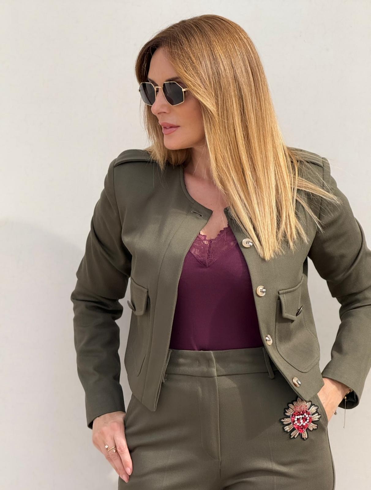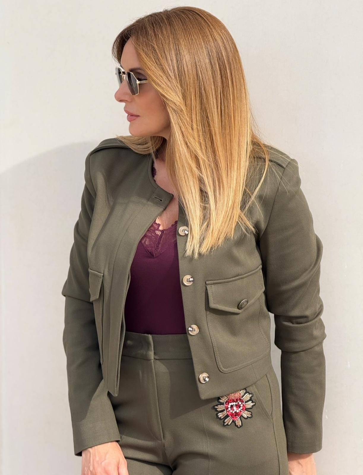 Casaco Fly Girl estilo militar, com pormenores sofisticados que realçam a silhueta. Apresenta botões dourados, bolsos laterais práticos e divisas nos ombros que reforçam a inspiração utilitária. Uma peça marcante e elegante, perfeita para coordenados modernos com personalidade.