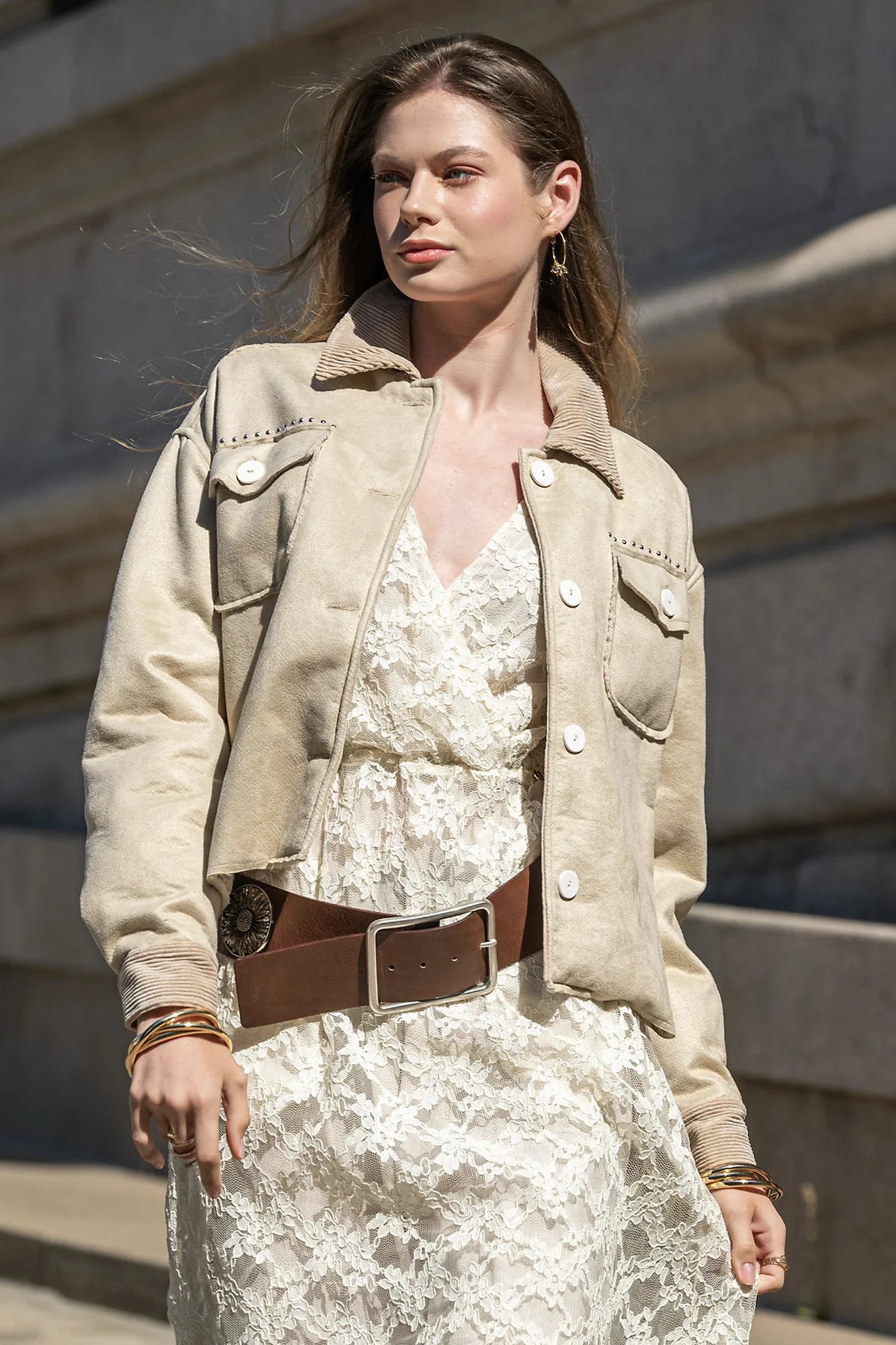 Casaco de camurça Foursoul com dois bolsos no peito e fecho de botões frontais. Possui colarinho e punhos em bombazine, que acrescentam contraste de textura e um toque moderno ao design clássico.