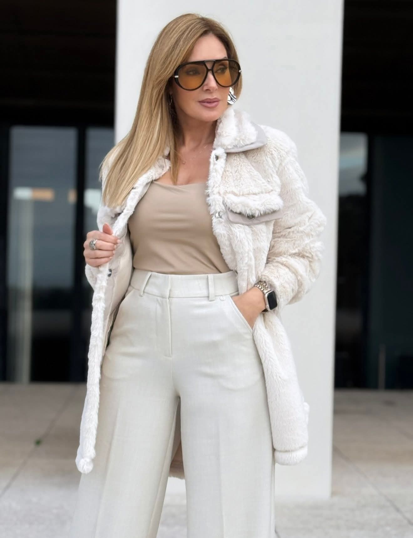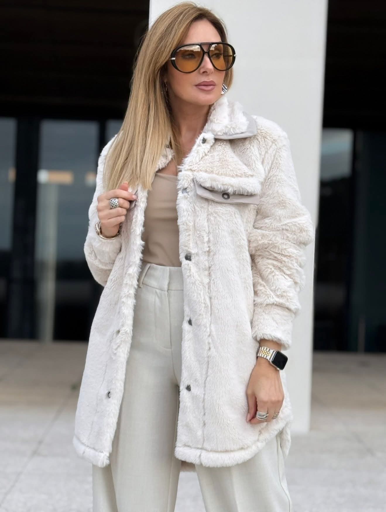 Casaco Foursoul em pelo macio, com gola de colarinho duplo que combina pelo e ecopele, criando um contraste elegante. Apresenta bolsos quadrados junto à cintura e efeito de bolsos no peito com pala dupla, também em mistura de pelo e ecopele. Uma peça moderna e sofisticada que alia conforto e estilo para os dias frios.
