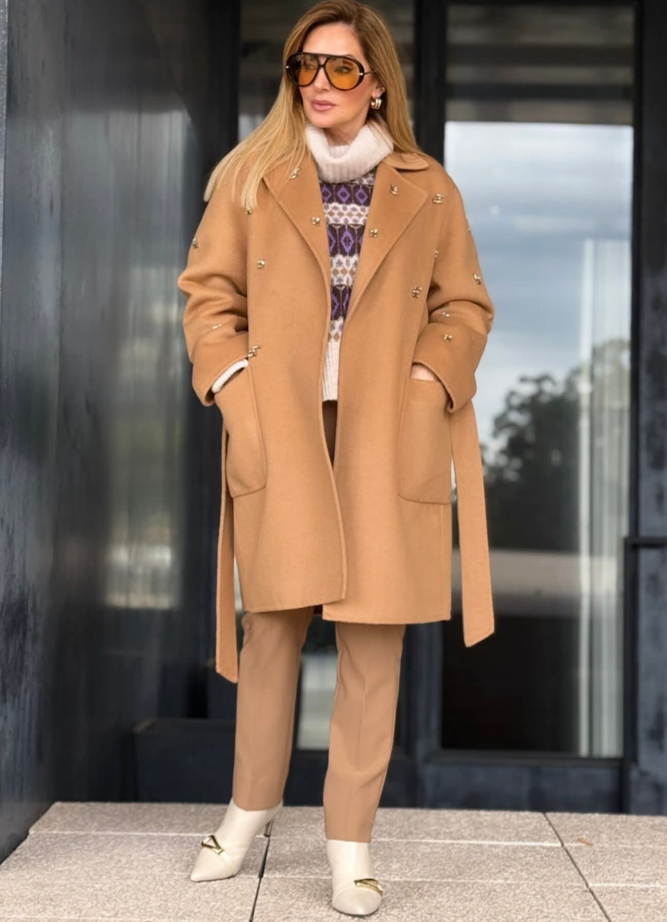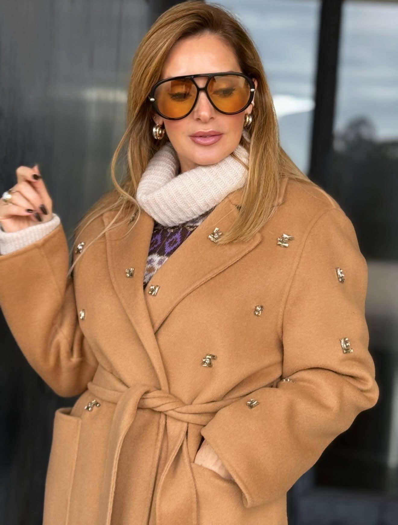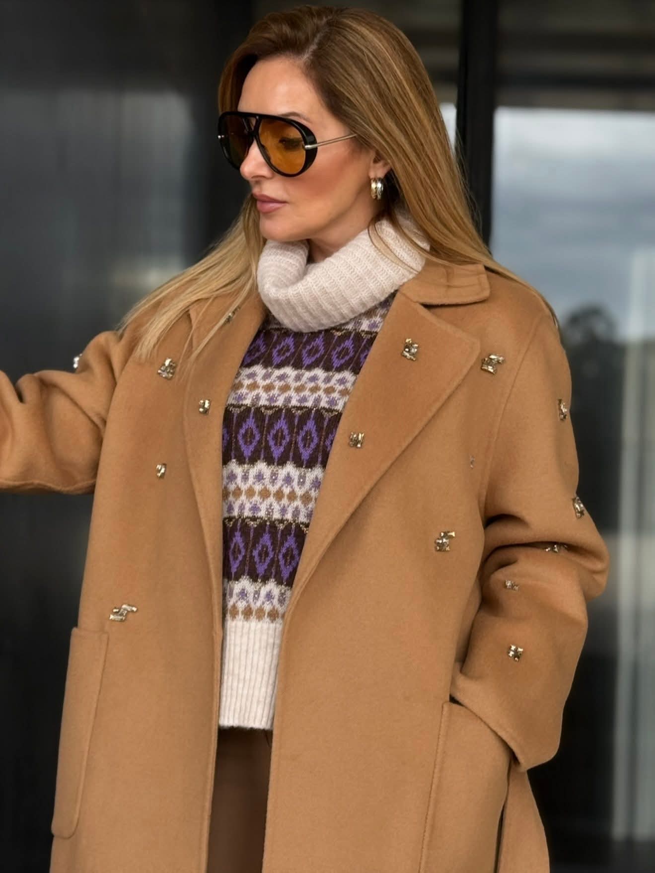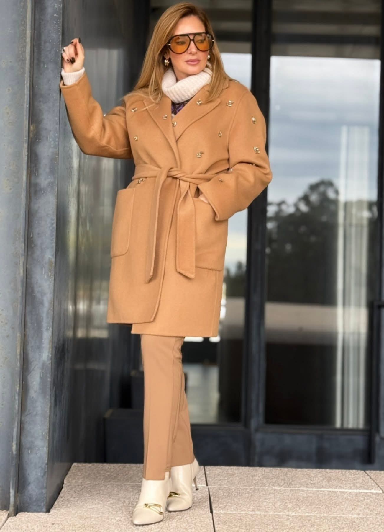 Casaco Liu Jo em fazenda, confeccionado em tecido duplo com mistura de lã, que oferece sofisticação e aconchego. Apresenta lapelas clássicas, bolsos funcionais e cinto no mesmo tecido para marcar a silhueta. Detalhes em pedras brilhantes adicionam um toque luxuoso e elegante. Uma peça versátil, perfeita para ocasiões formais ou looks urbanos refinados.