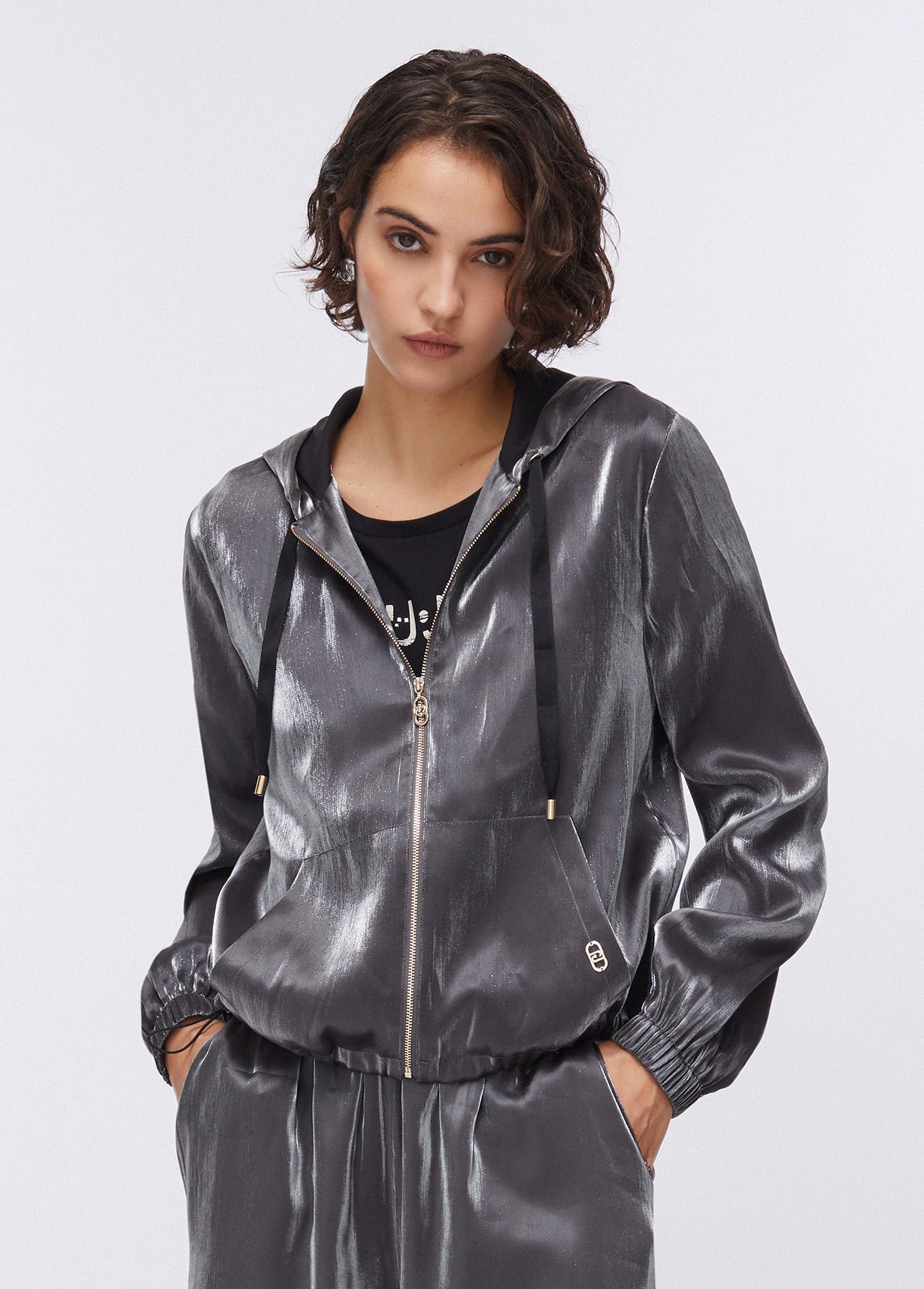 Casaco Liu Jo em tecido metálico prateado, com capuz ajustável através de atilhos para maior proteção e conforto. Bolsos laterais práticos e fecho de zíper asseguram funcionalidade no dia a dia. O cós com atilhos ajustáveis permite adaptar o casaco à silhueta, mantendo uma linha contemporânea e descontraída. Peça versátil para complementar looks urbanos com um toque luminoso.
