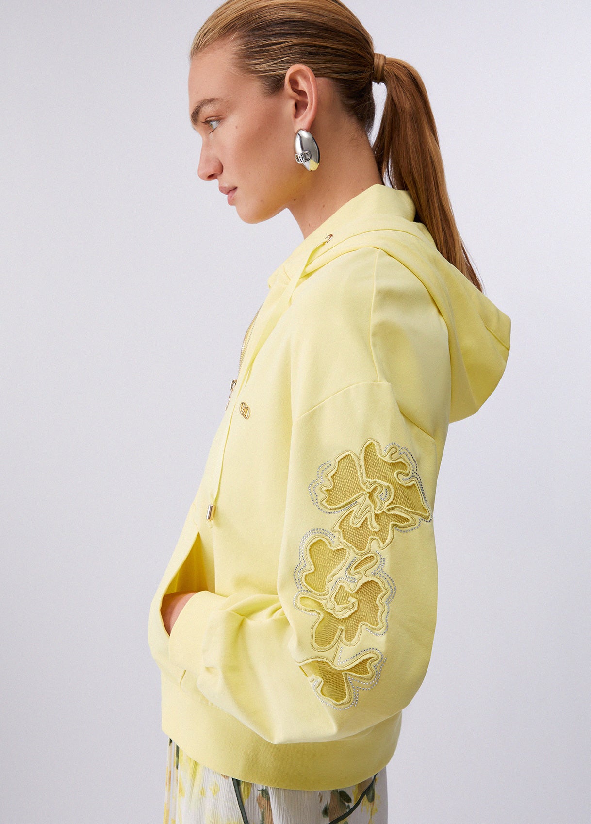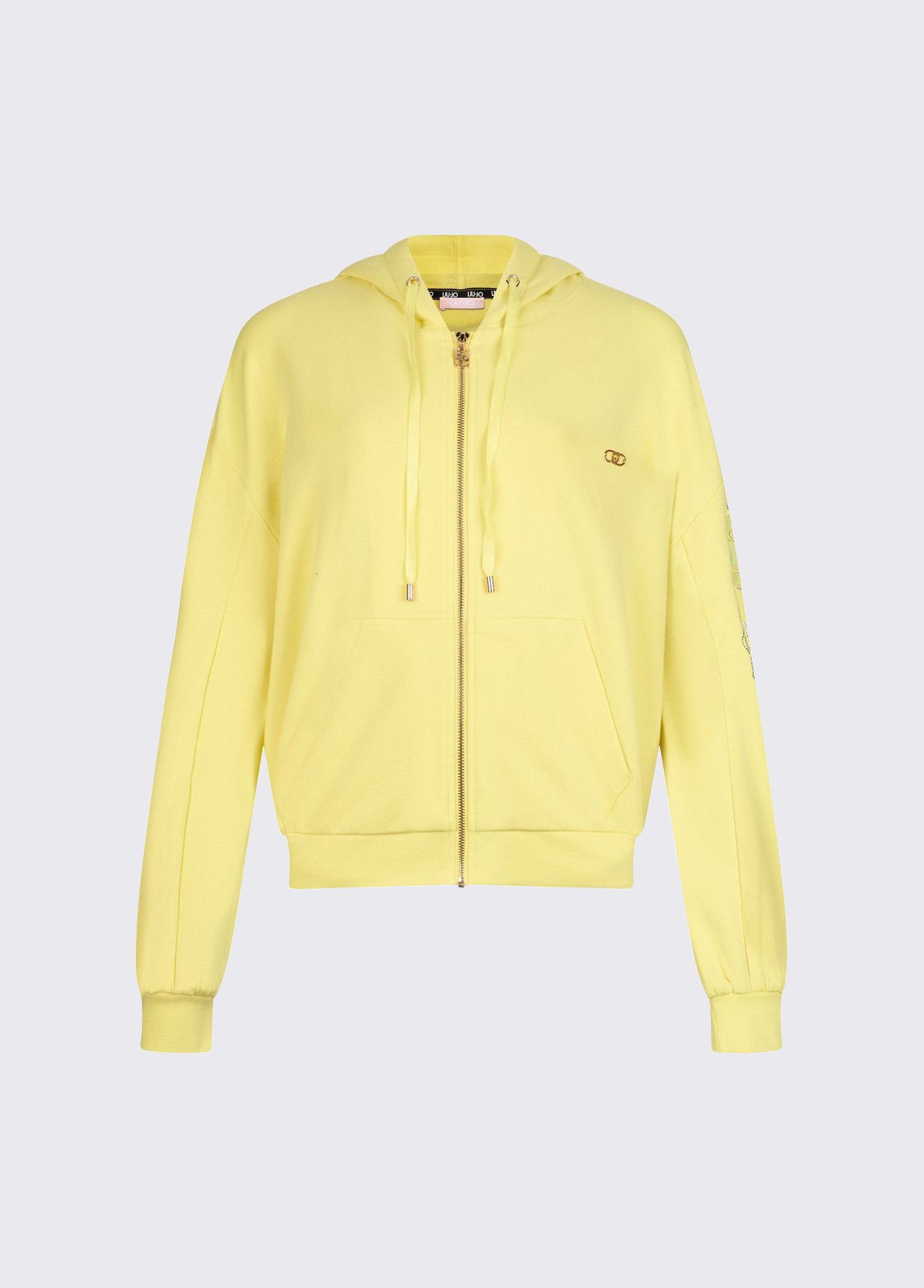 Casaco de algodão Liu Jo com inspiração fato de treino, pensado para um registo descontraído mas cuidado. O capuz com cordão e o fecho frontal de zíper garantem praticidade, enquanto os bolsos laterais acrescentam funcionalidade. O bordado floral nas mangas e o logotipo metálico no peito introduzem um detalhe distintivo, ideal para conjugar com denim, calças de malha ou as pantalonas coordenadas da marca.