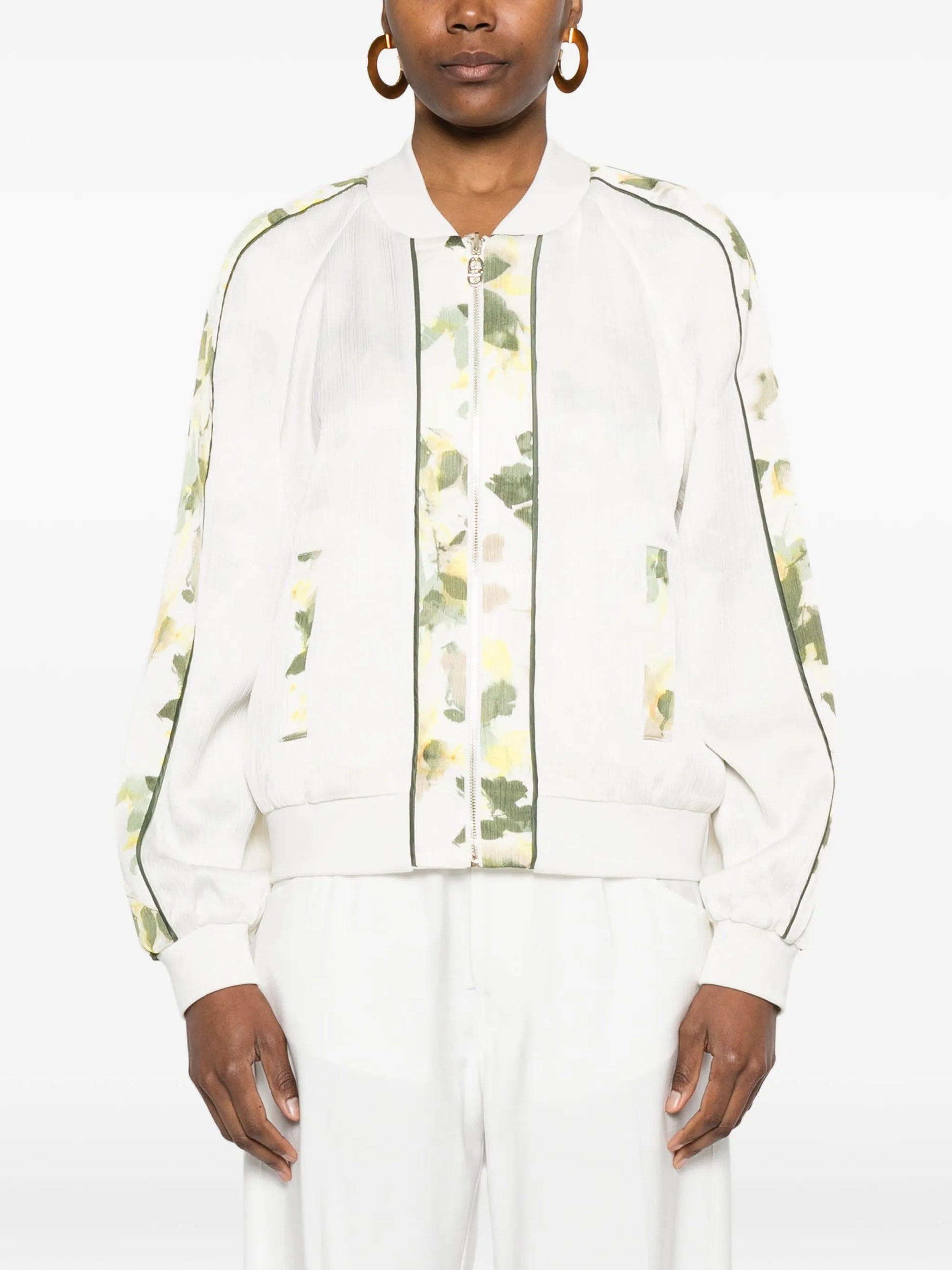 Bomber Liu Jo reversível, pensada para multiplicar opções no guarda-roupa: um lado com estampado floral e o outro branco com detalhes em estampado floral, para alternar entre um visual mais expressivo e outro mais leve. O fecho de zíper e os bolsos laterais garantem funcionalidade, enquanto os acabamentos canelados nos punhos, gola e cós mantêm a silhueta típica bomber, com conforto e estrutura. Mangas compridas completam a peça, ideal para sobrepor a malhas finas, t-shirts ou vestidos lisos.